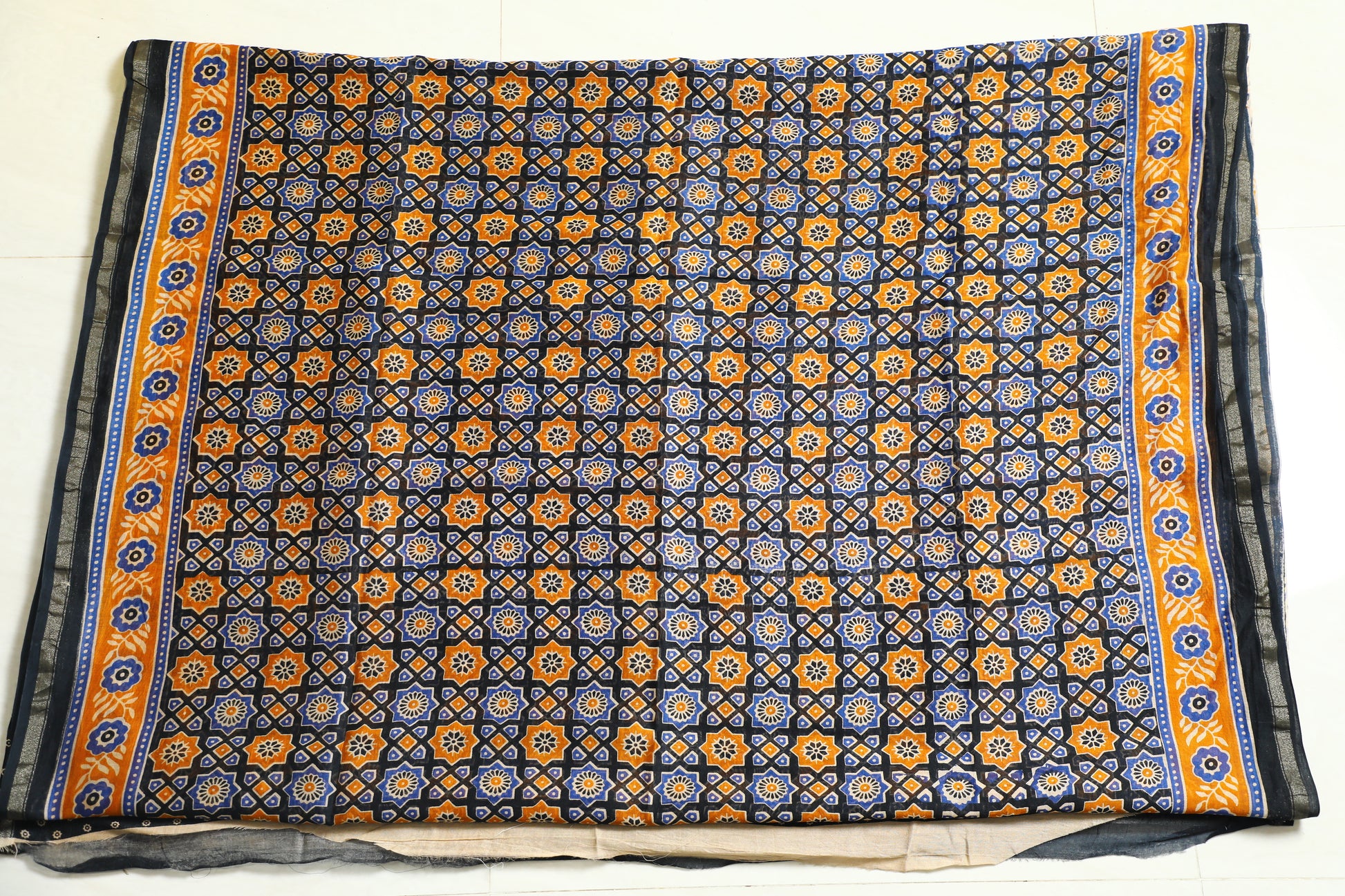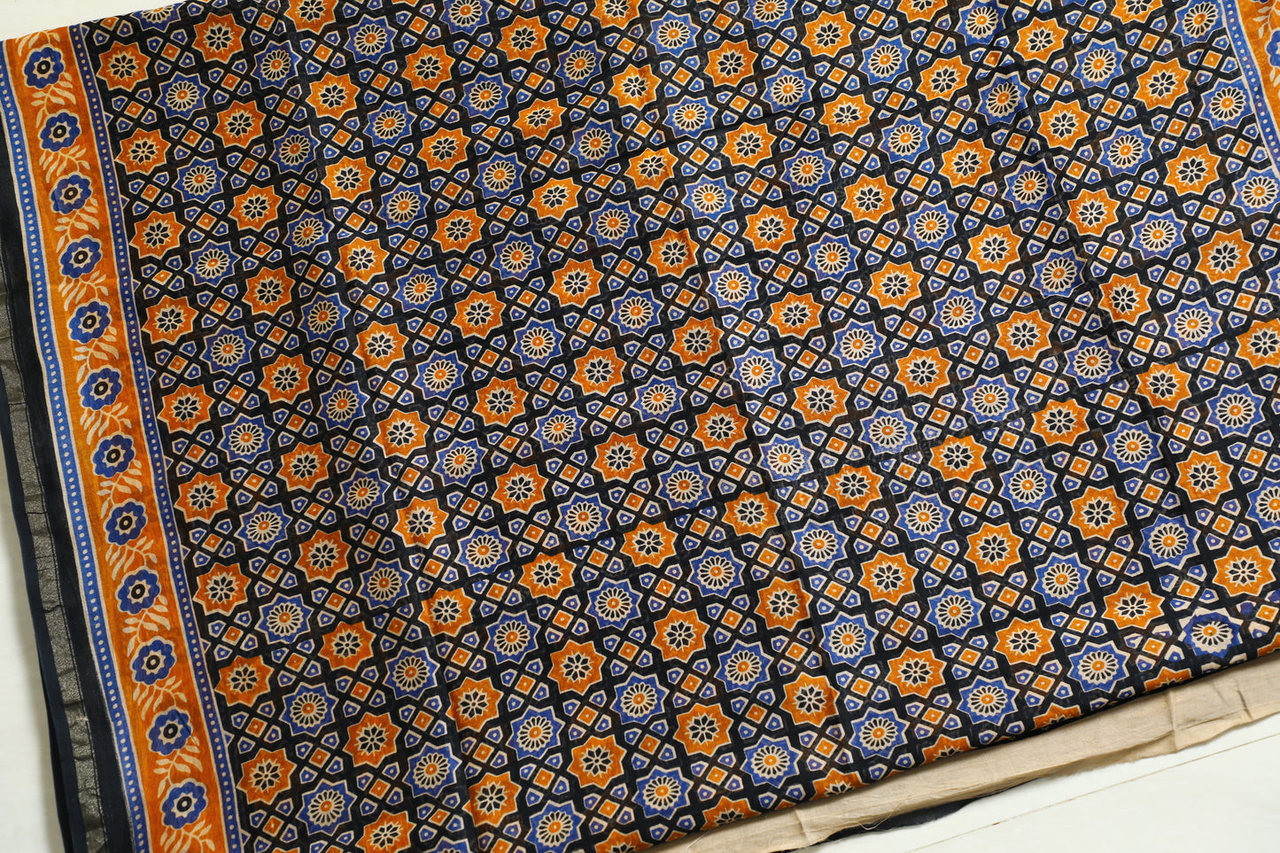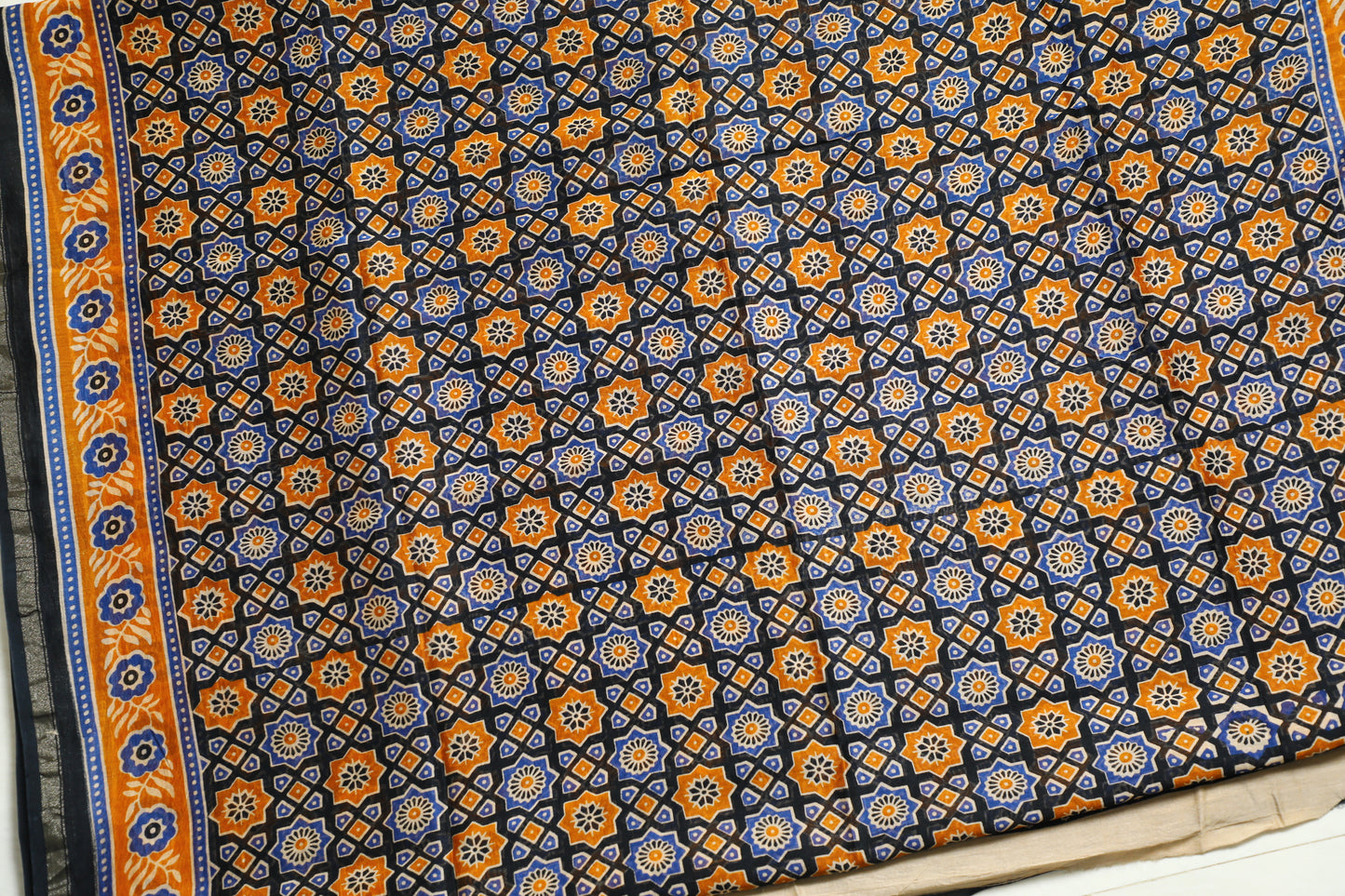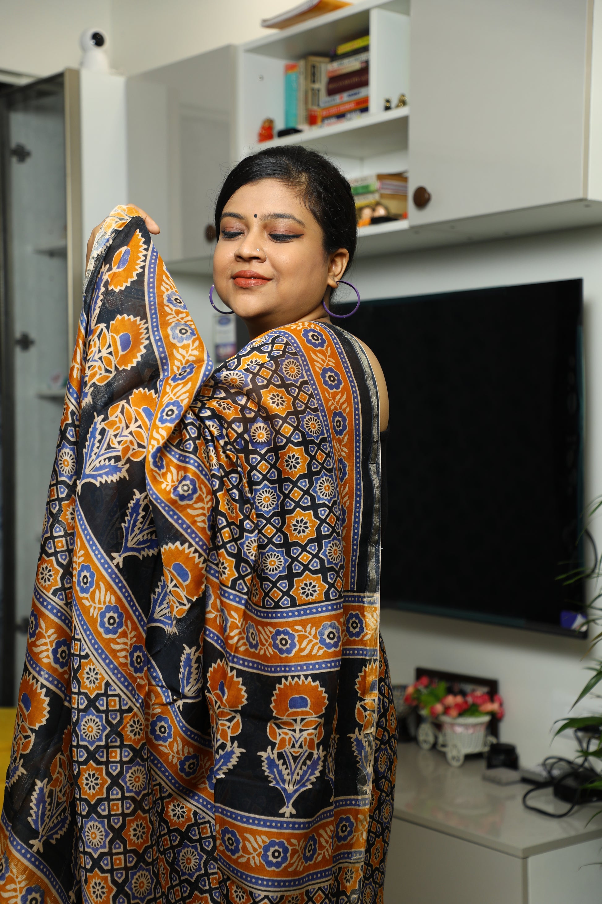The Ajrakh printed Chanderi silk saree is a fusion of two rich textile traditions. Ajrakh, a centuries-old block printing technique, is known for its intricate geometric patterns and deep, earthy colors, typically using natural dyes like indigo, madder, and black. This printing style originates from the Kutch region of Gujarat and is revered for its meticulous, handcrafted process, often involving up to 14 different stages of dyeing and printing.