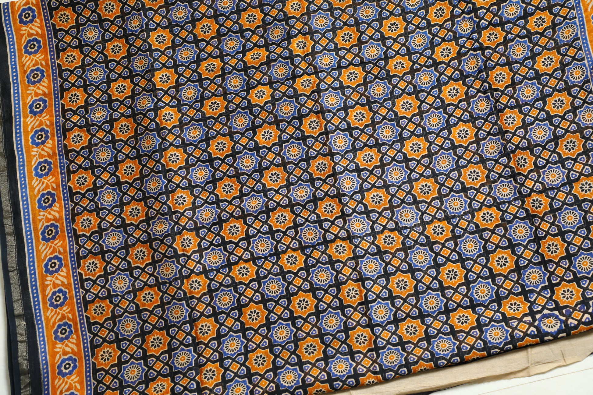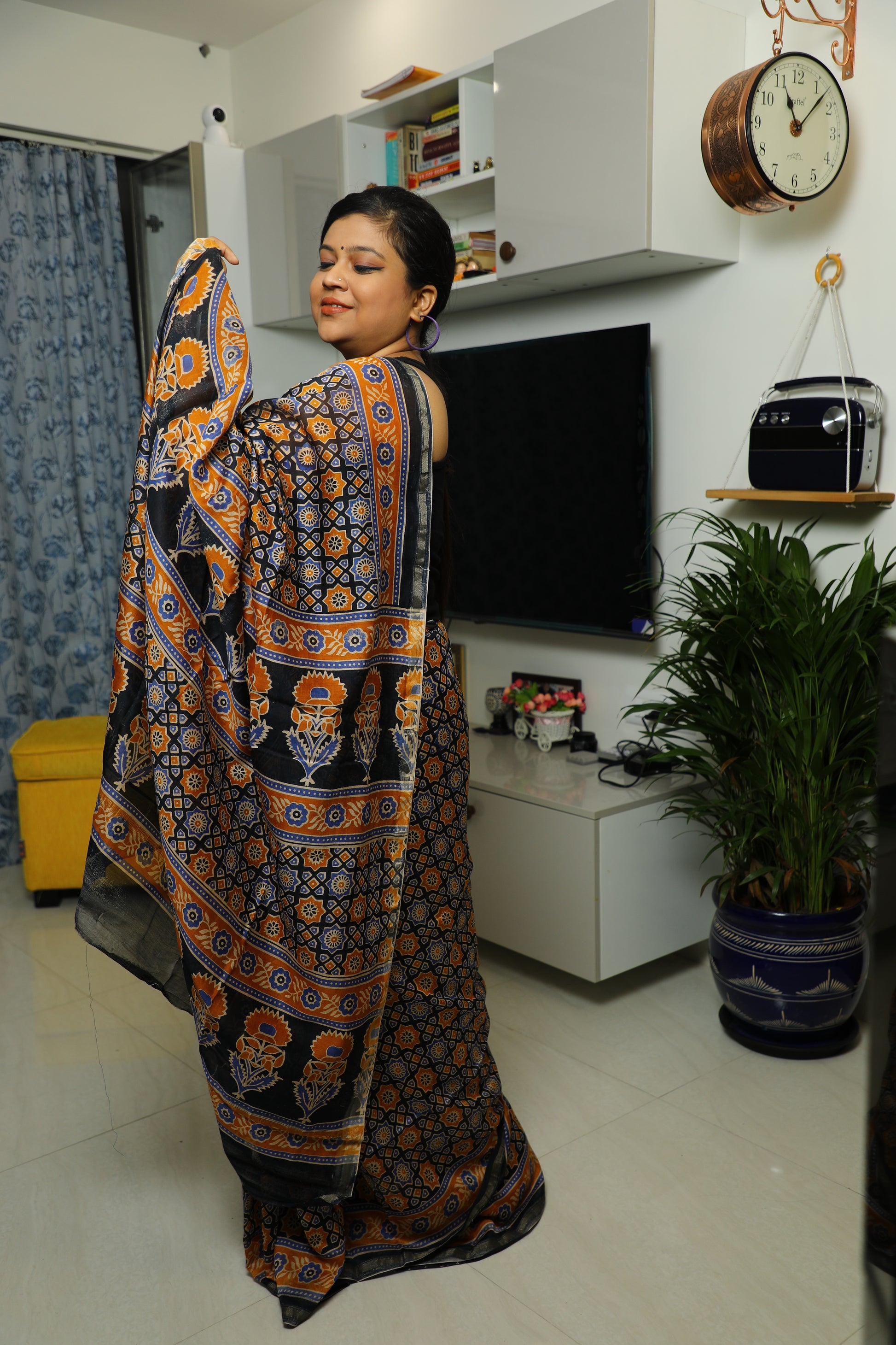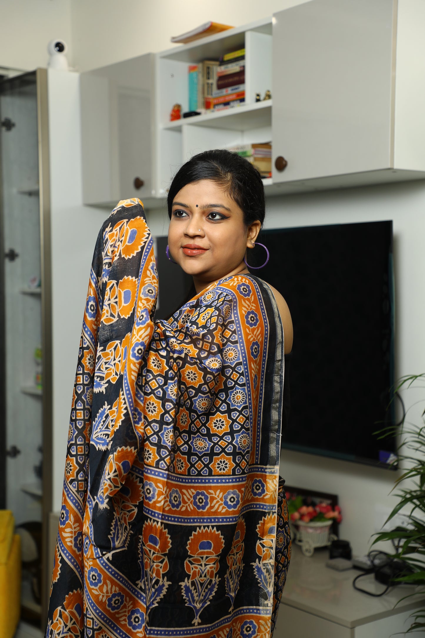 The Ajrakh printed Chanderi silk saree is a fusion of two rich textile traditions. Ajrakh, a centuries-old block printing technique, is known for its intricate geometric patterns and deep, earthy colors, typically using natural dyes like indigo, madder, and black. This printing style originates from the Kutch region of Gujarat and is revered for its meticulous, handcrafted process, often involving up to 14 different stages of dyeing and printing.