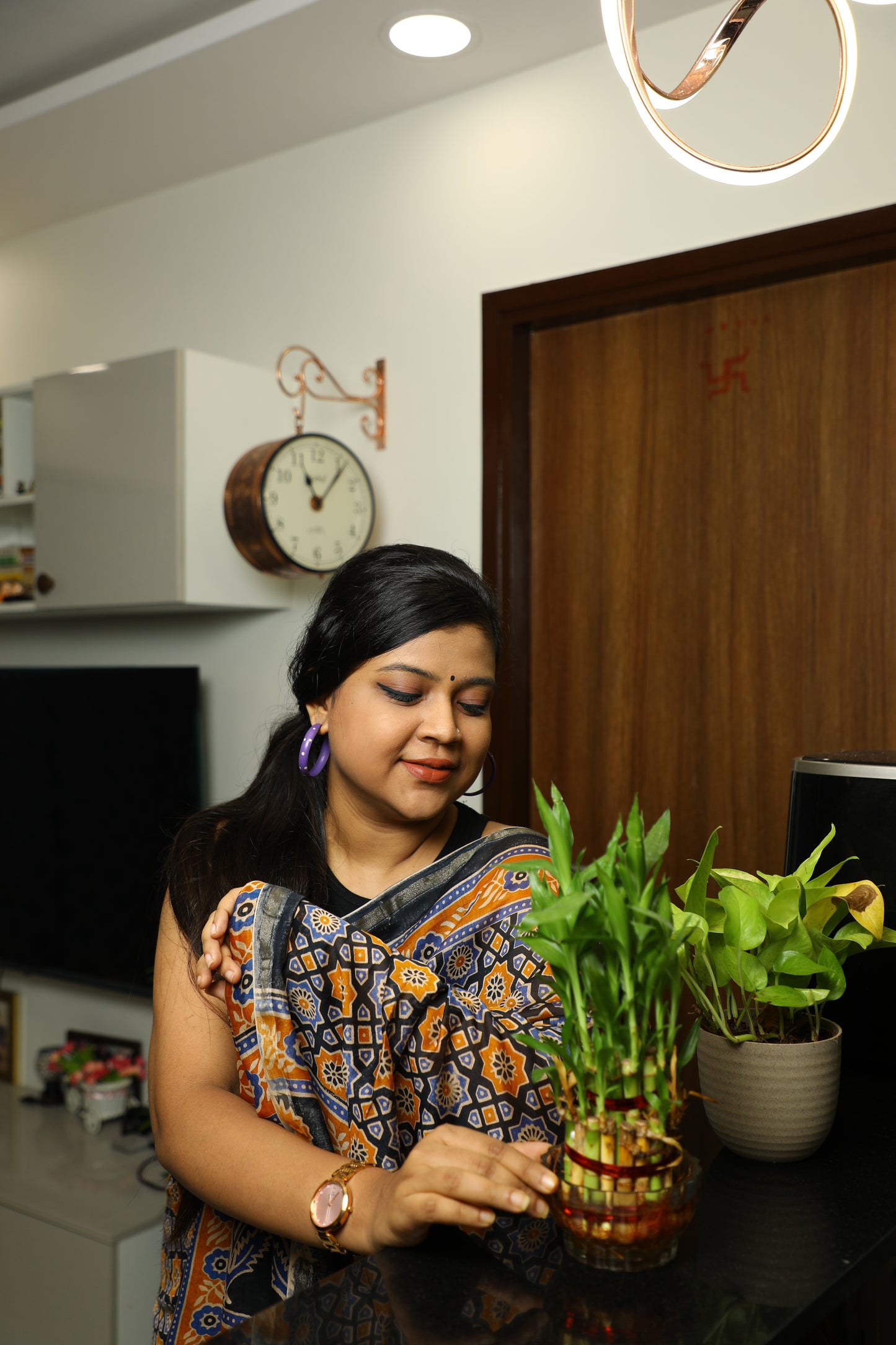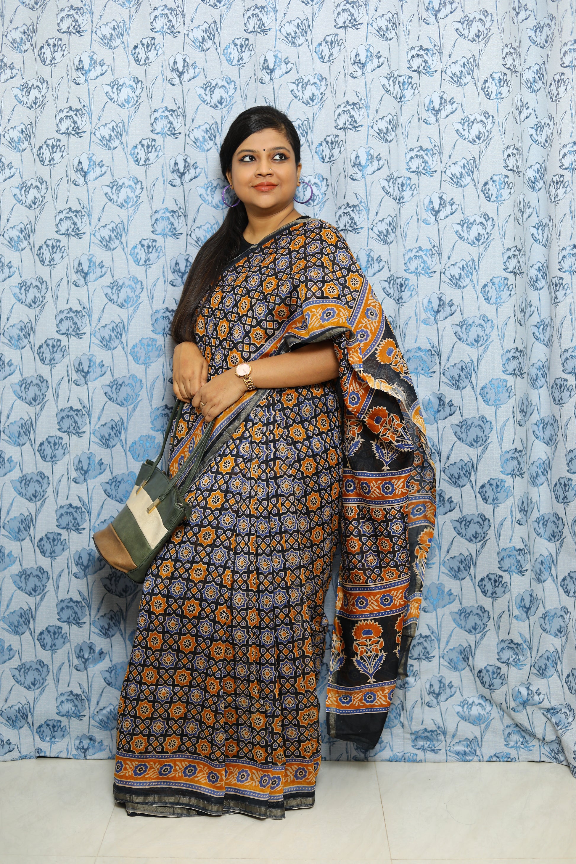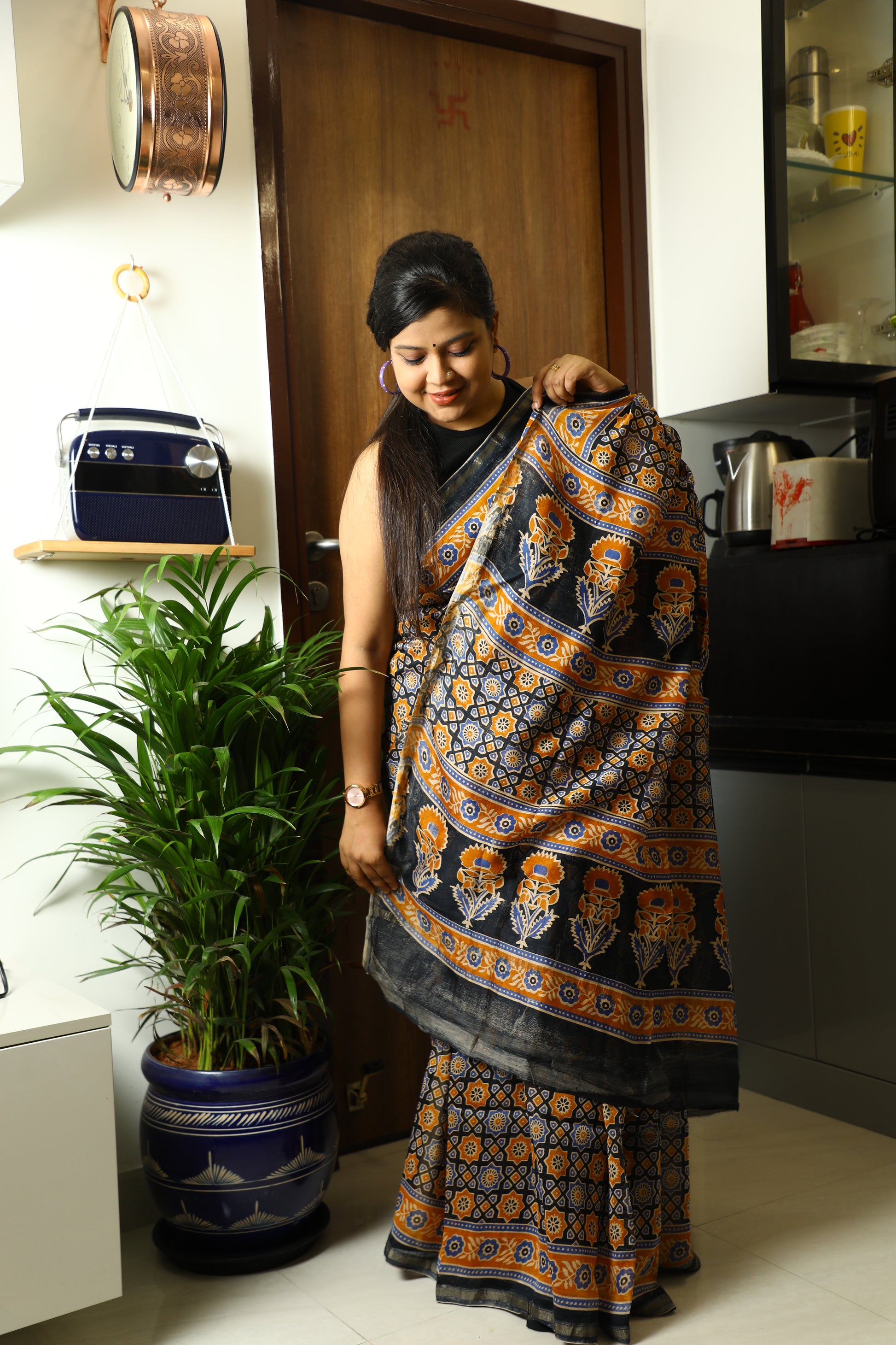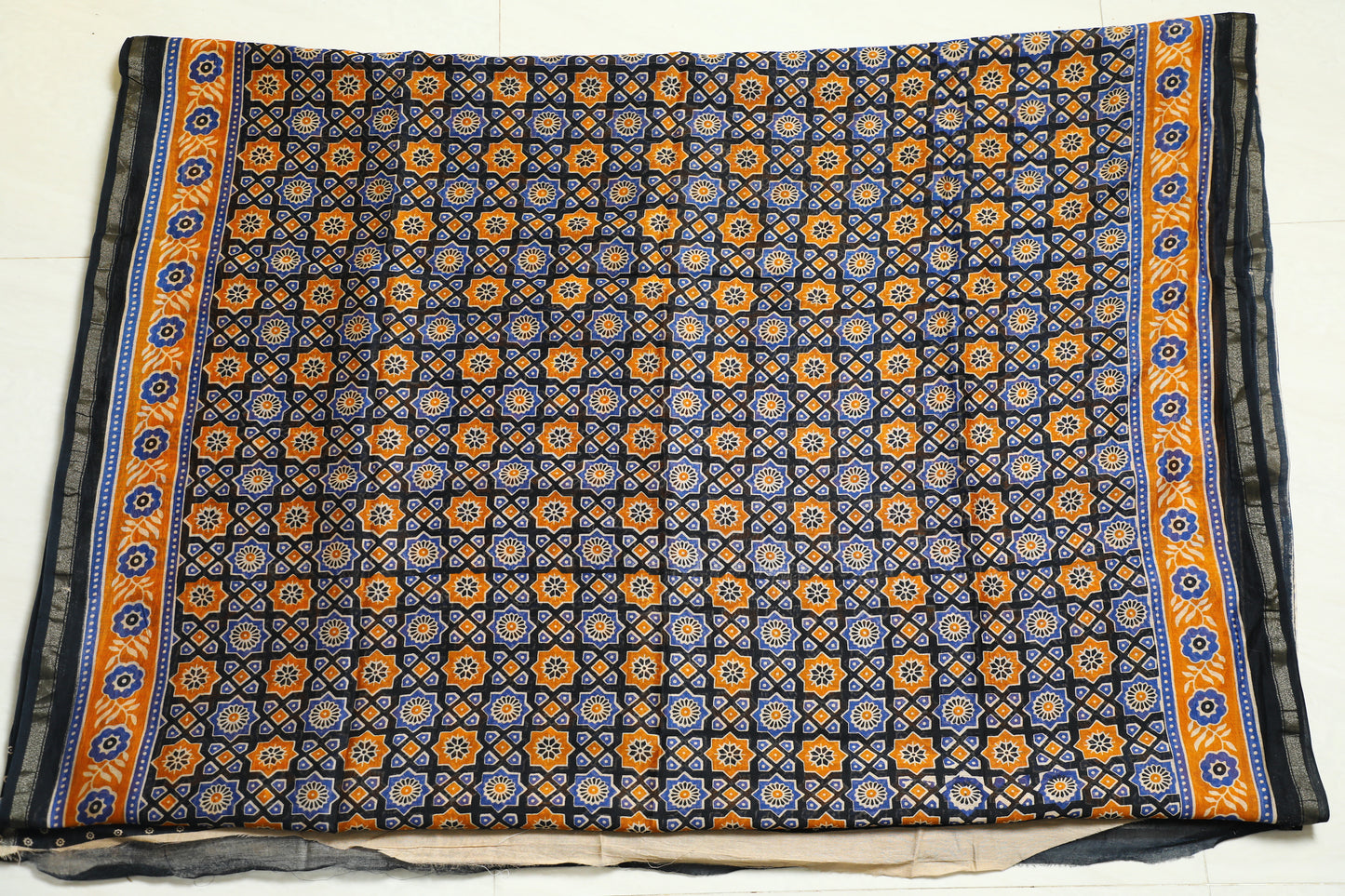 The Ajrakh printed Chanderi silk saree is a fusion of two rich textile traditions. Ajrakh, a centuries-old block printing technique, is known for its intricate geometric patterns and deep, earthy colors, typically using natural dyes like indigo, madder, and black. This printing style originates from the Kutch region of Gujarat and is revered for its meticulous, handcrafted process, often involving up to 14 different stages of dyeing and printing.