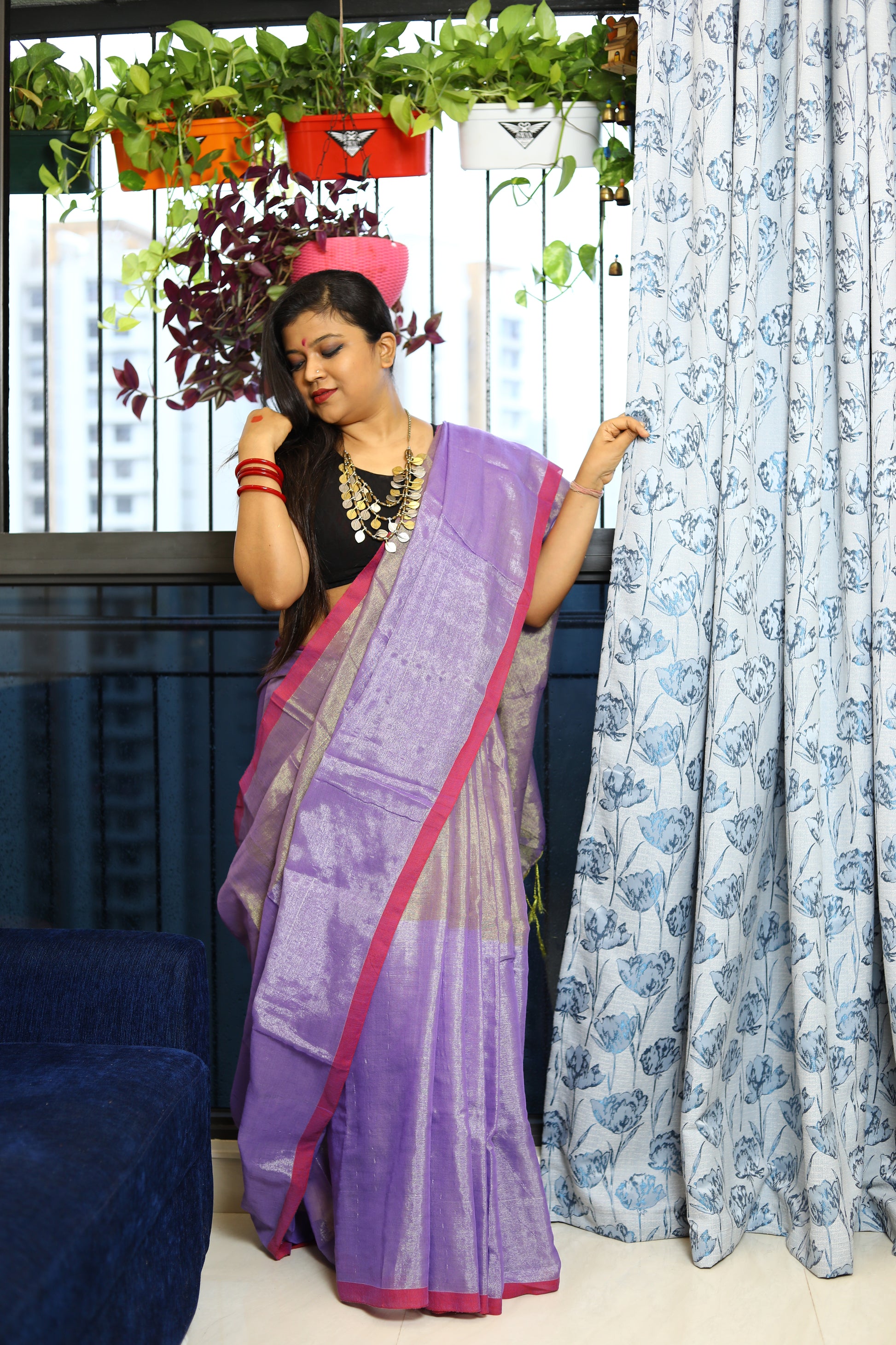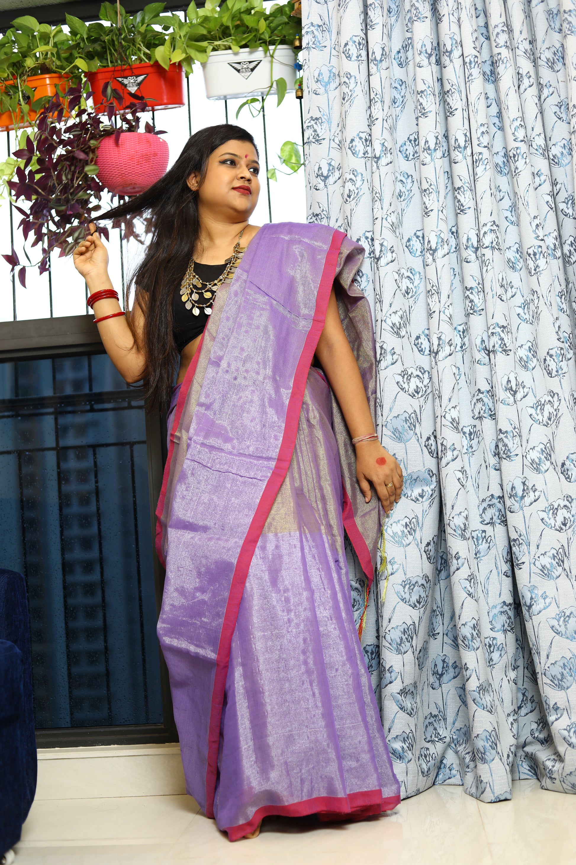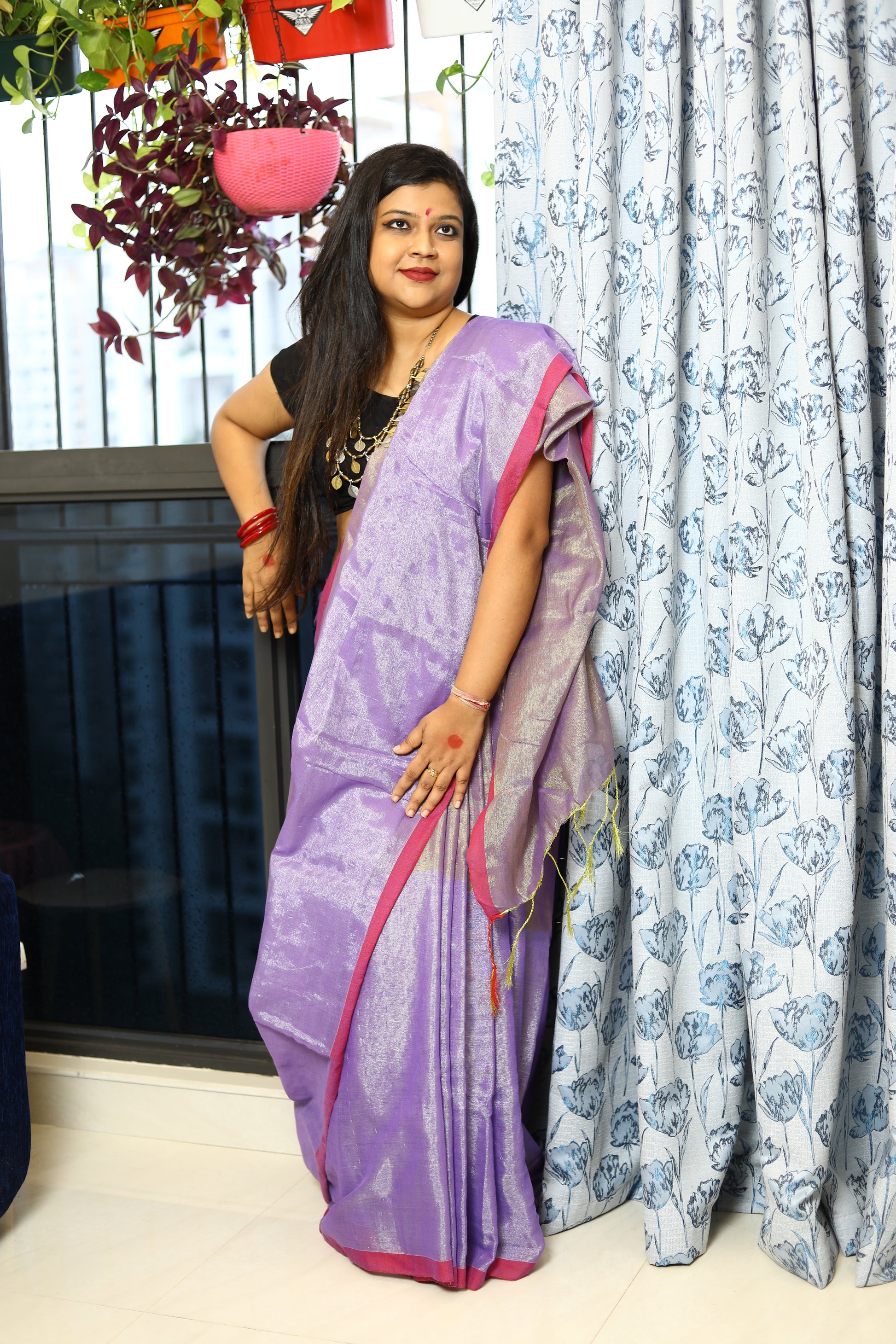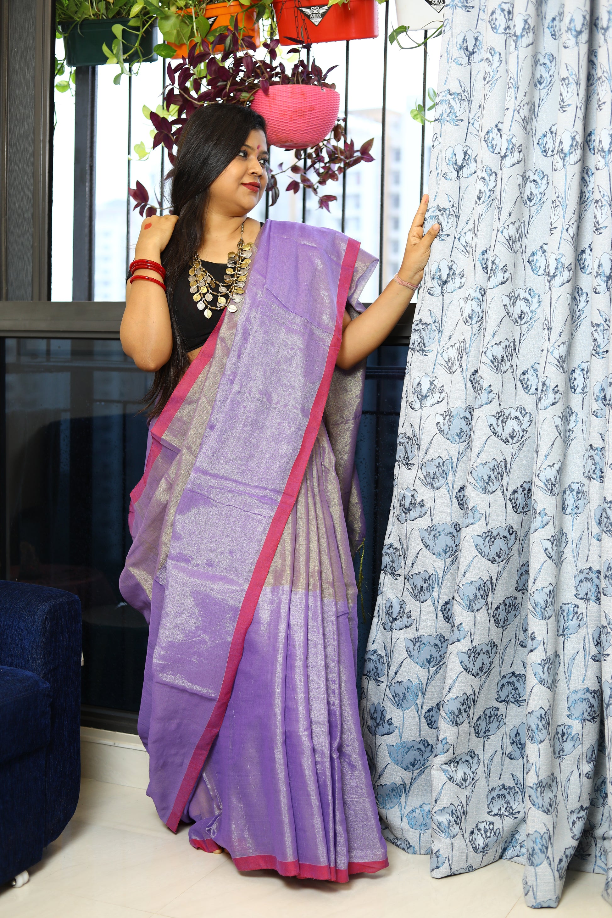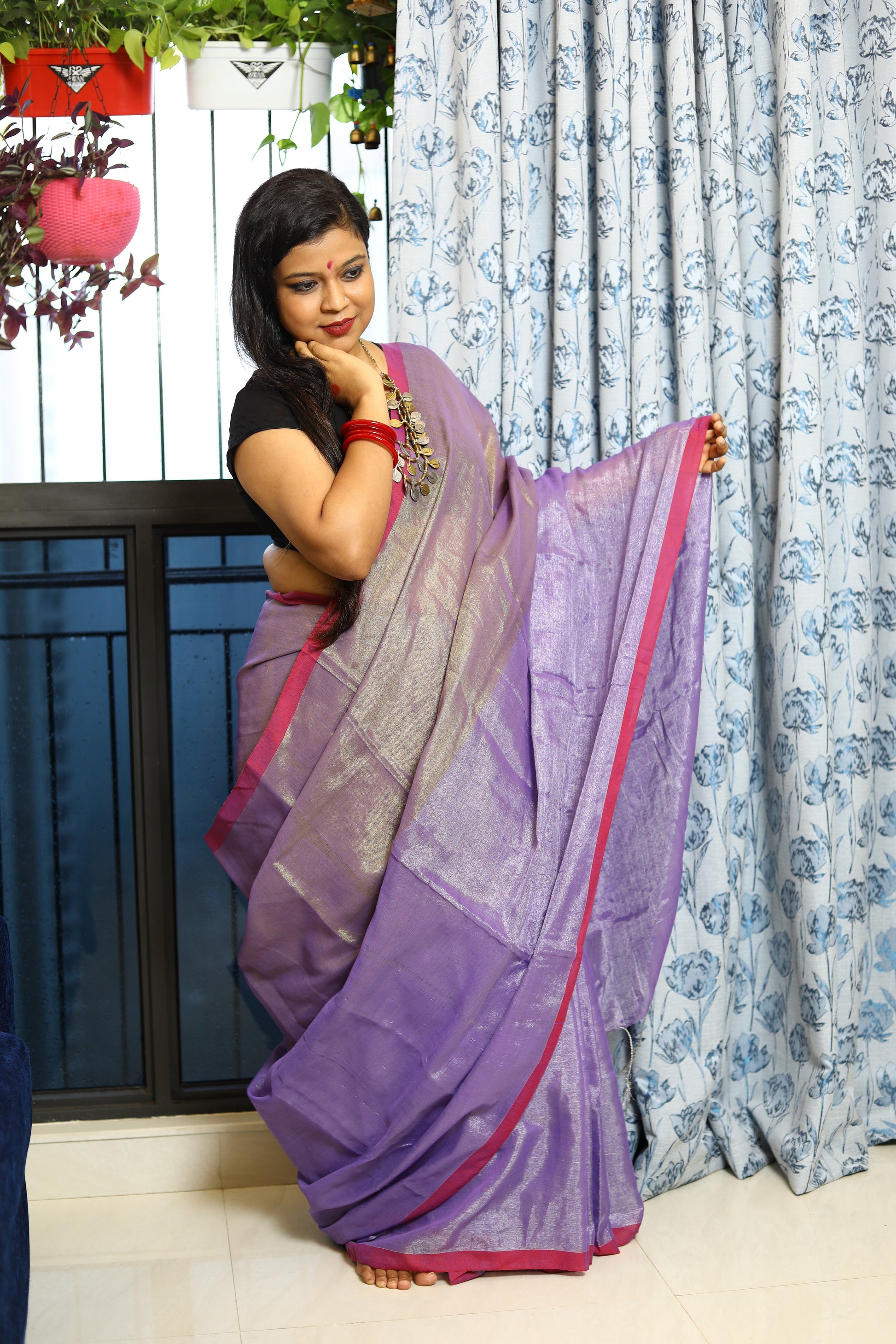 A stunning blend of elegance and comfort, crafted to make you shine on every occasion. This gorgeous saree features a delicate shimmer, while the linen base ensures a breathable, lightweight feel. Whether you're attending a festive celebration, a wedding, or a special event, this saree drapes effortlessly, offering both grace and ease. Its subtle sheen adds a touch of glamour, making it the perfect choice for those who seek a refined, timeless look.