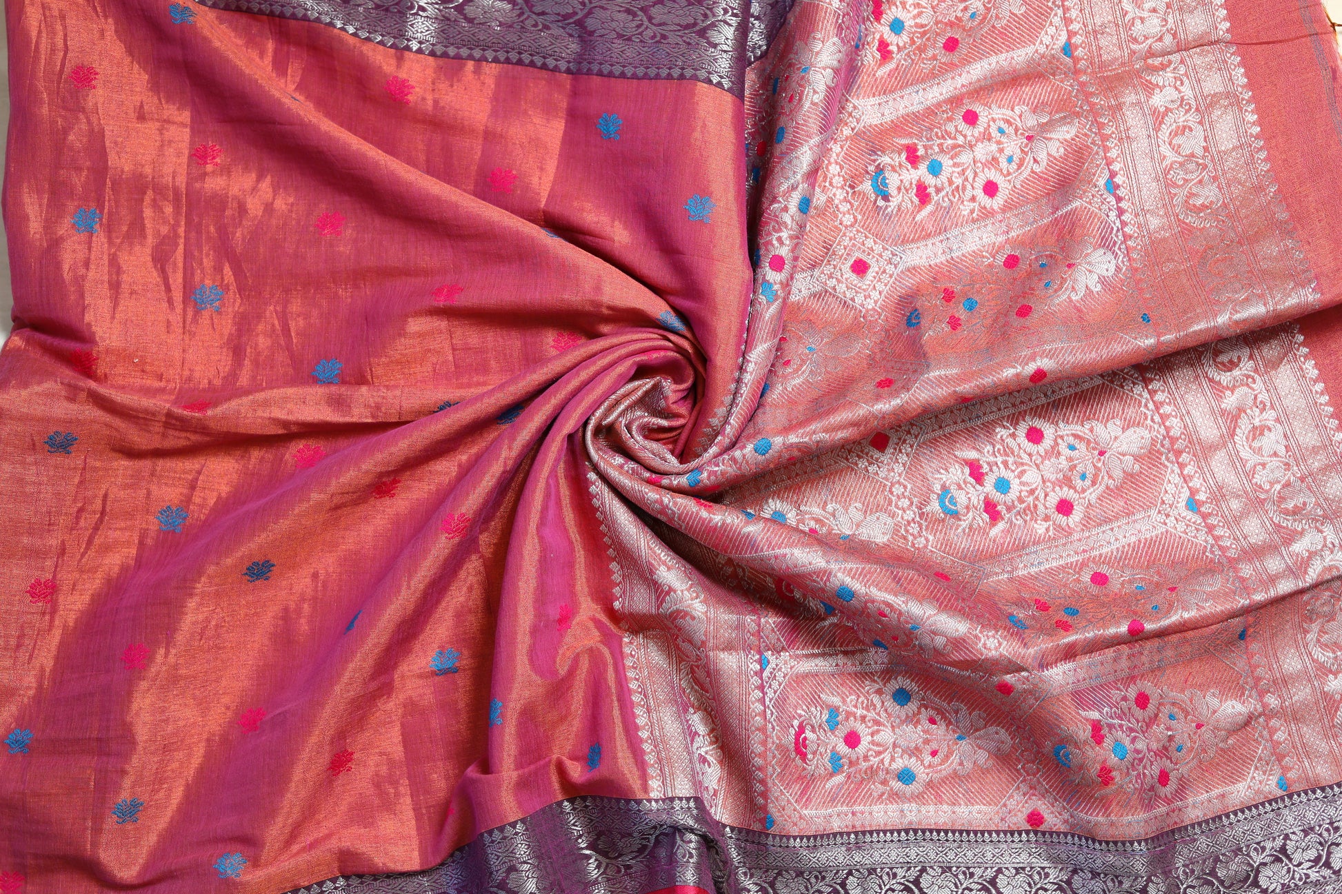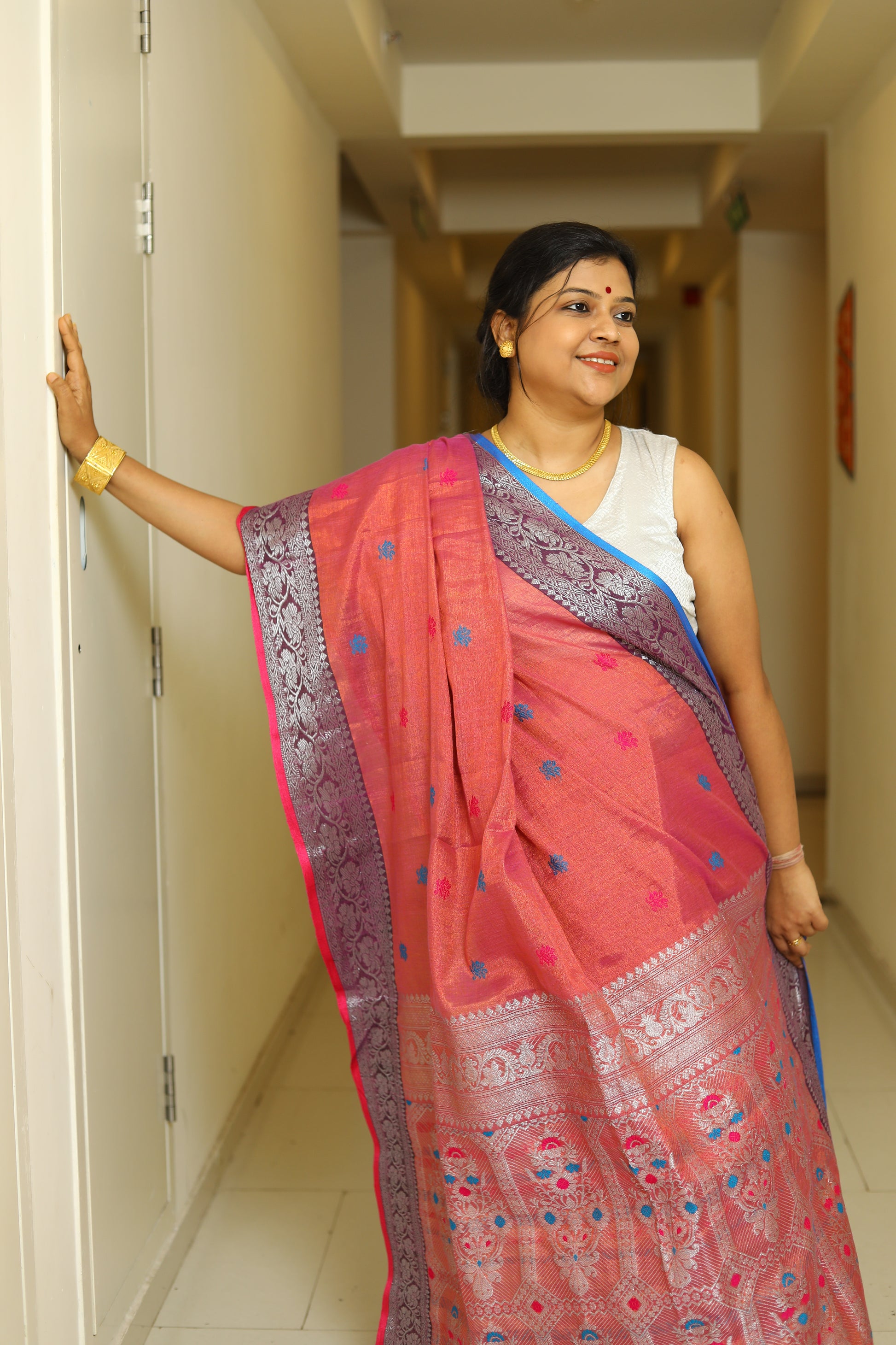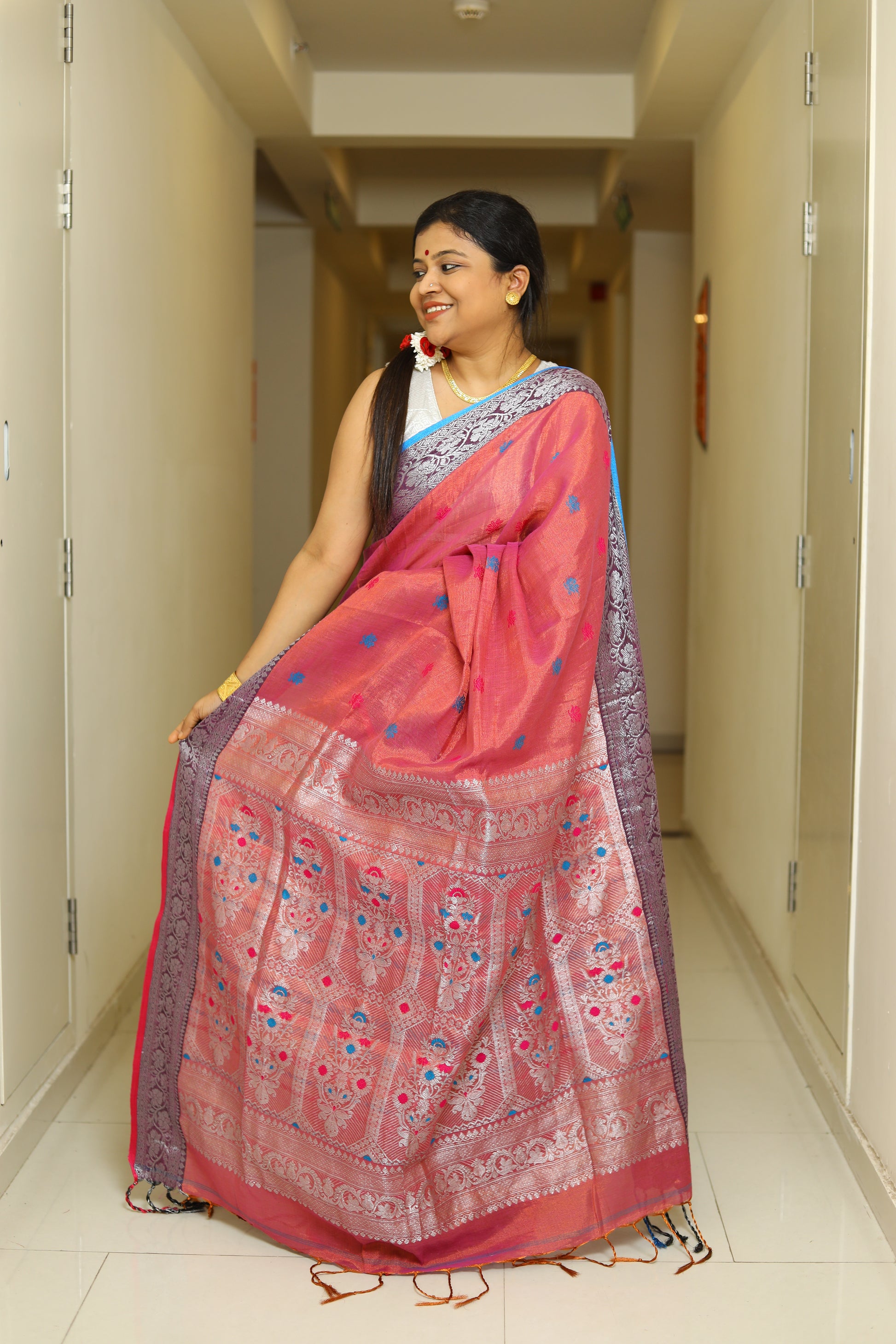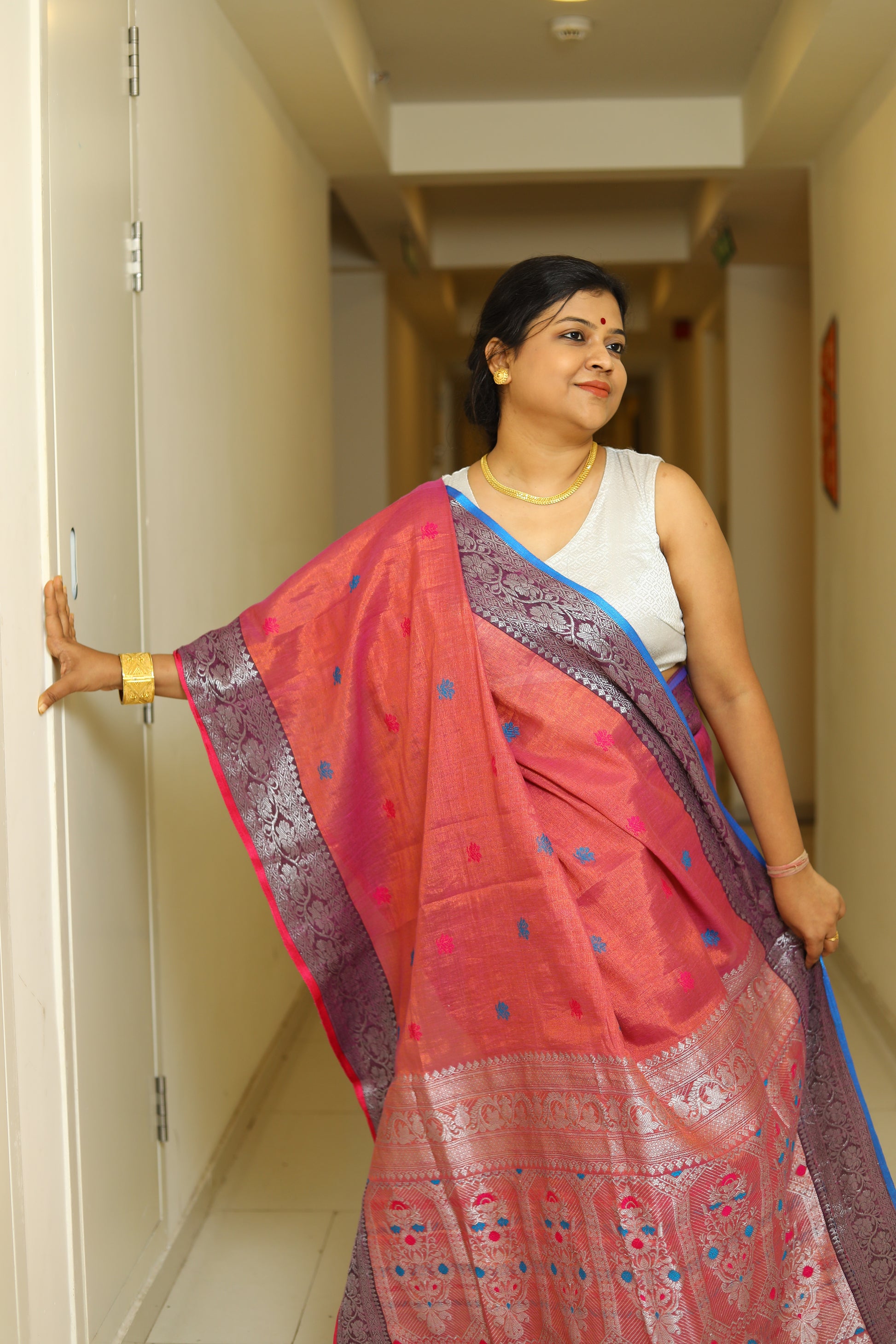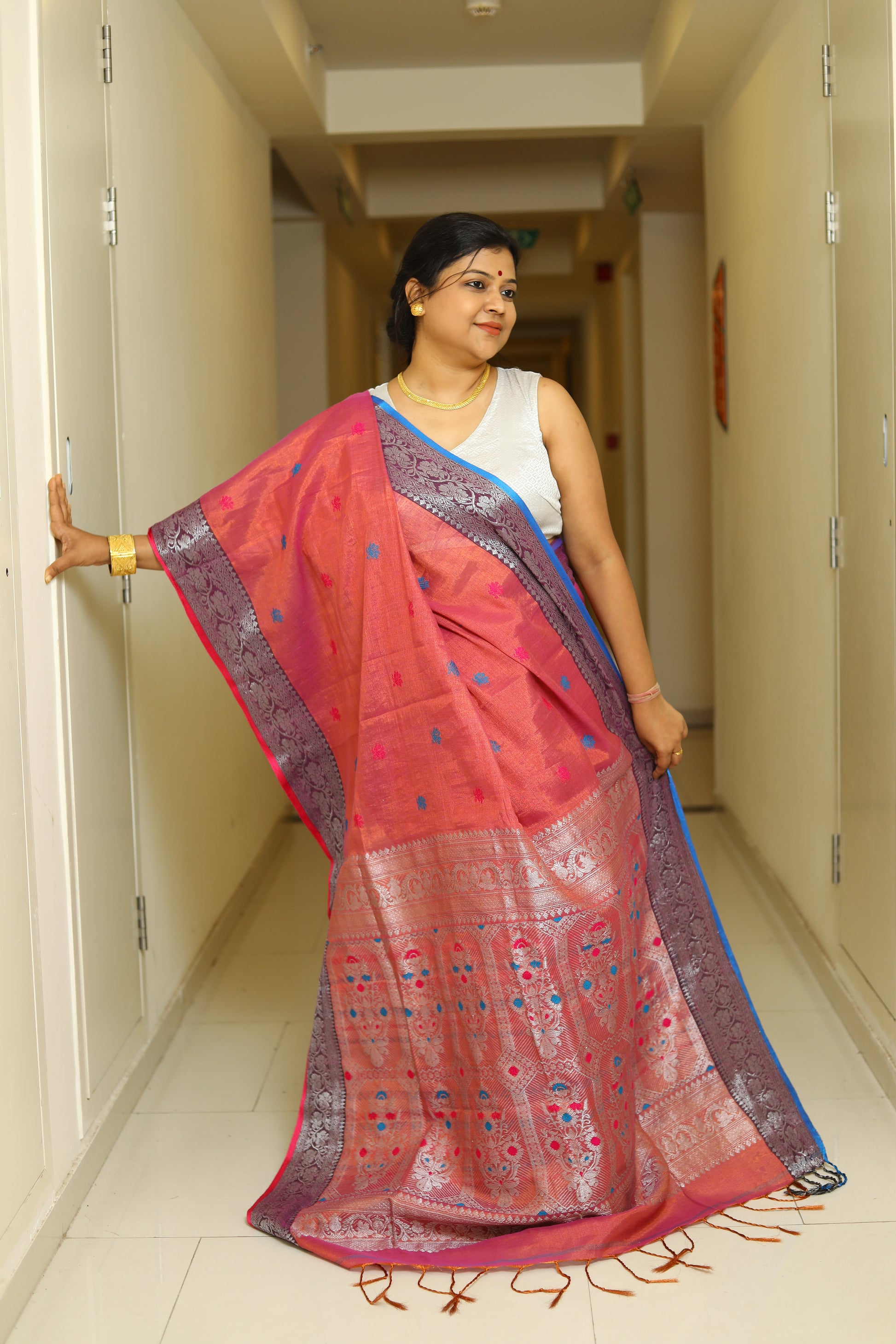 Embrace the spirit of the festive season with our stunning tissue linen Benarasi saree. This exquisite piece combines the lightweight elegance of tissue linen with the rich heritage of Benarasi weaving, making it a perfect choice for celebrations. Adorned with intricate designs and a lustrous sheen, the saree drapes beautifully, enhancing your natural grace. Ideal for festive gatherings, family celebrations, or traditional events, this saree offers comfort without compromising on style. Elevate your festive wardrobe and make a statement with this timeless piece that reflects artistry and tradition. Celebrate in style and let your elegance shine!