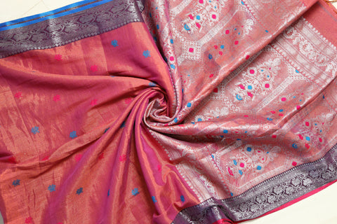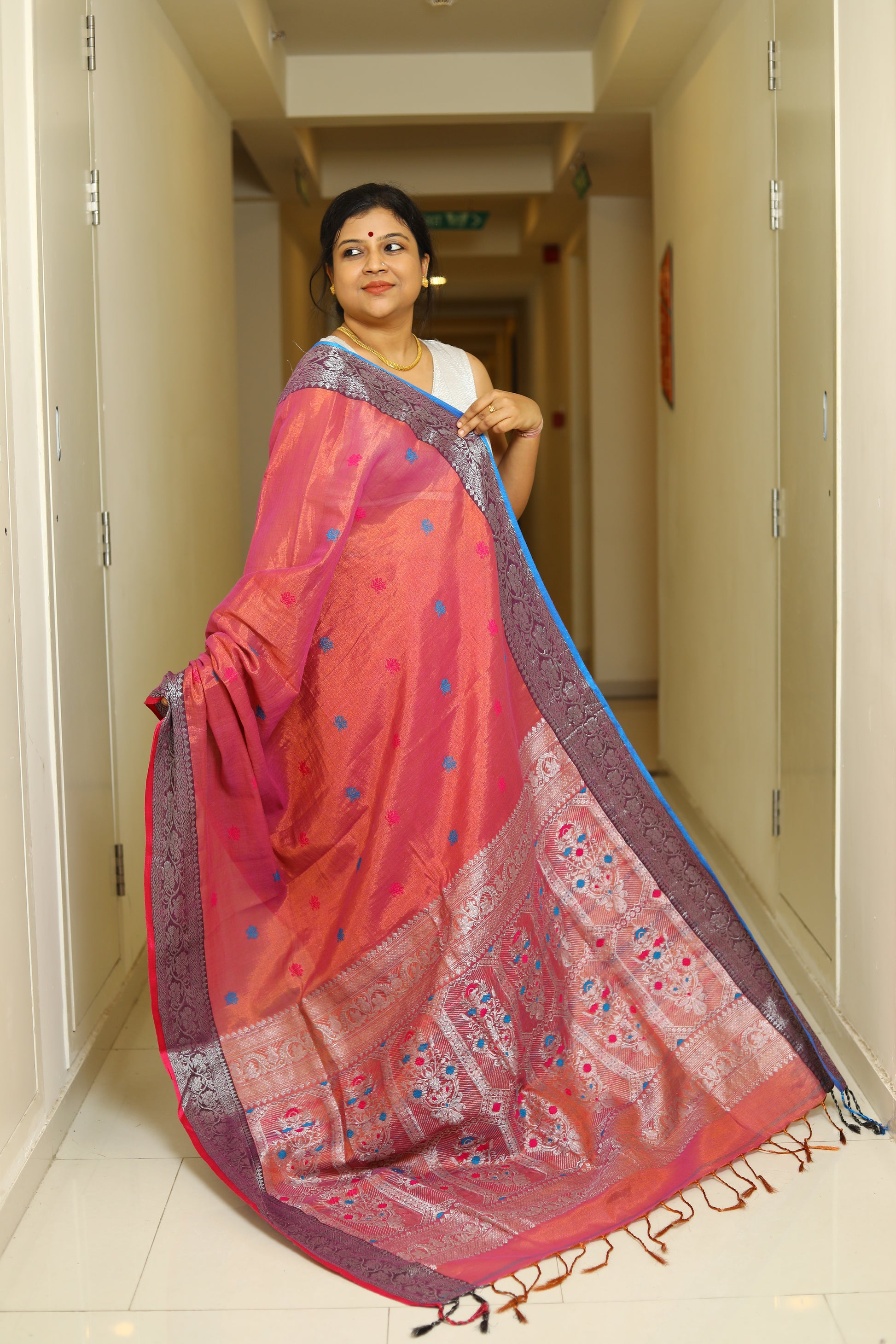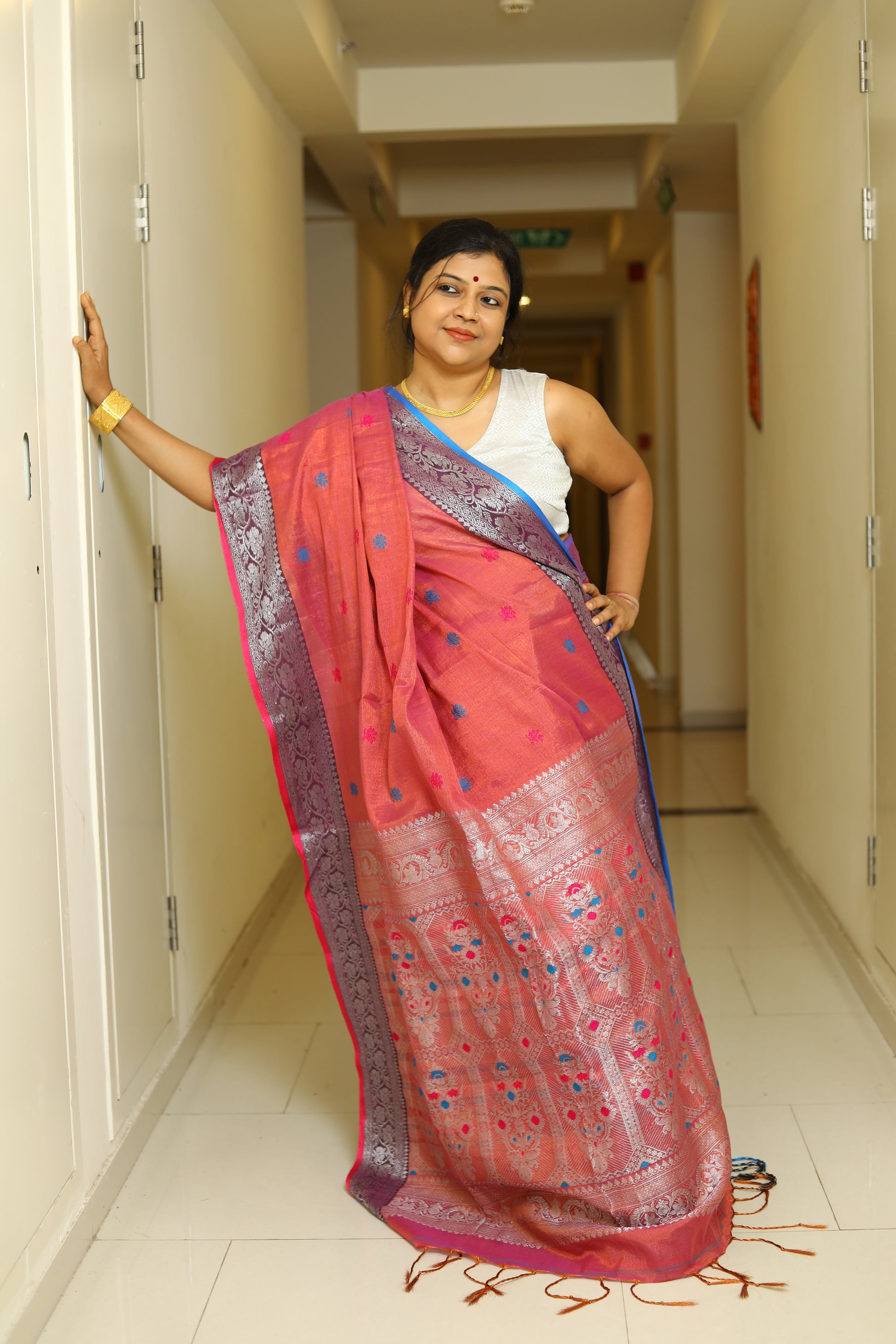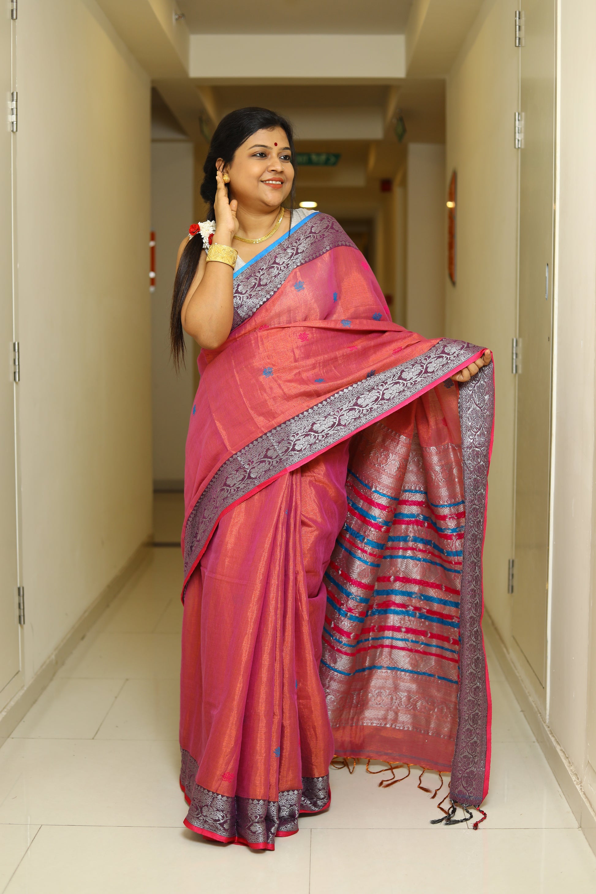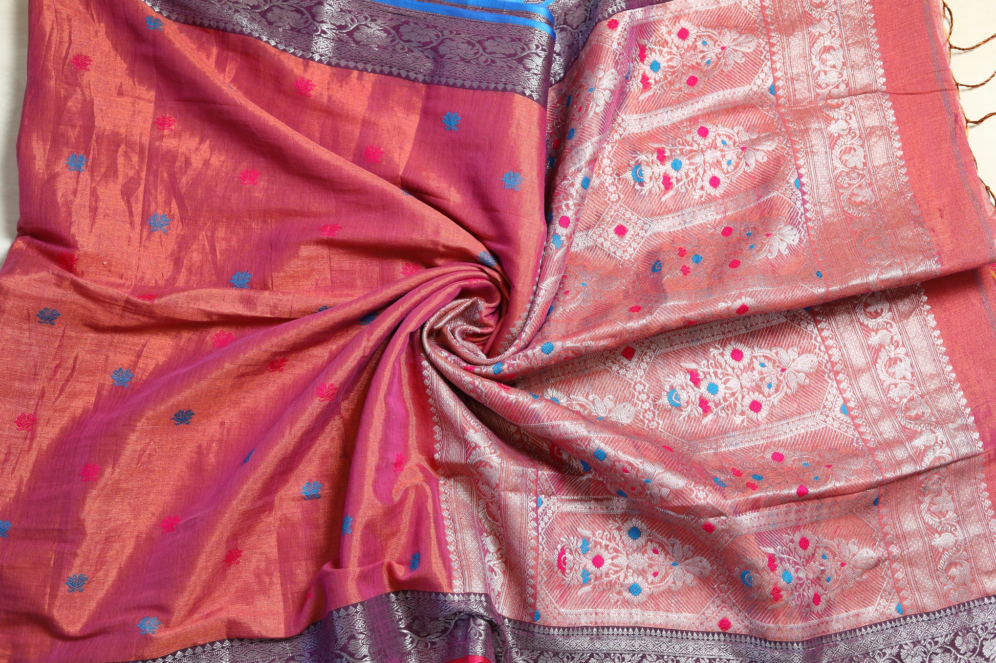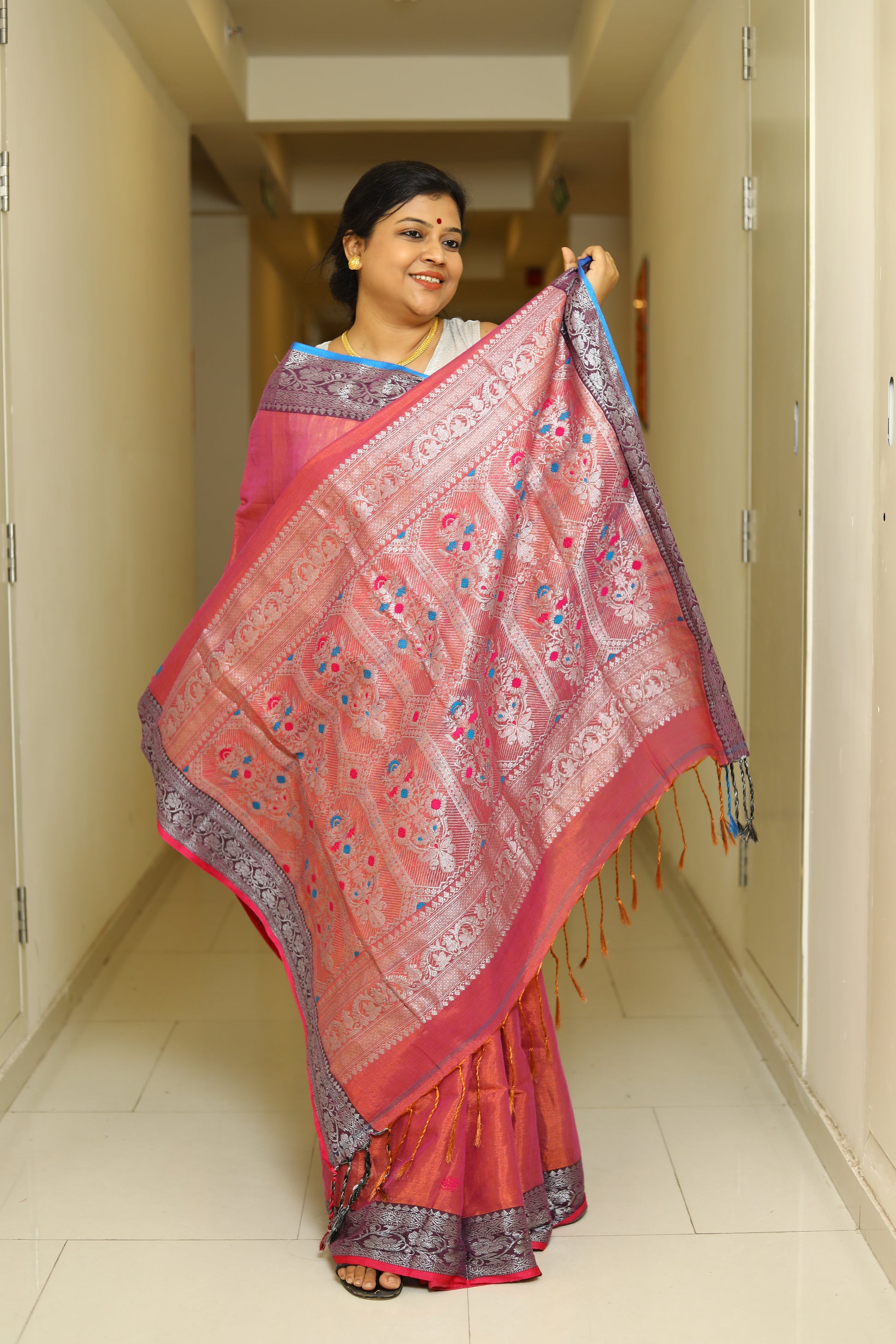 Embrace the spirit of the festive season with our stunning tissue linen Benarasi saree. This exquisite piece combines the lightweight elegance of tissue linen with the rich heritage of Benarasi weaving, making it a perfect choice for celebrations. Adorned with intricate designs and a lustrous sheen, the saree drapes beautifully, enhancing your natural grace. Ideal for festive gatherings, family celebrations, or traditional events, this saree offers comfort without compromising on style. Elevate your festive wardrobe and make a statement with this timeless piece that reflects artistry and tradition. Celebrate in style and let your elegance shine!