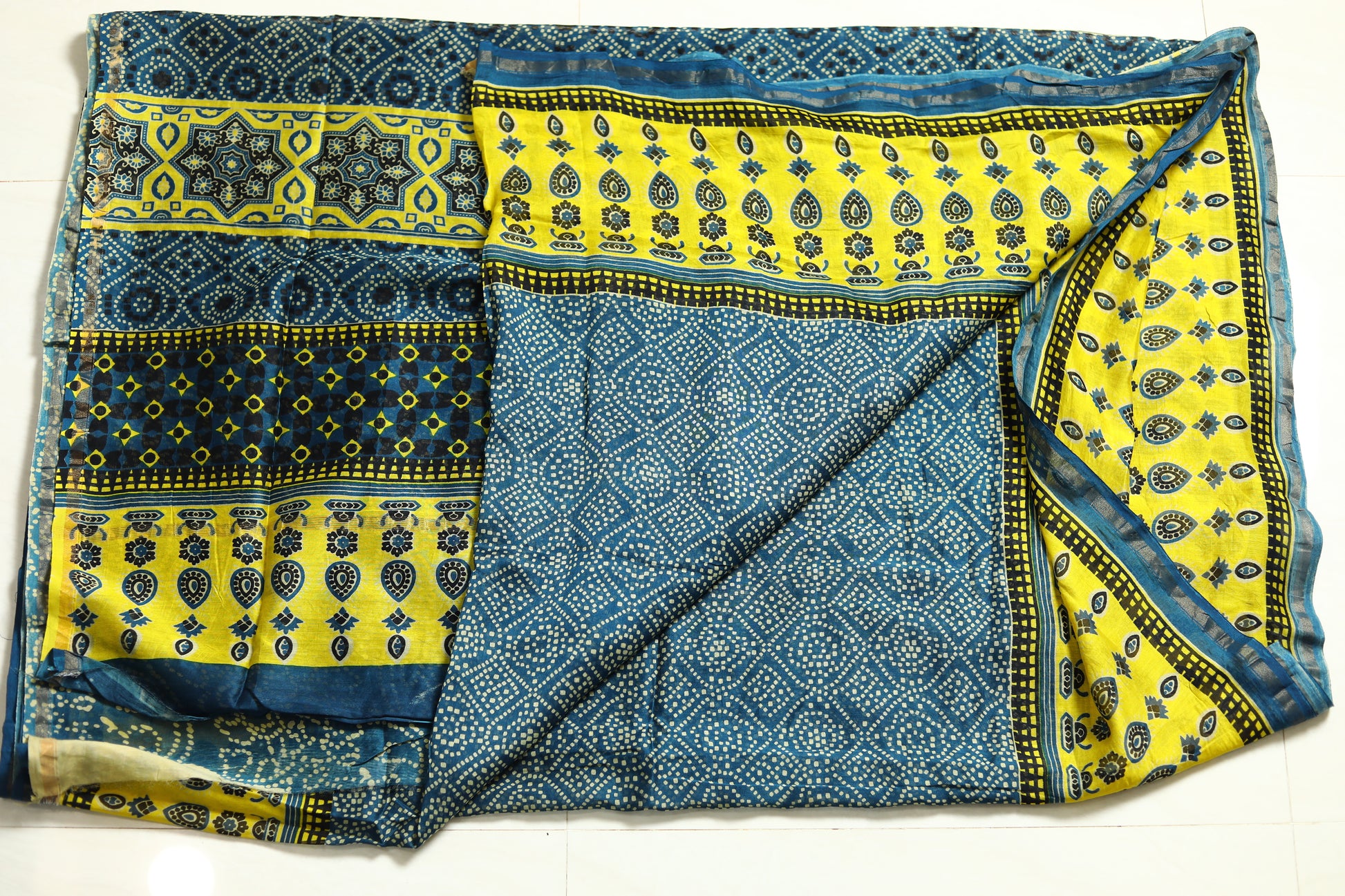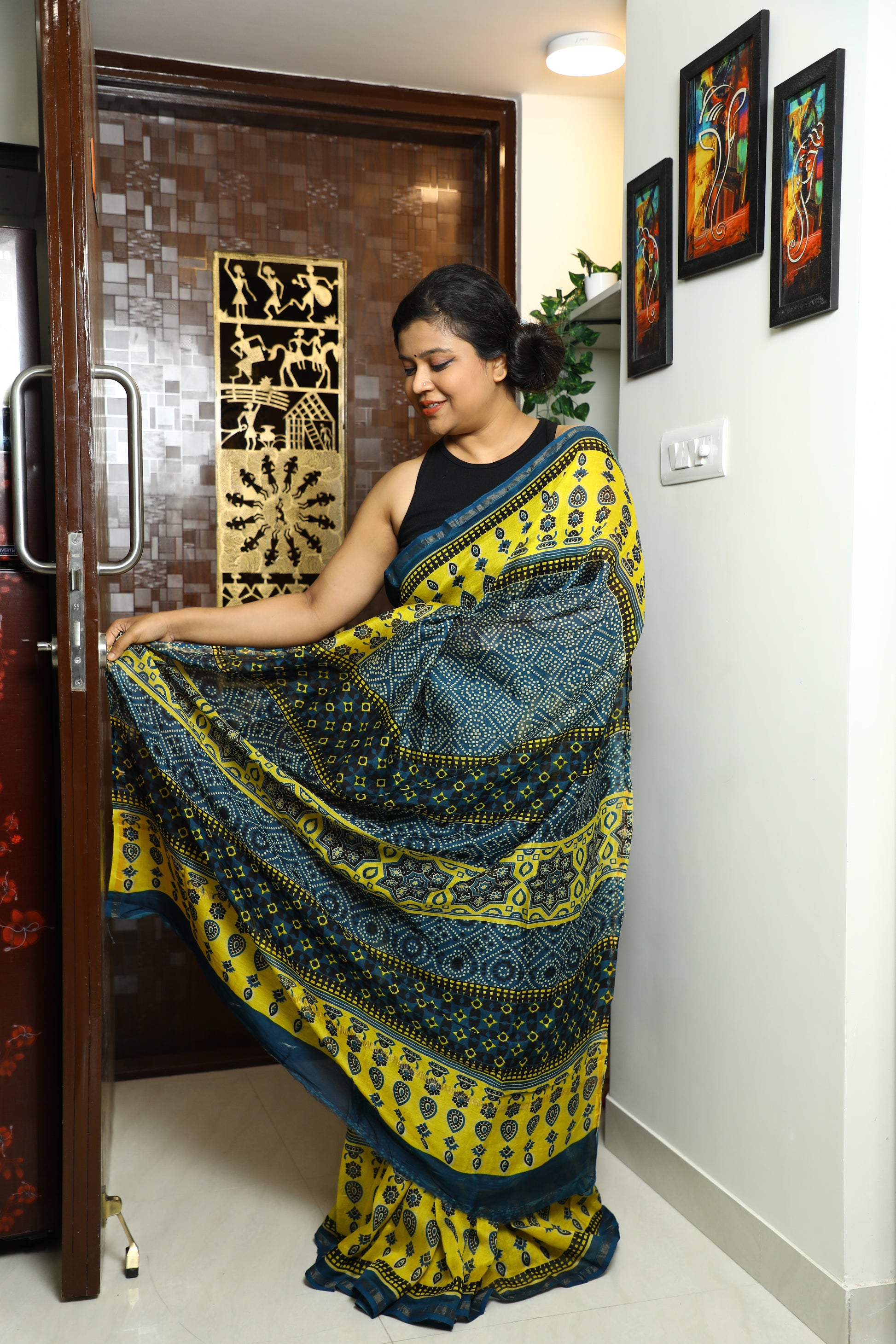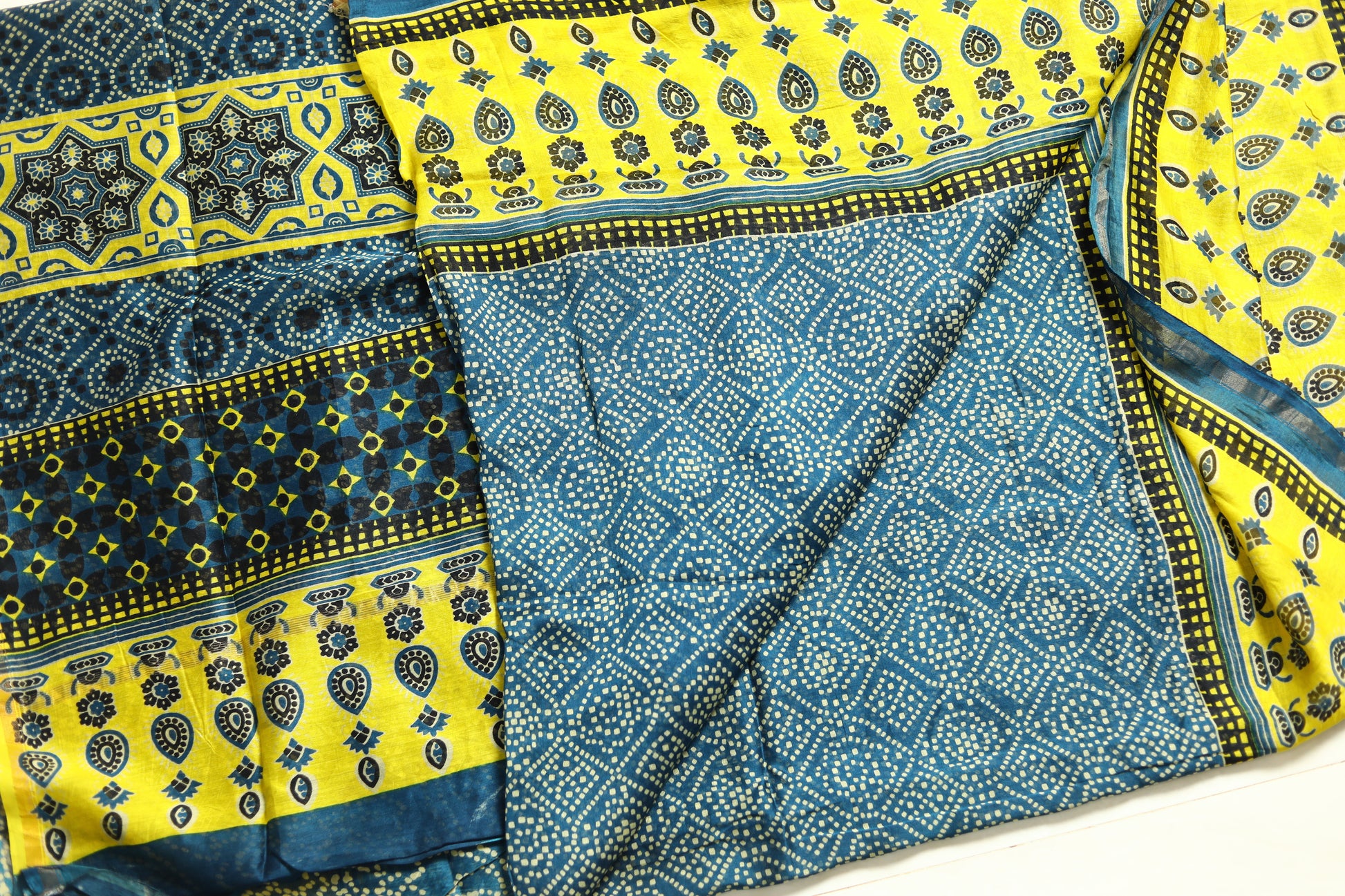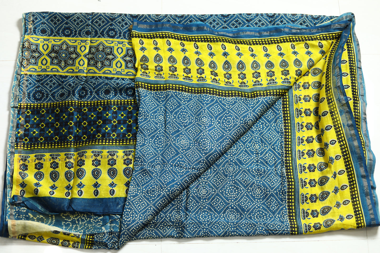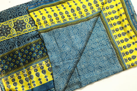 The Ajrakh printed Chanderi silk saree is a fusion of two rich textile traditions. Ajrakh, a centuries-old block printing technique, is known for its intricate geometric patterns and deep, earthy colors, typically using natural dyes like indigo, madder, and black. This printing style originates from the Kutch region of Gujarat and is revered for its meticulous, handcrafted process, often involving up to 14 different stages of dyeing and printing.