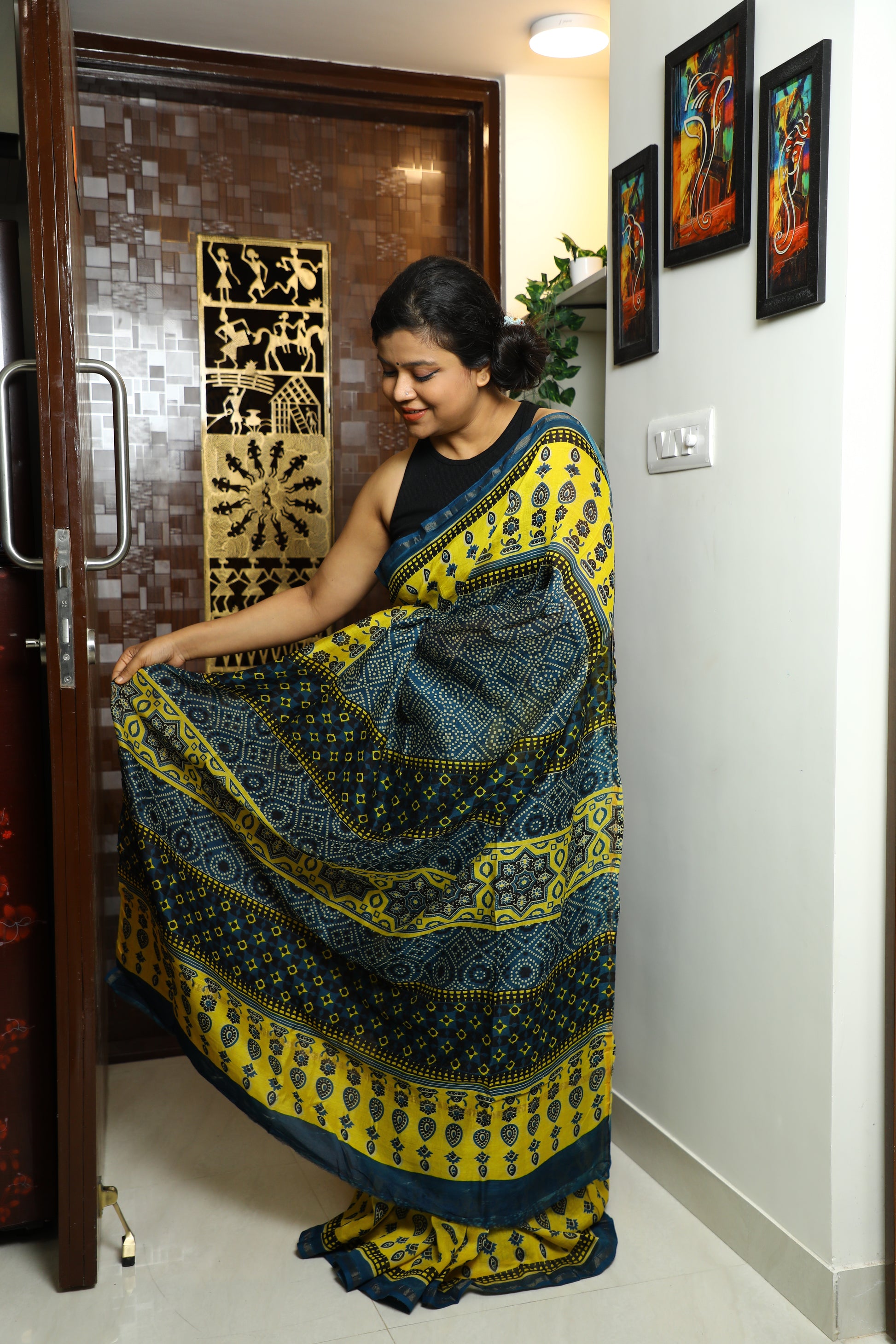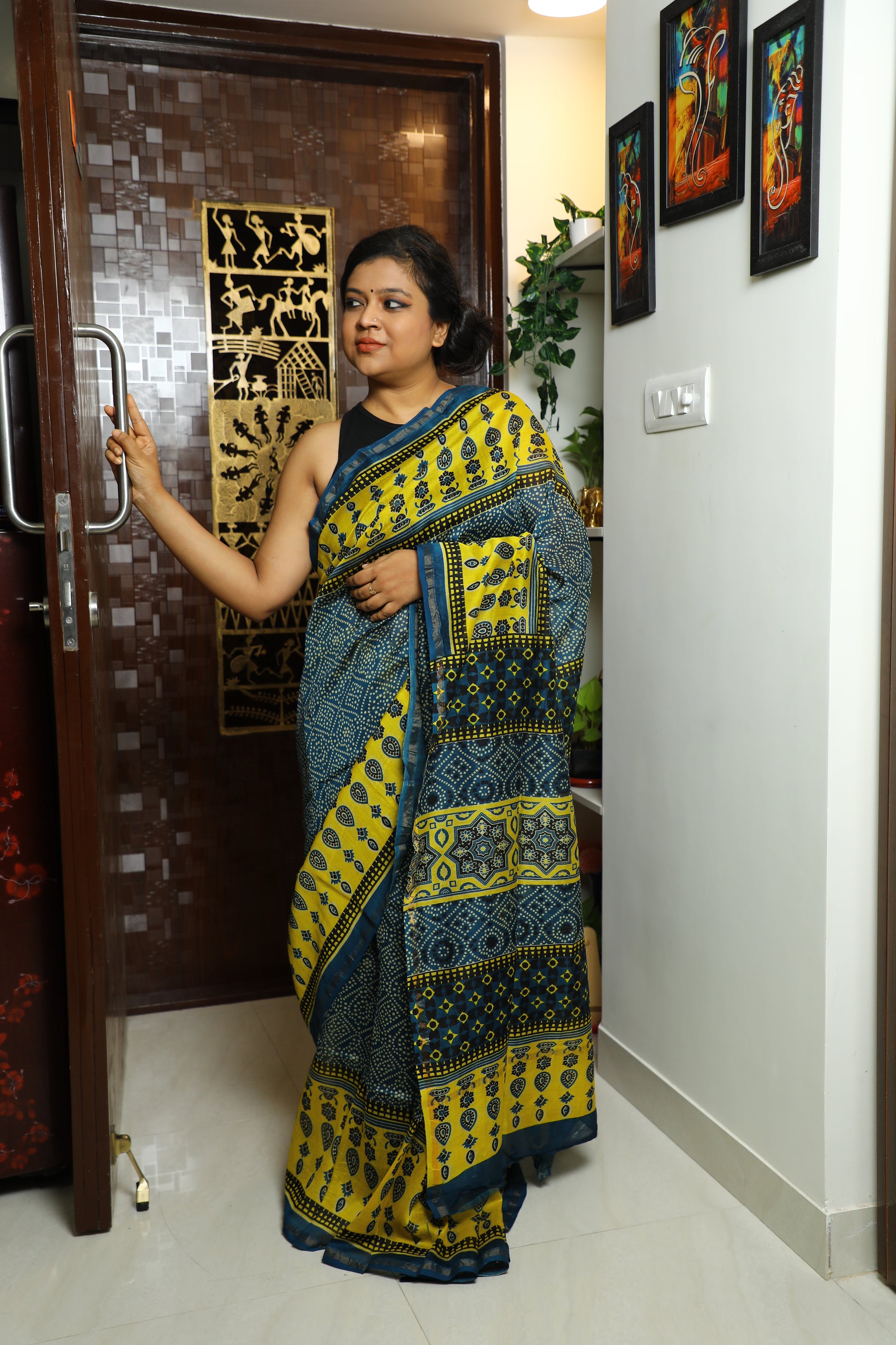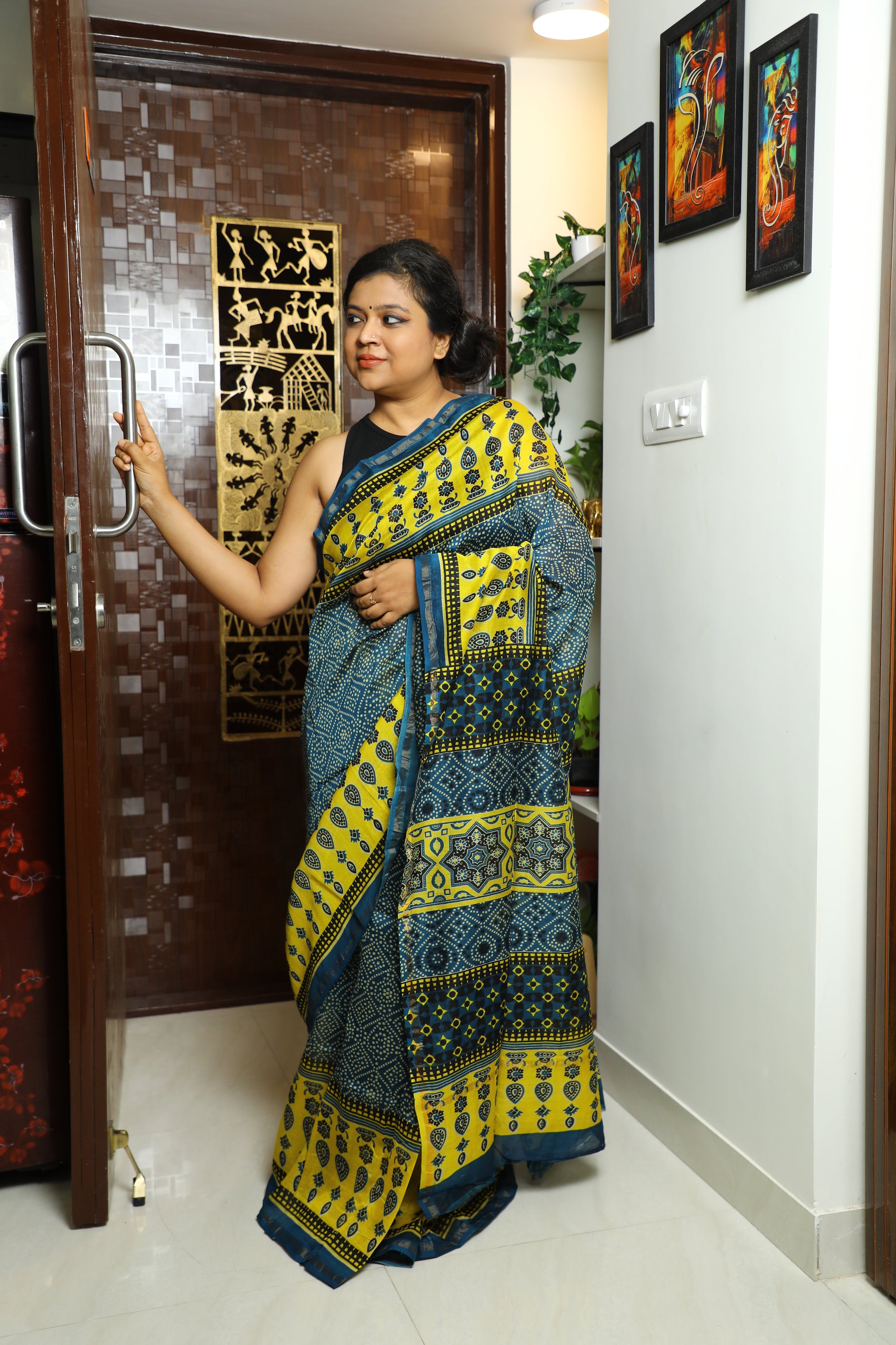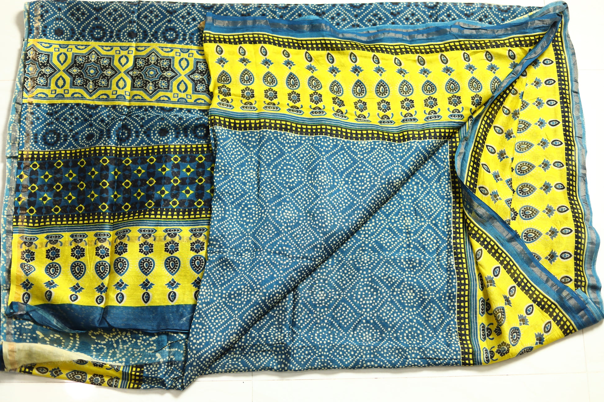 The Ajrakh printed Chanderi silk saree is a fusion of two rich textile traditions. Ajrakh, a centuries-old block printing technique, is known for its intricate geometric patterns and deep, earthy colors, typically using natural dyes like indigo, madder, and black. This printing style originates from the Kutch region of Gujarat and is revered for its meticulous, handcrafted process, often involving up to 14 different stages of dyeing and printing.