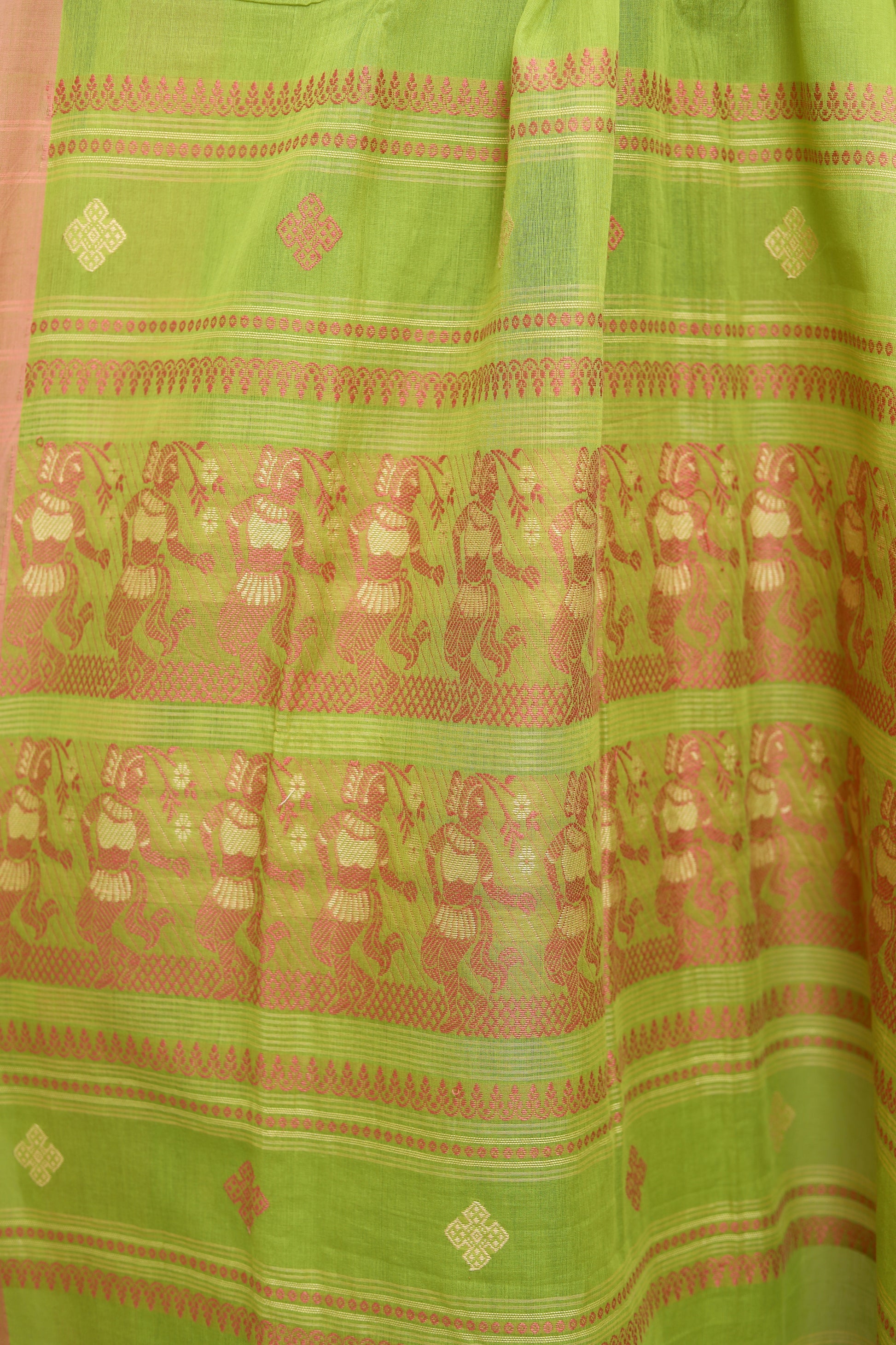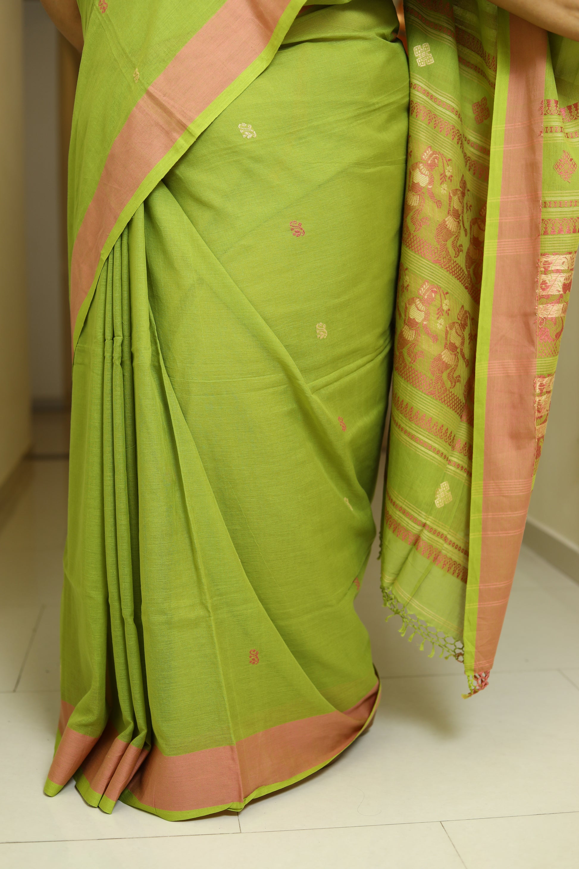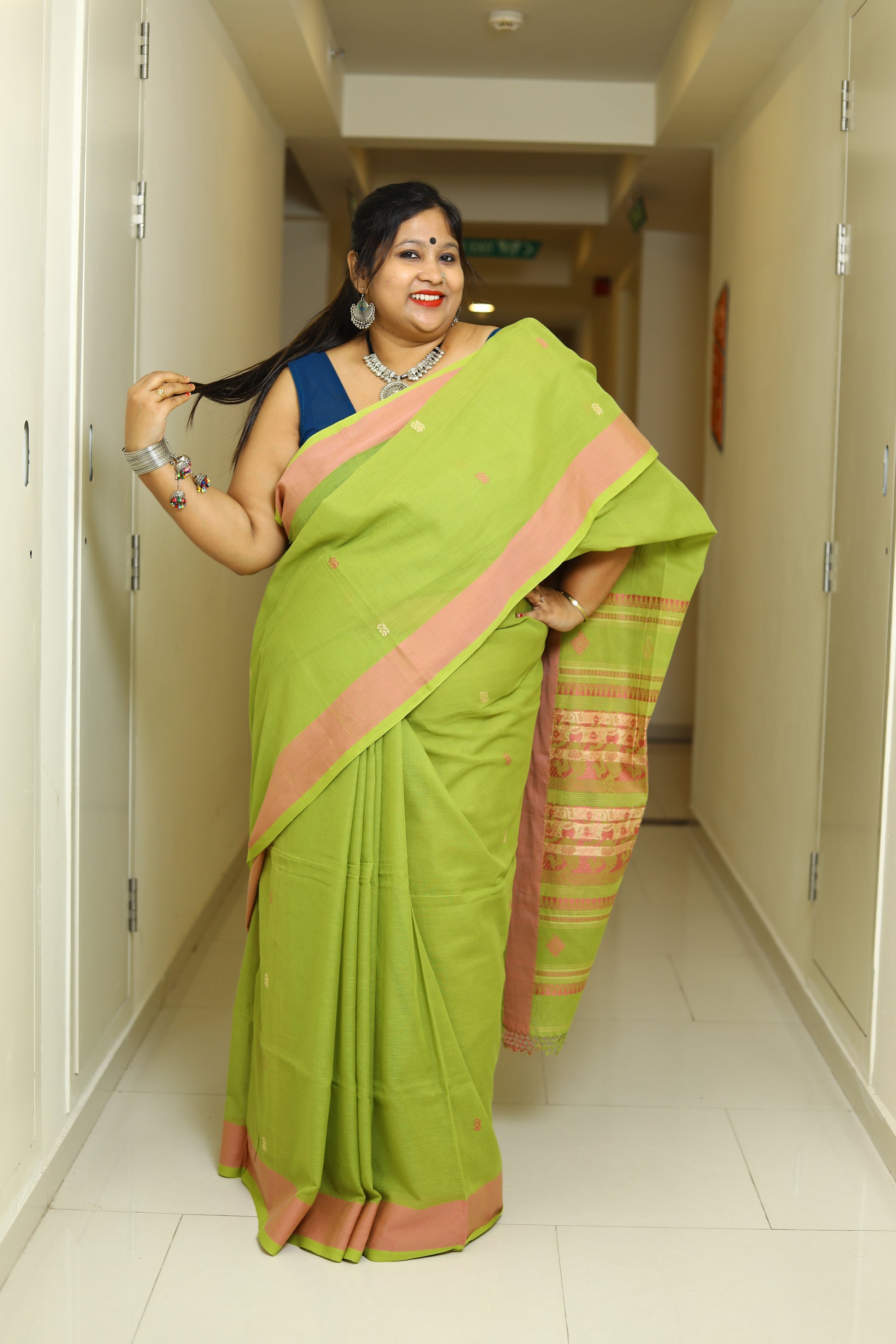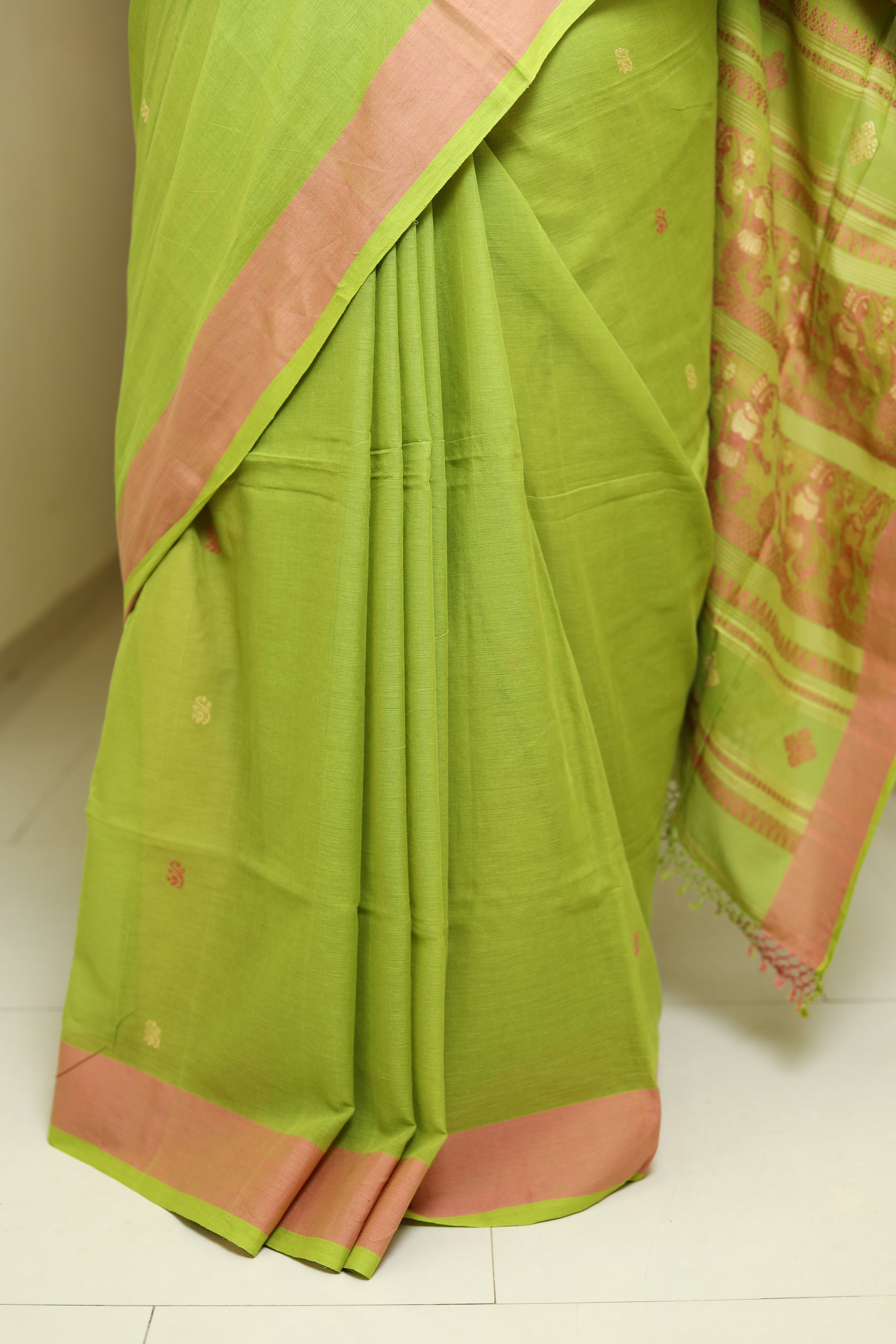 Pure cotton handloomed Baluchari sarees are exquisite traditional attire known for their rich heritage and intricate artistry. Originating from Bengal, these sarees are characterized by their soft, breathable fabric and vibrant colors.