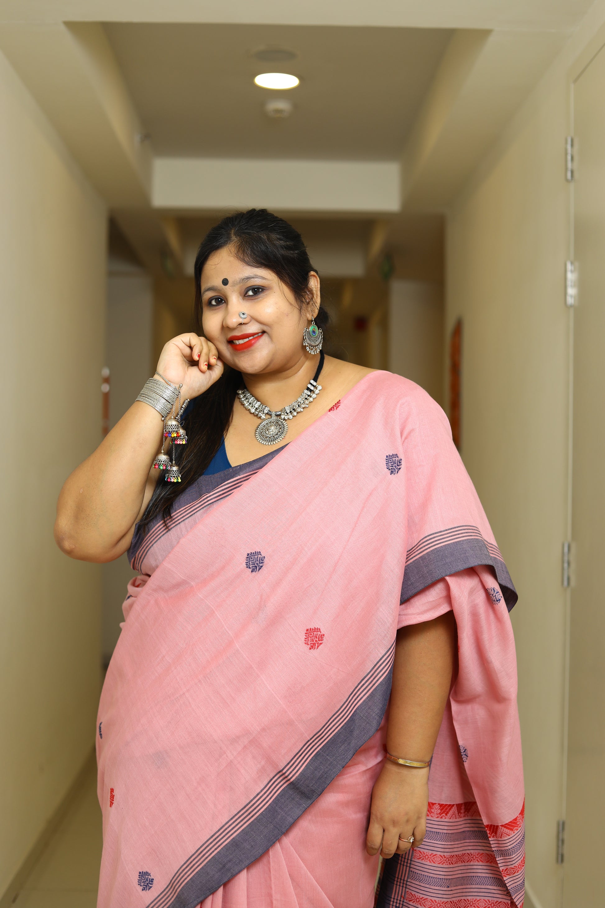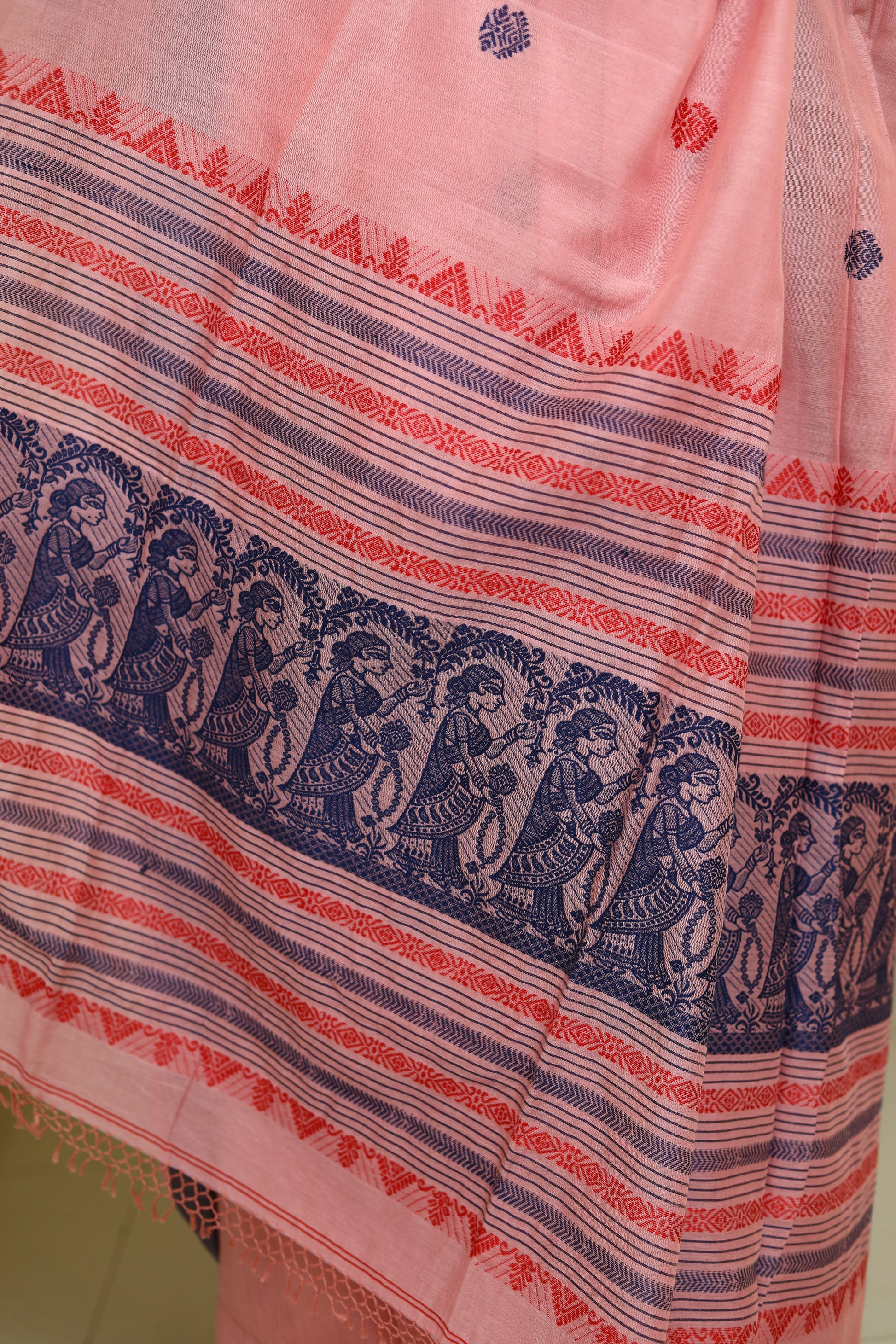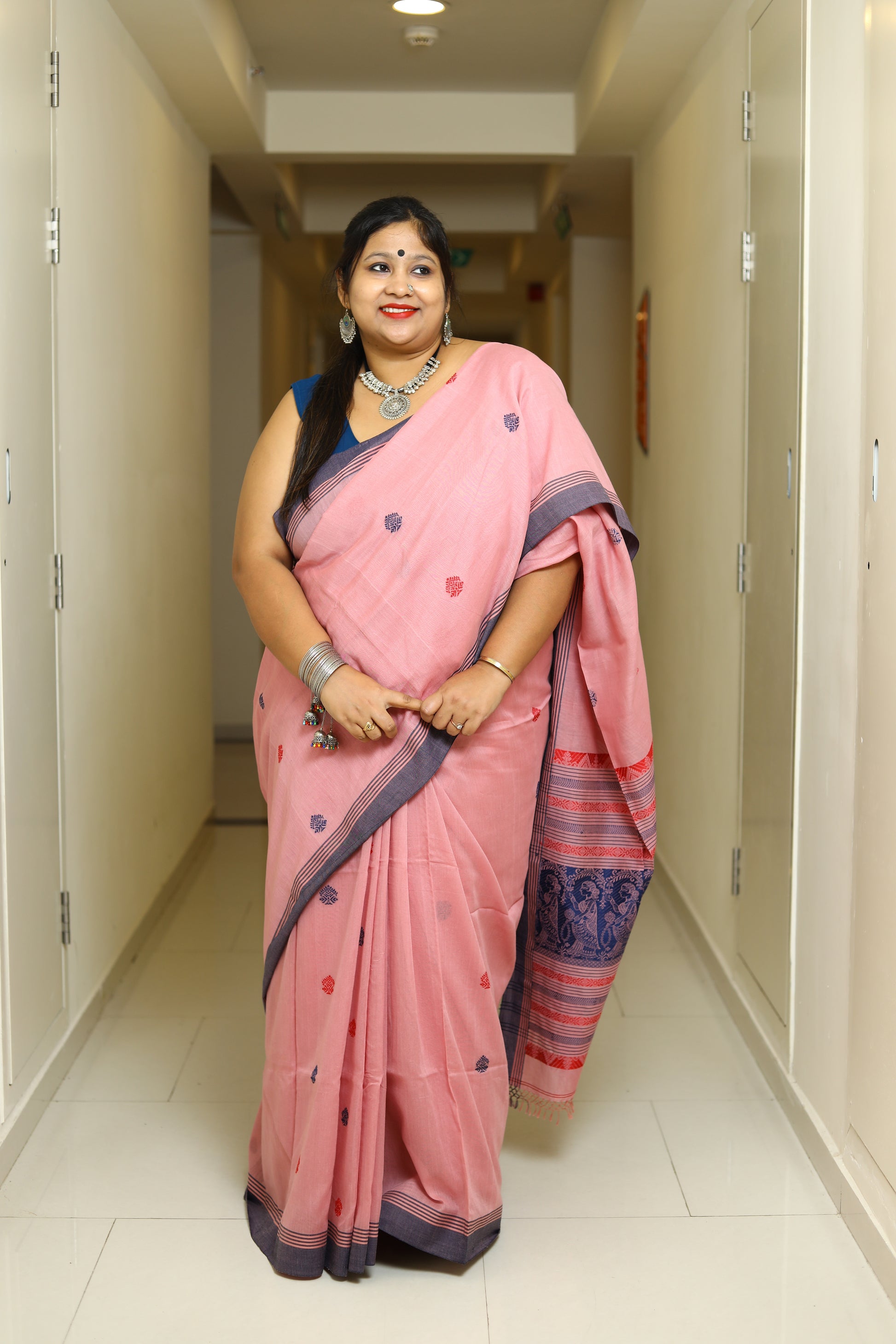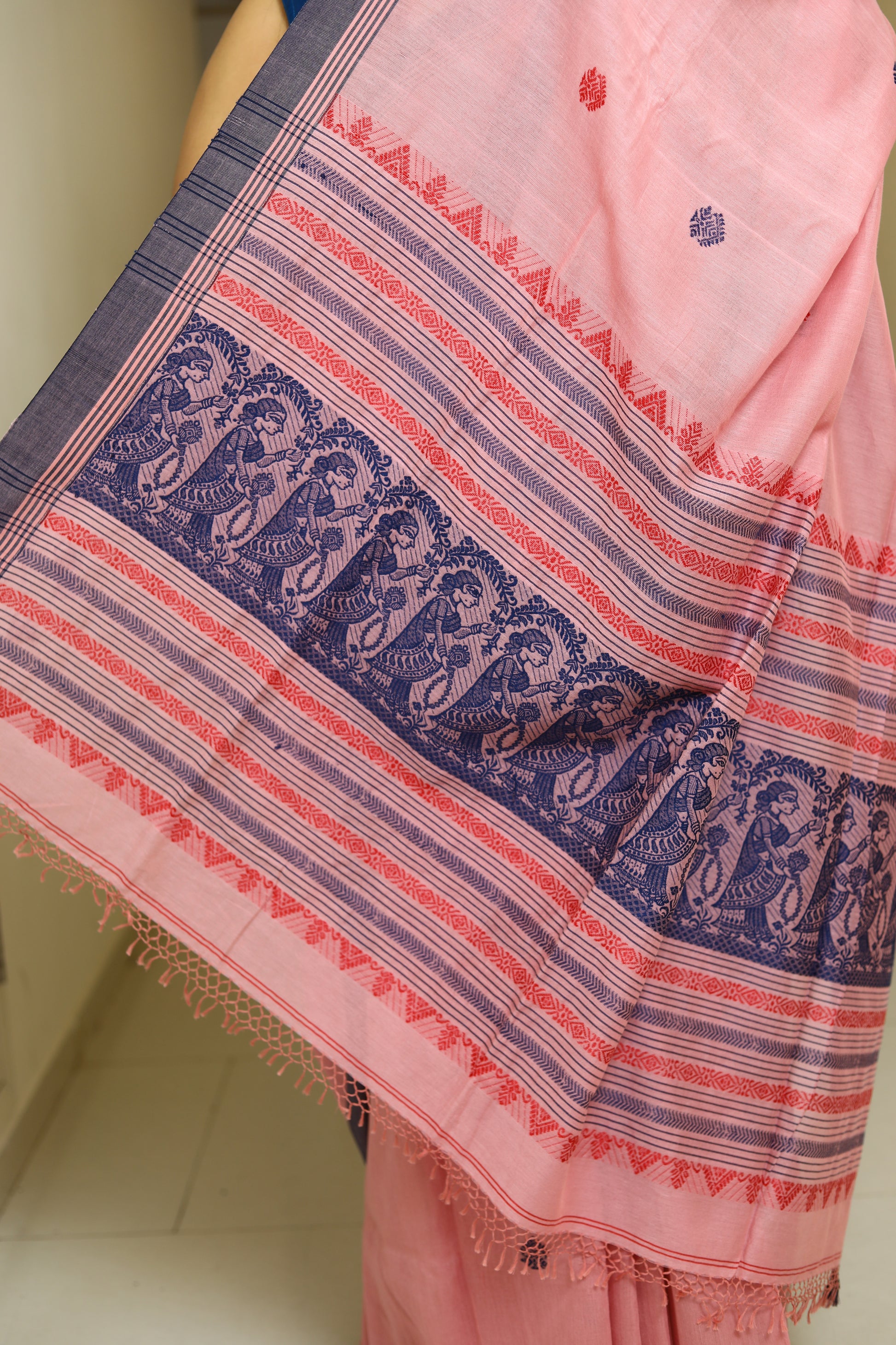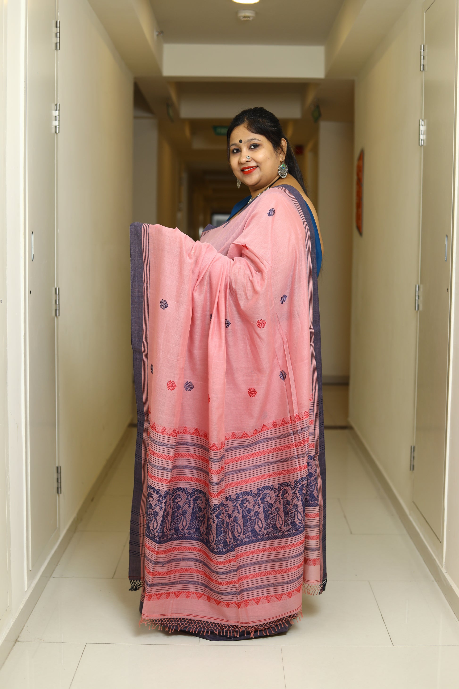 Pure cotton handloomed Baluchari sarees are exquisite traditional attire known for their rich heritage and intricate artistry. Originating from Bengal, these sarees are characterized by their soft, breathable fabric and vibrant colors.