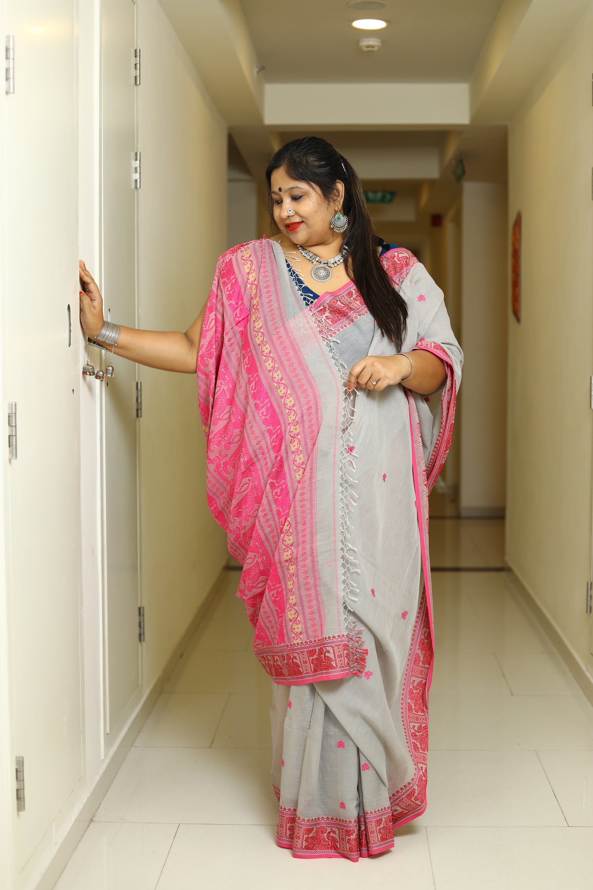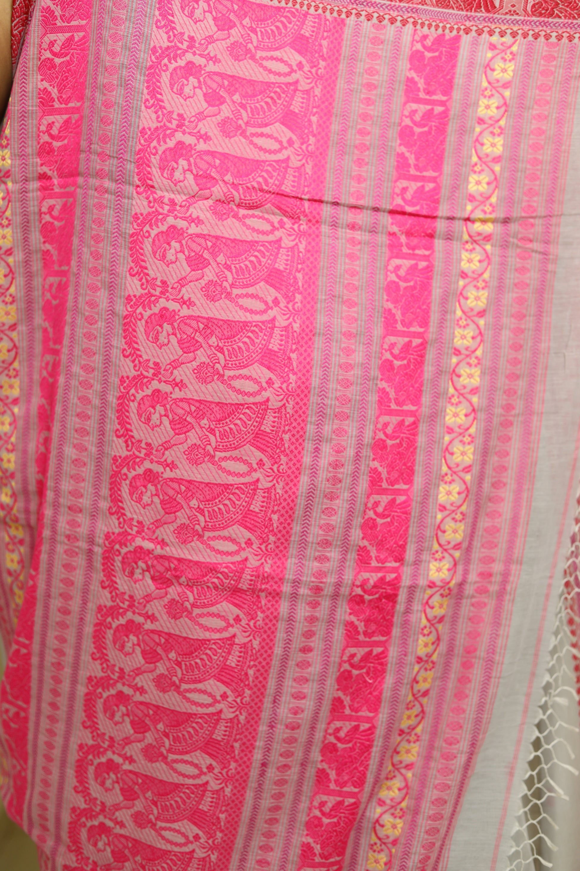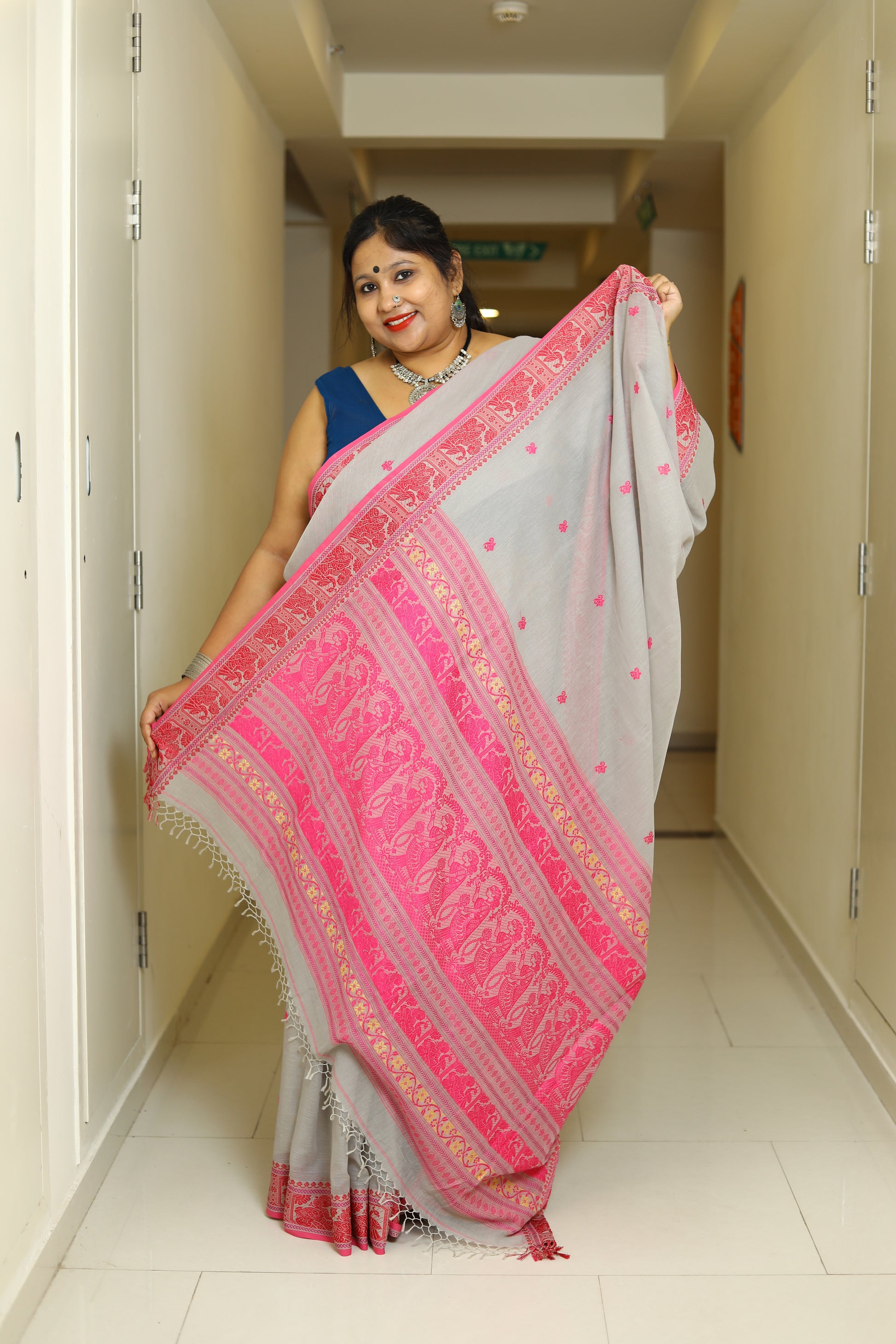 Pure cotton handloomed Baluchari sarees are exquisite traditional attire known for their rich heritage and intricate artistry. Originating from Bengal, these sarees are characterized by their soft, breathable fabric and vibrant colors.