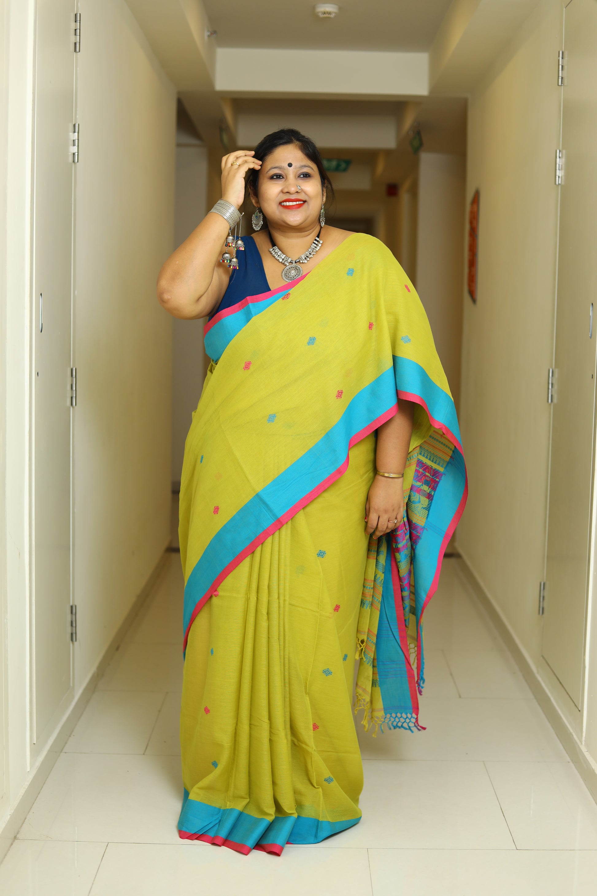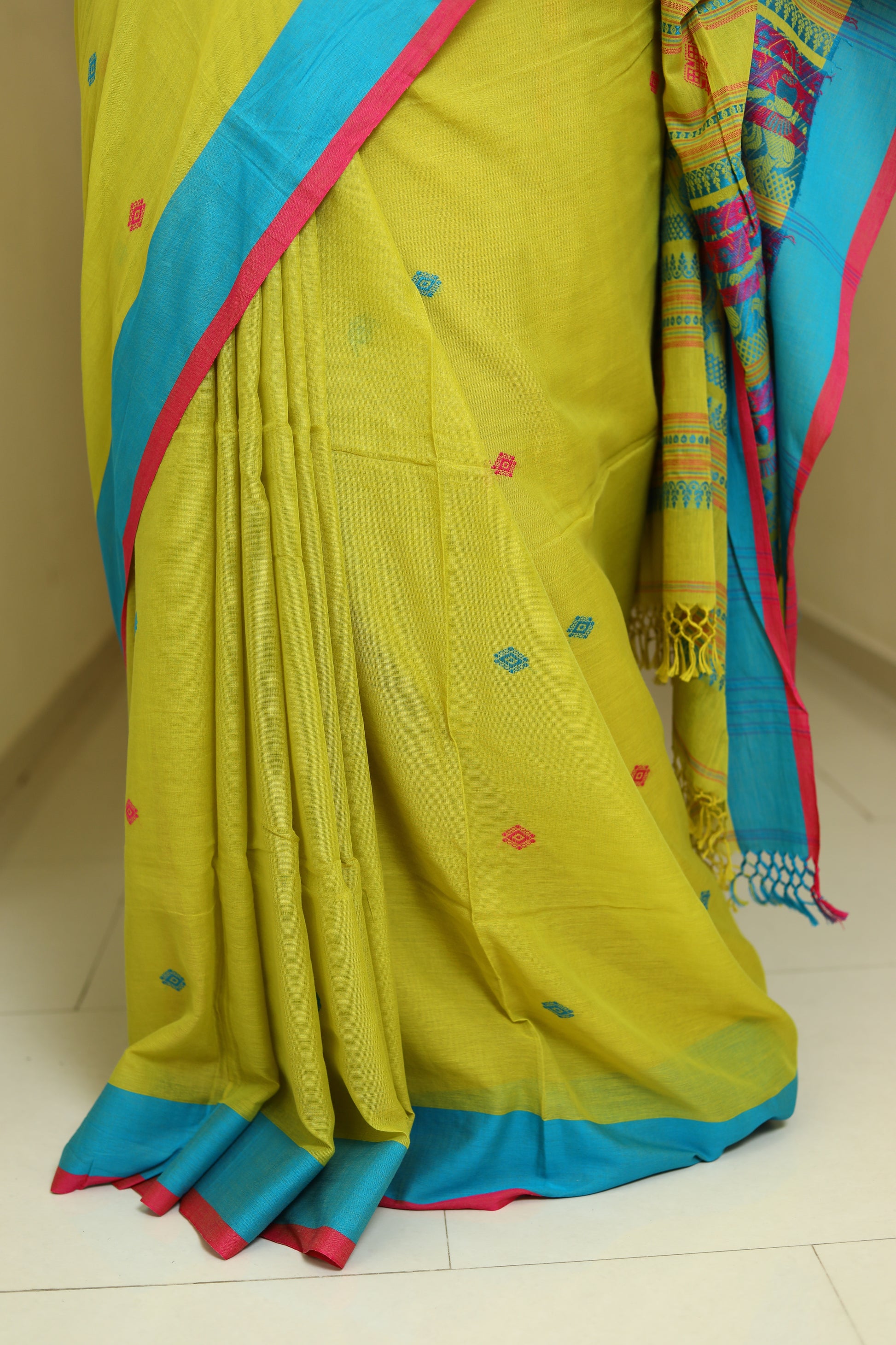 The hallmark of Baluchari sarees is the detailed motifs woven into the pallu, often depicting mythological scenes or intricate designs, showcasing the skill of the weavers. The use of pure cotton makes them comfortable to wear, ideal for various occasions, from casual outings to festive celebrations.
