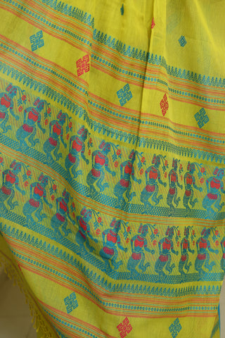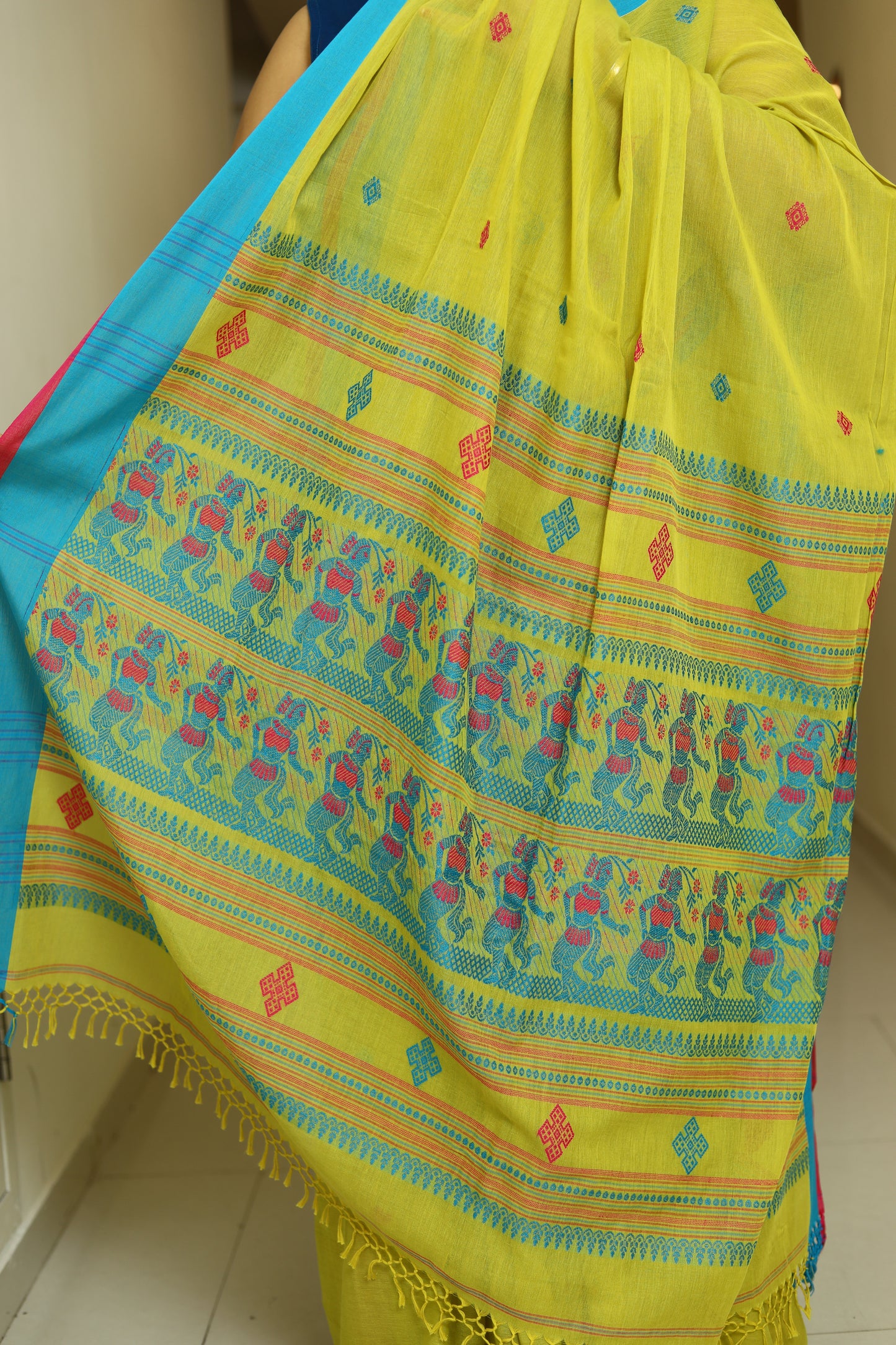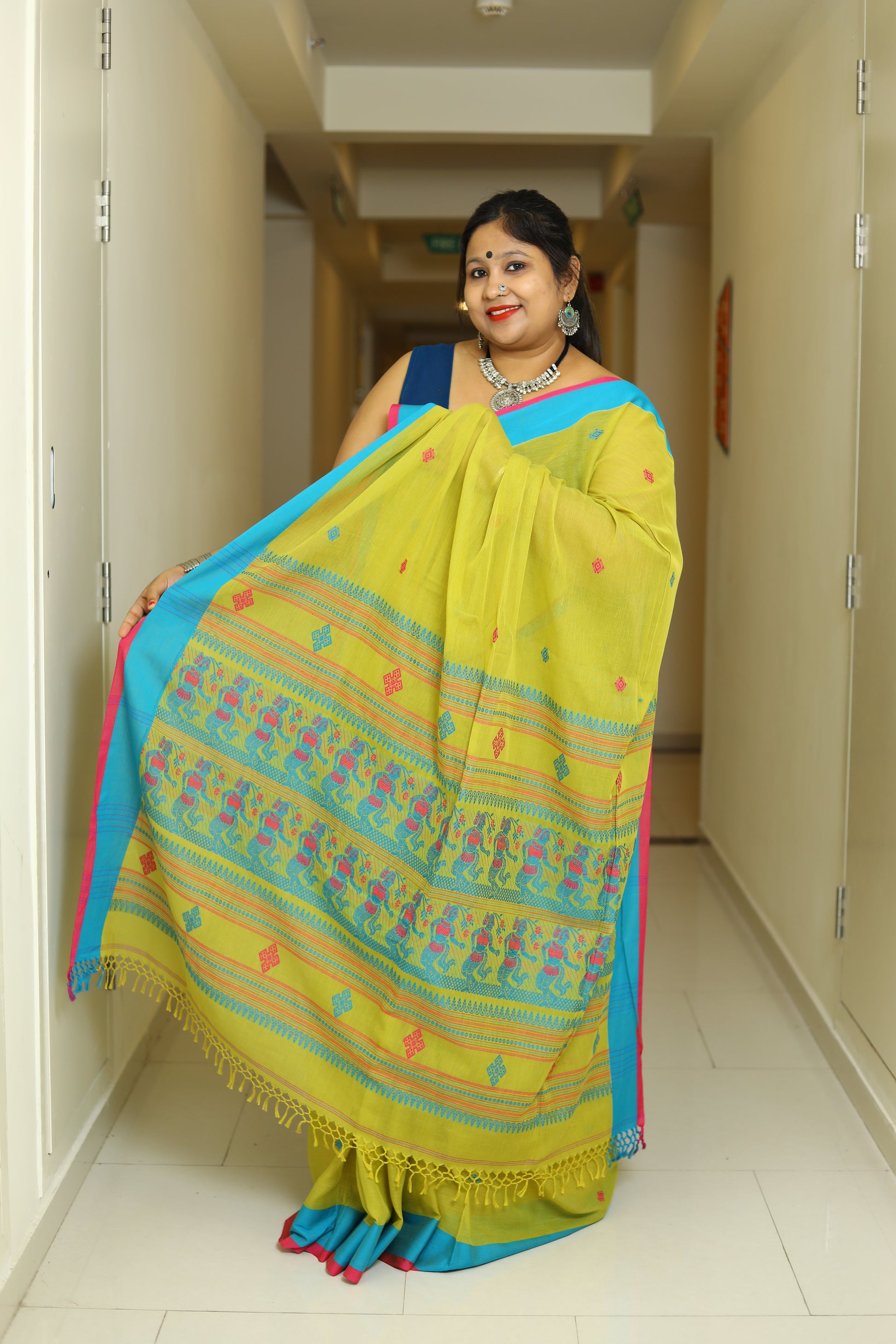 Pure cotton handloomed Baluchari sarees are exquisite traditional attire known for their rich heritage and intricate artistry. Originating from Bengal, these sarees are characterized by their soft, breathable fabric and vibrant colors.