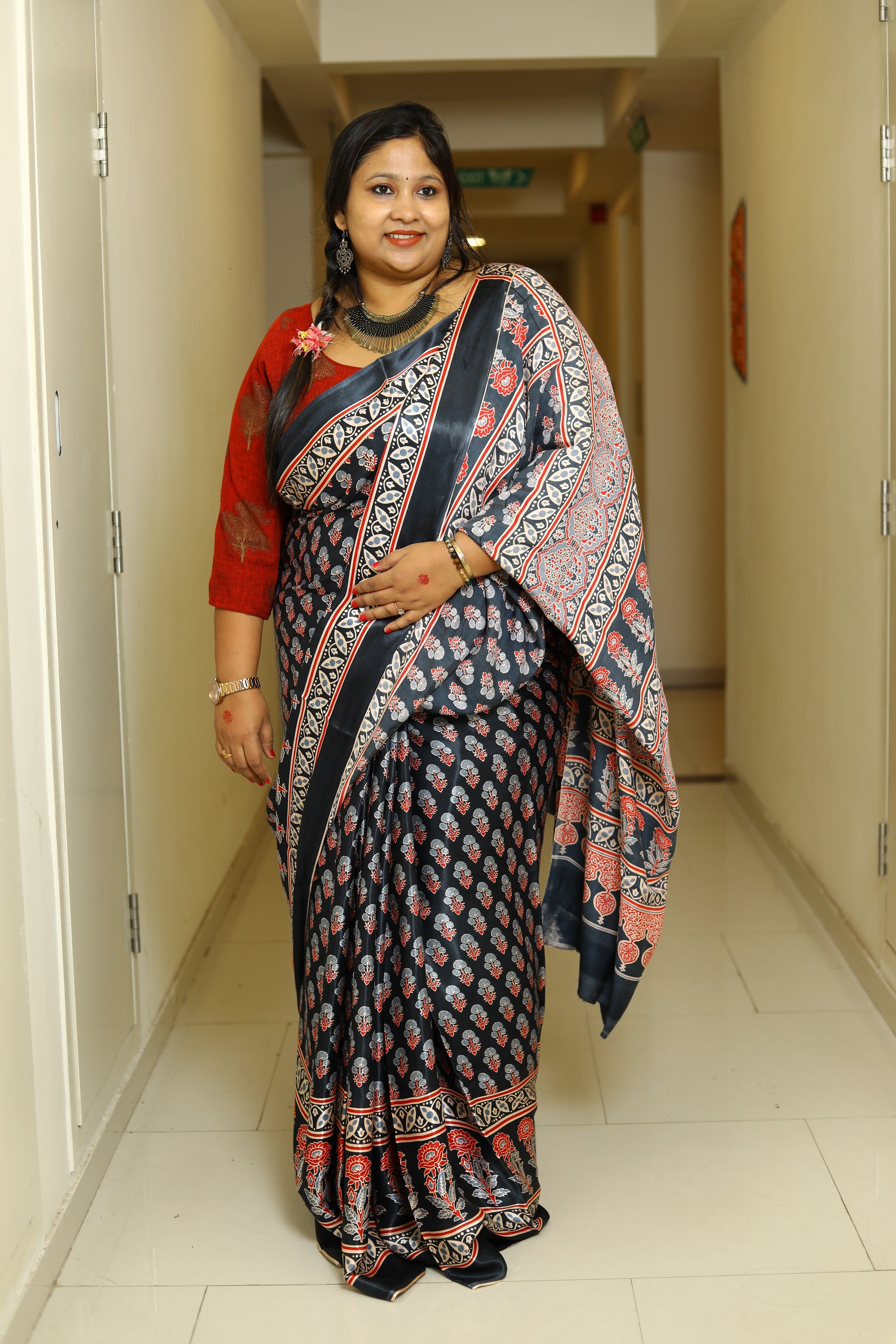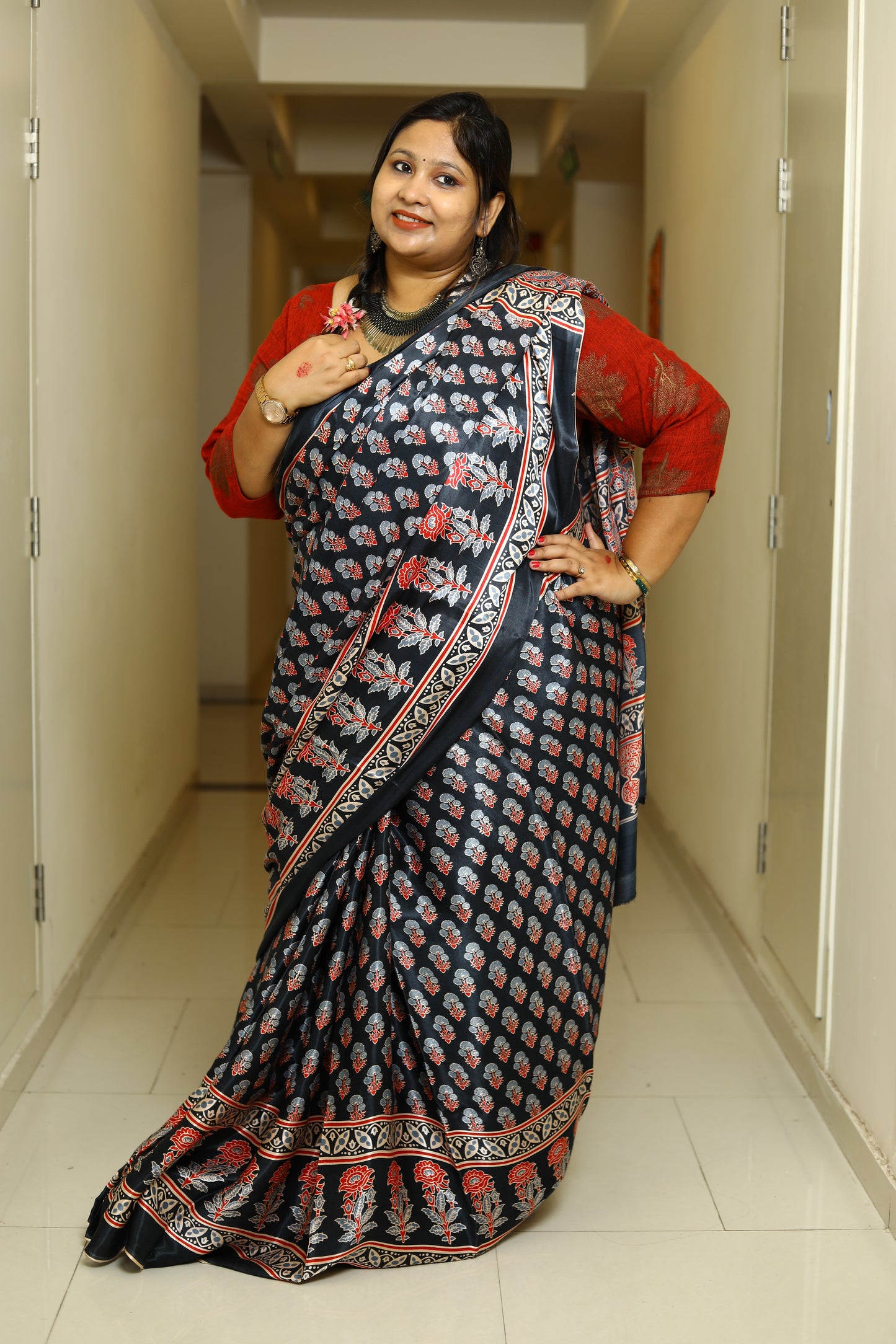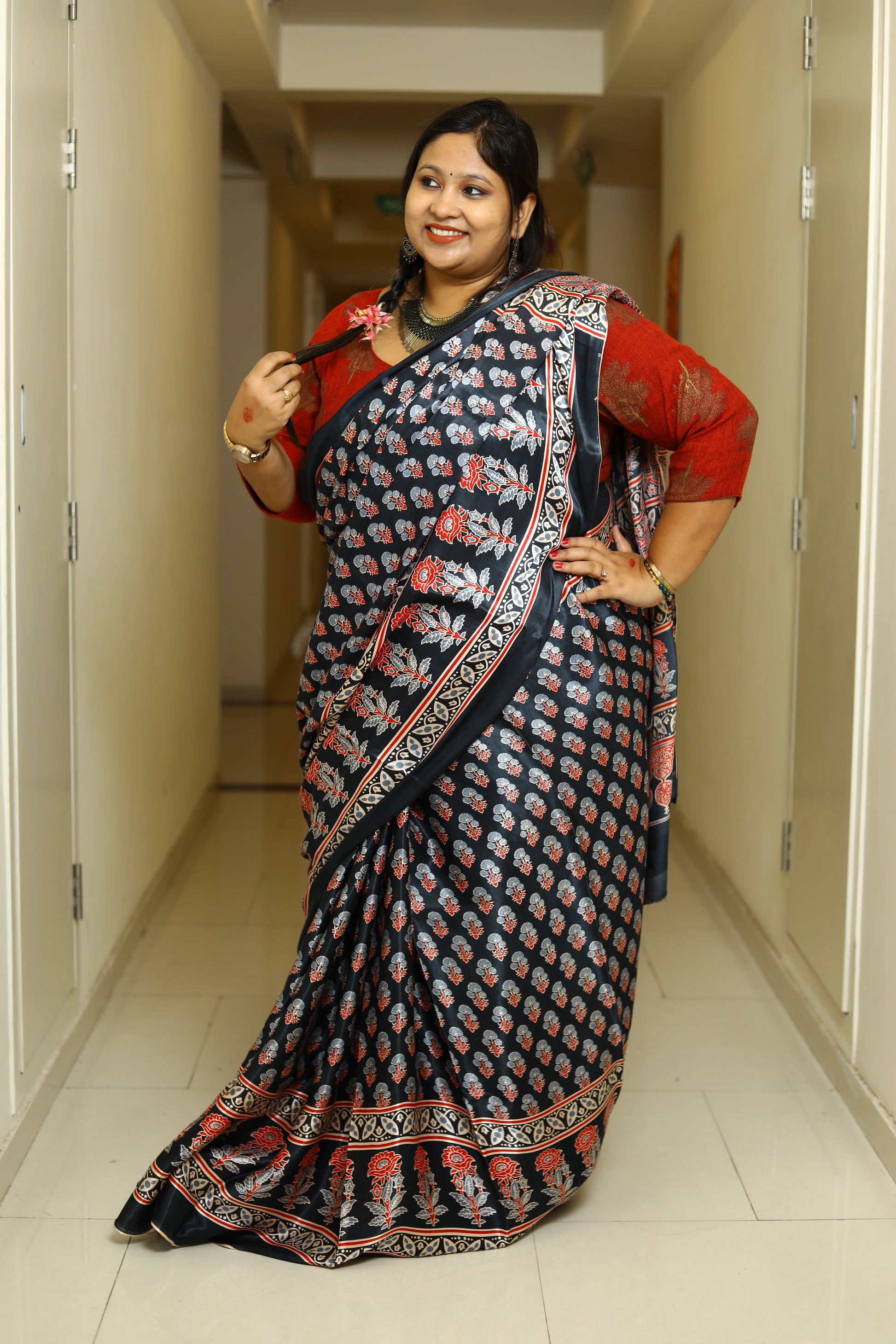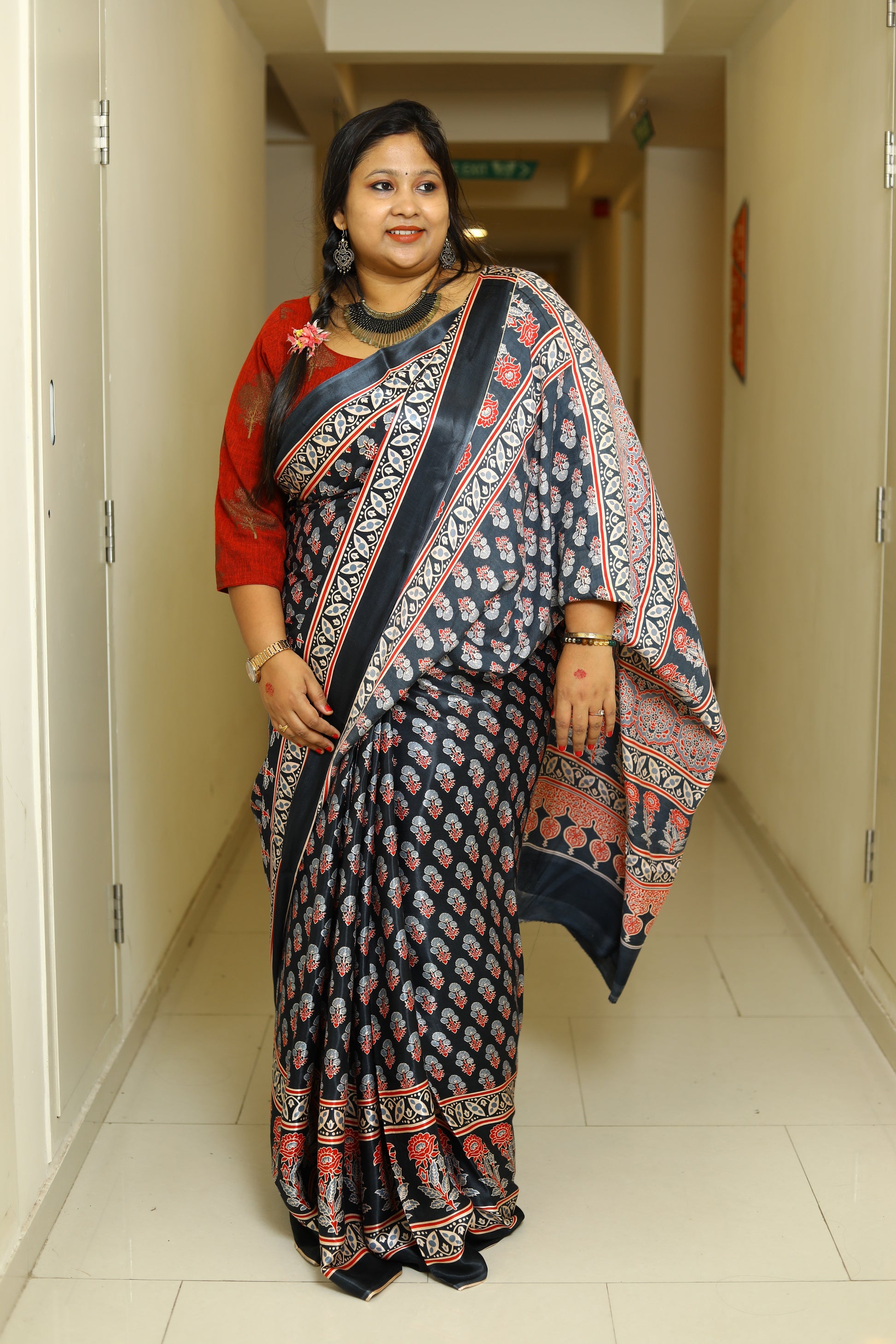 Sayantanee Acharjee The Midnight Mystique saree is so versatileI wore it for a formal dinner, and it was absolutely superb. The rich color and design made me eel confident and classy all nighlong.