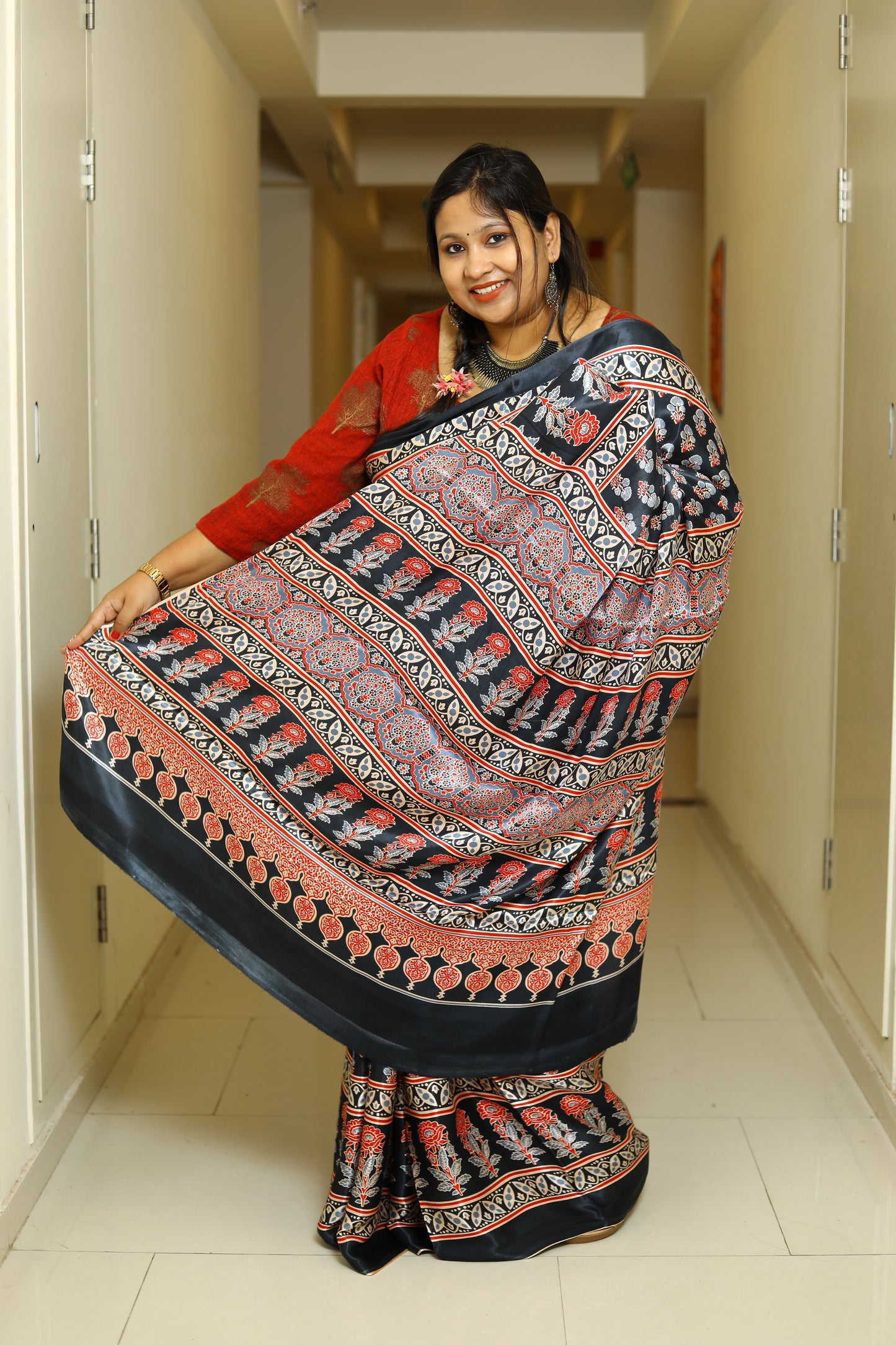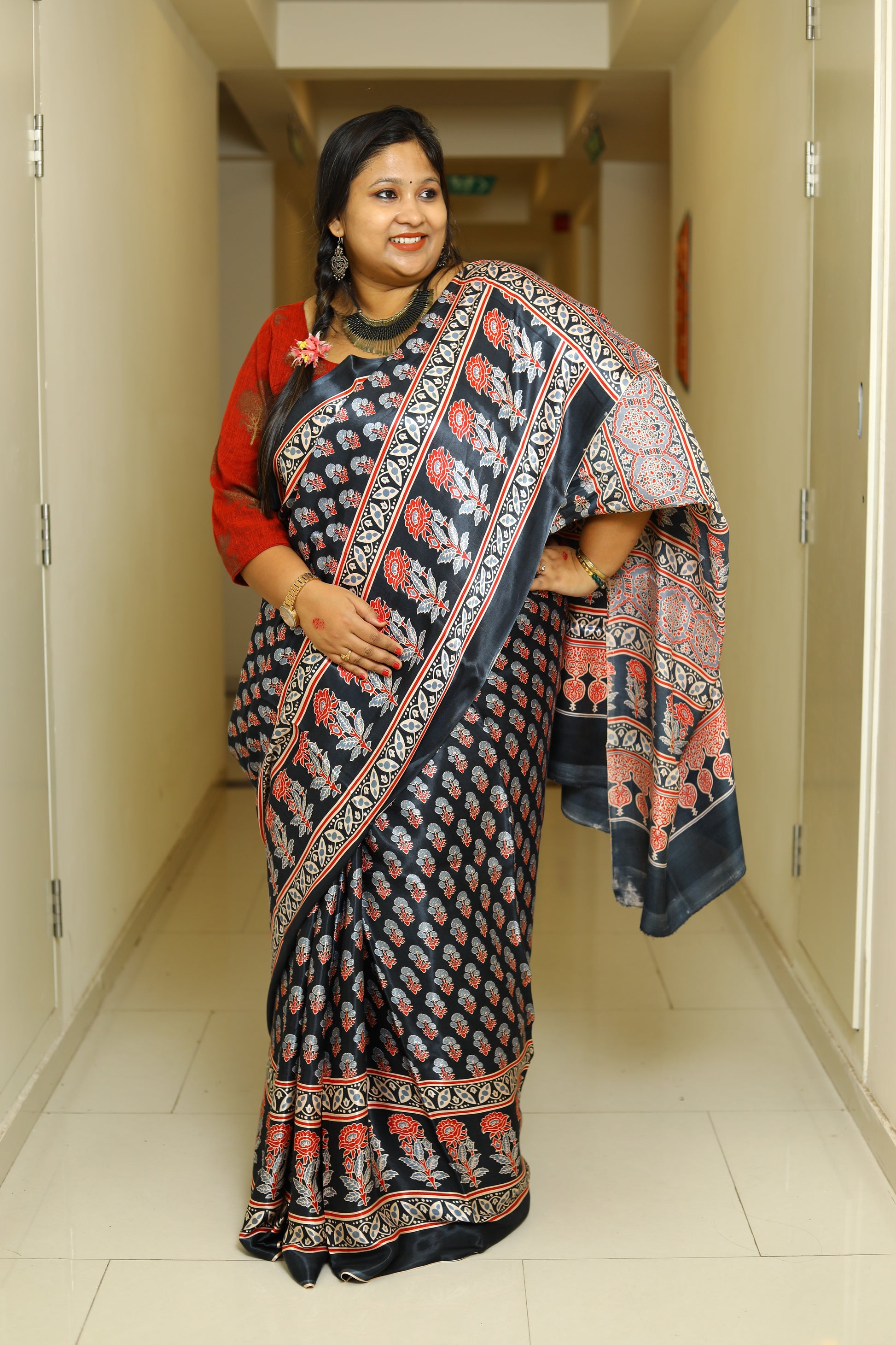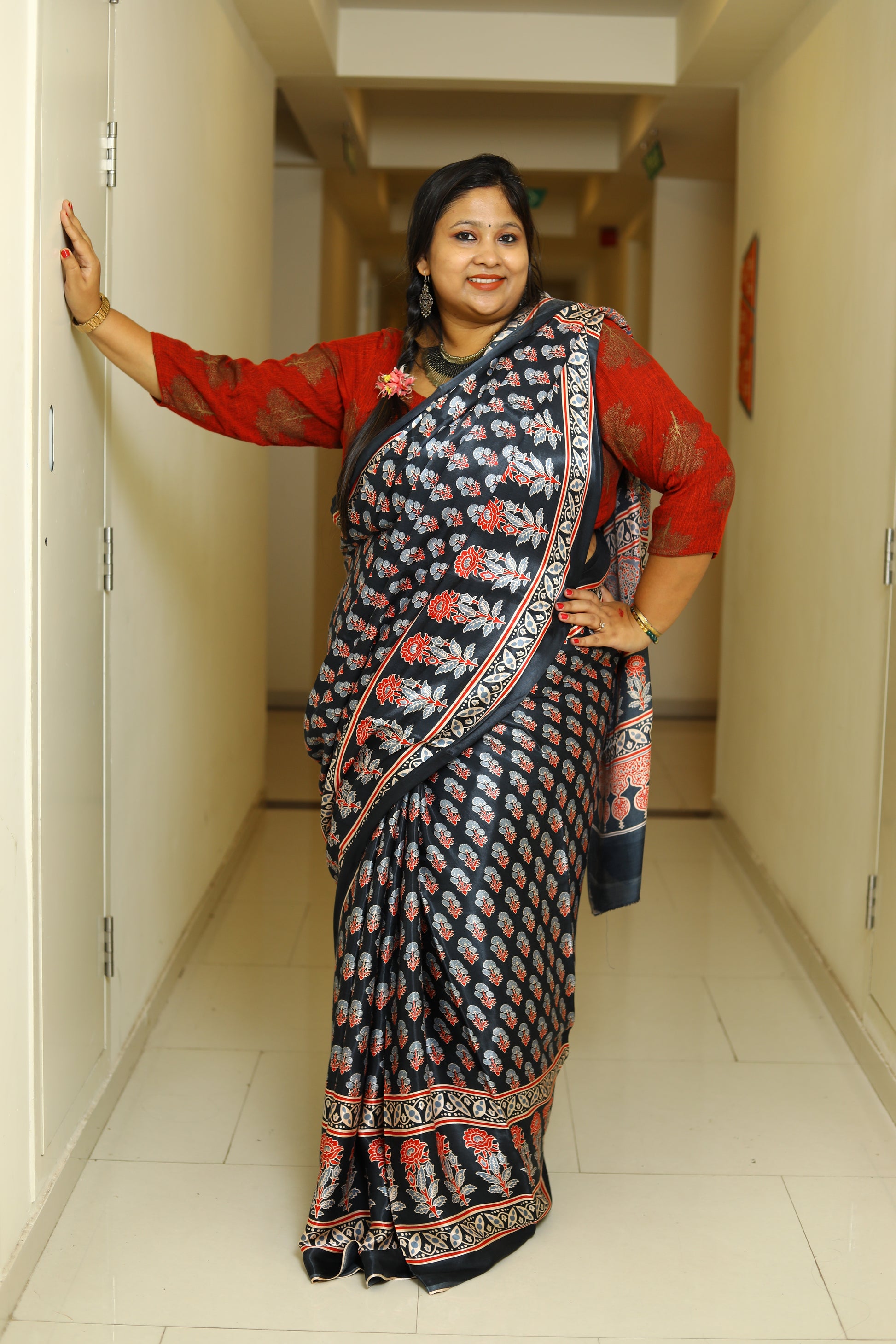 Sayantanee Acharjee The Midnight Mystique saree is so versatileI wore it for a formal dinner, and it was absolutely superb. The rich color and design made me eel confident and classy all nighlong.