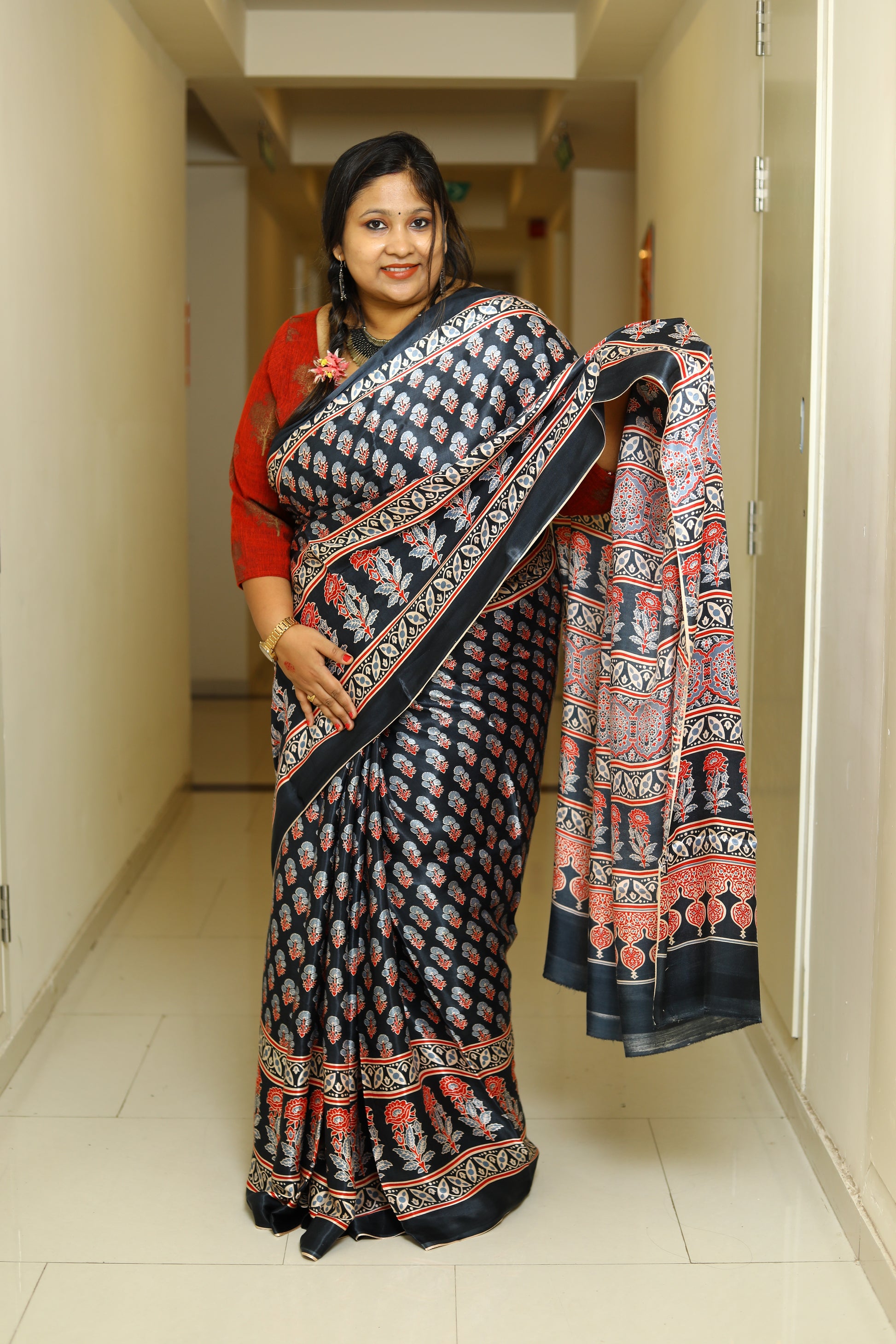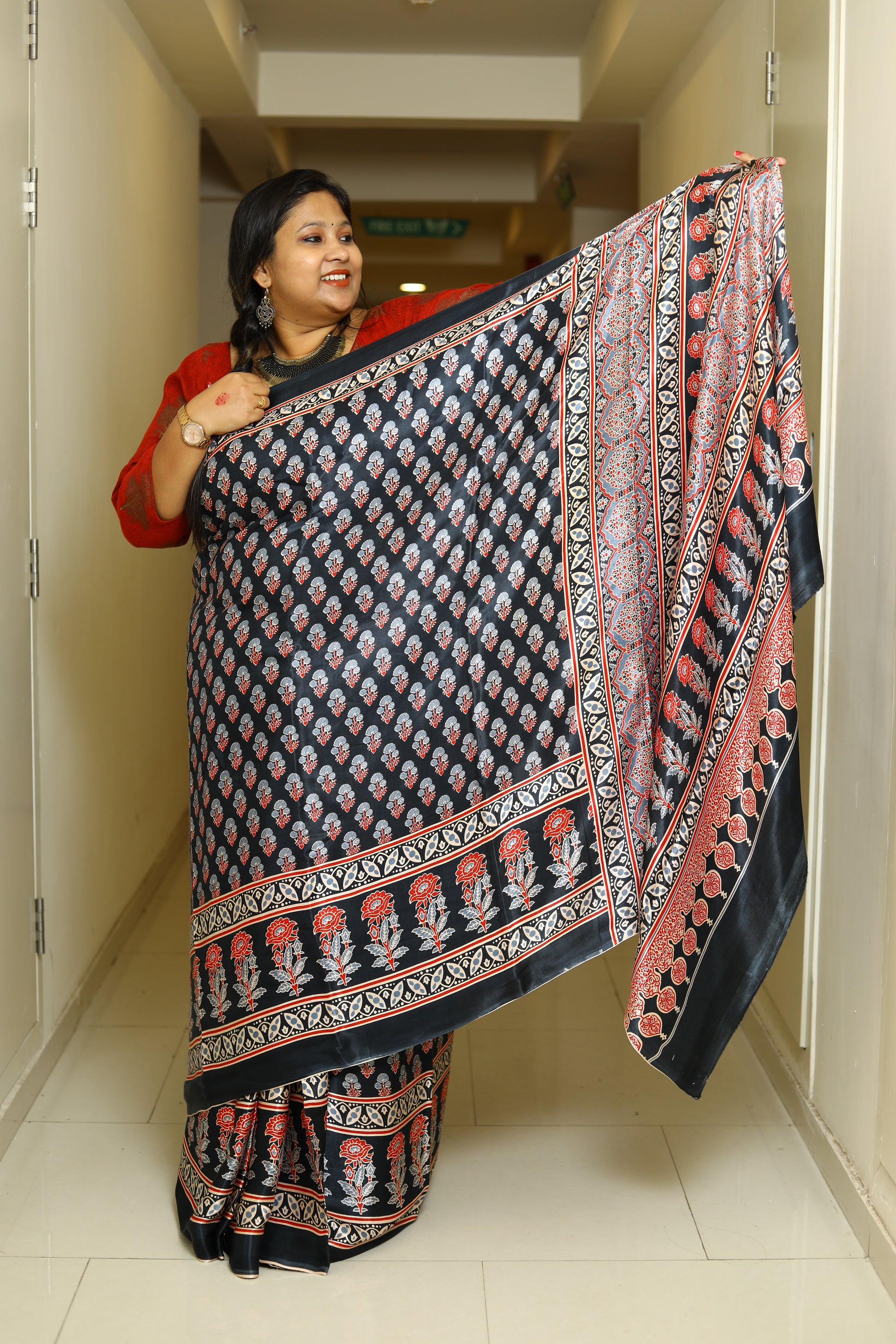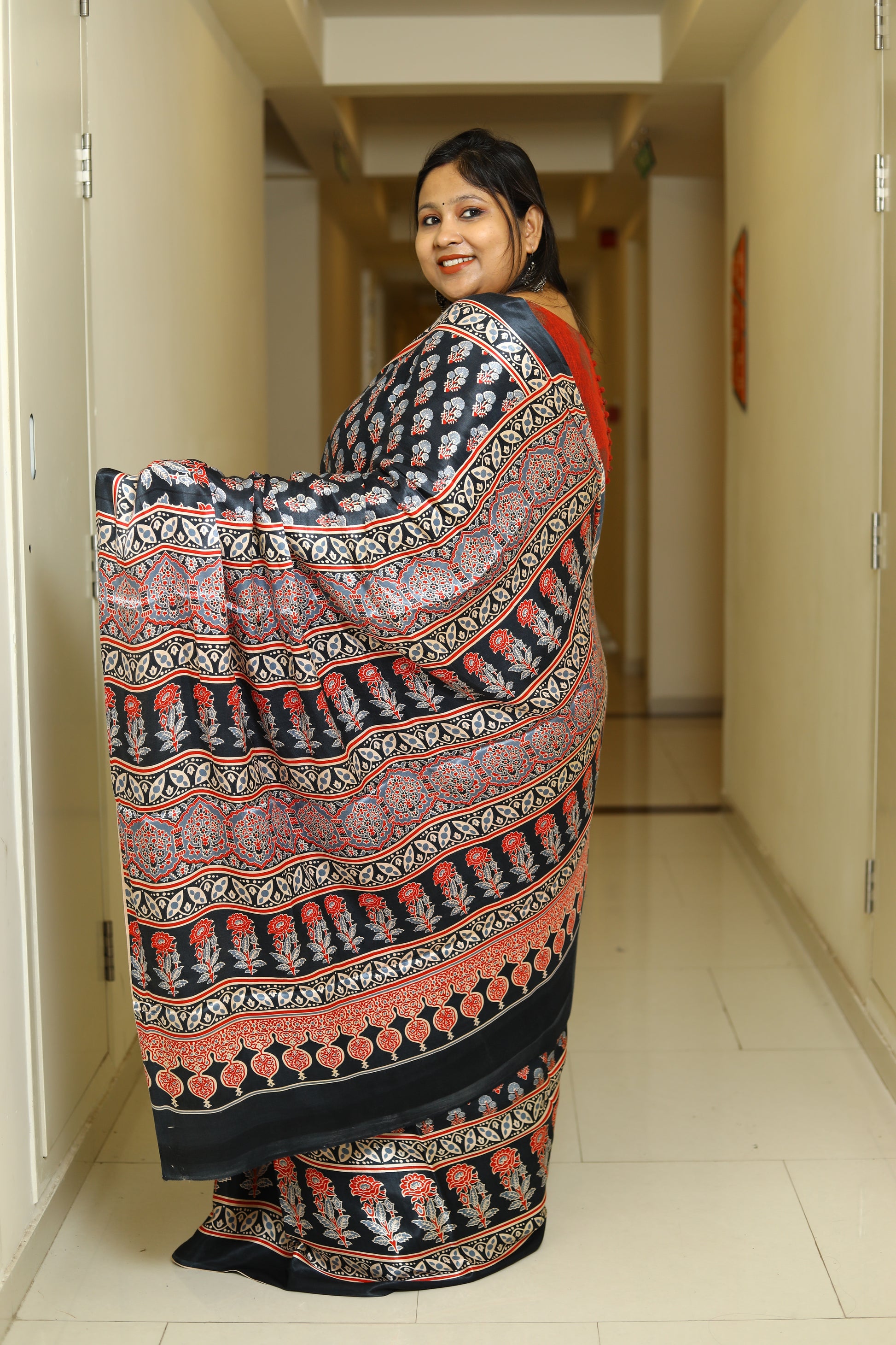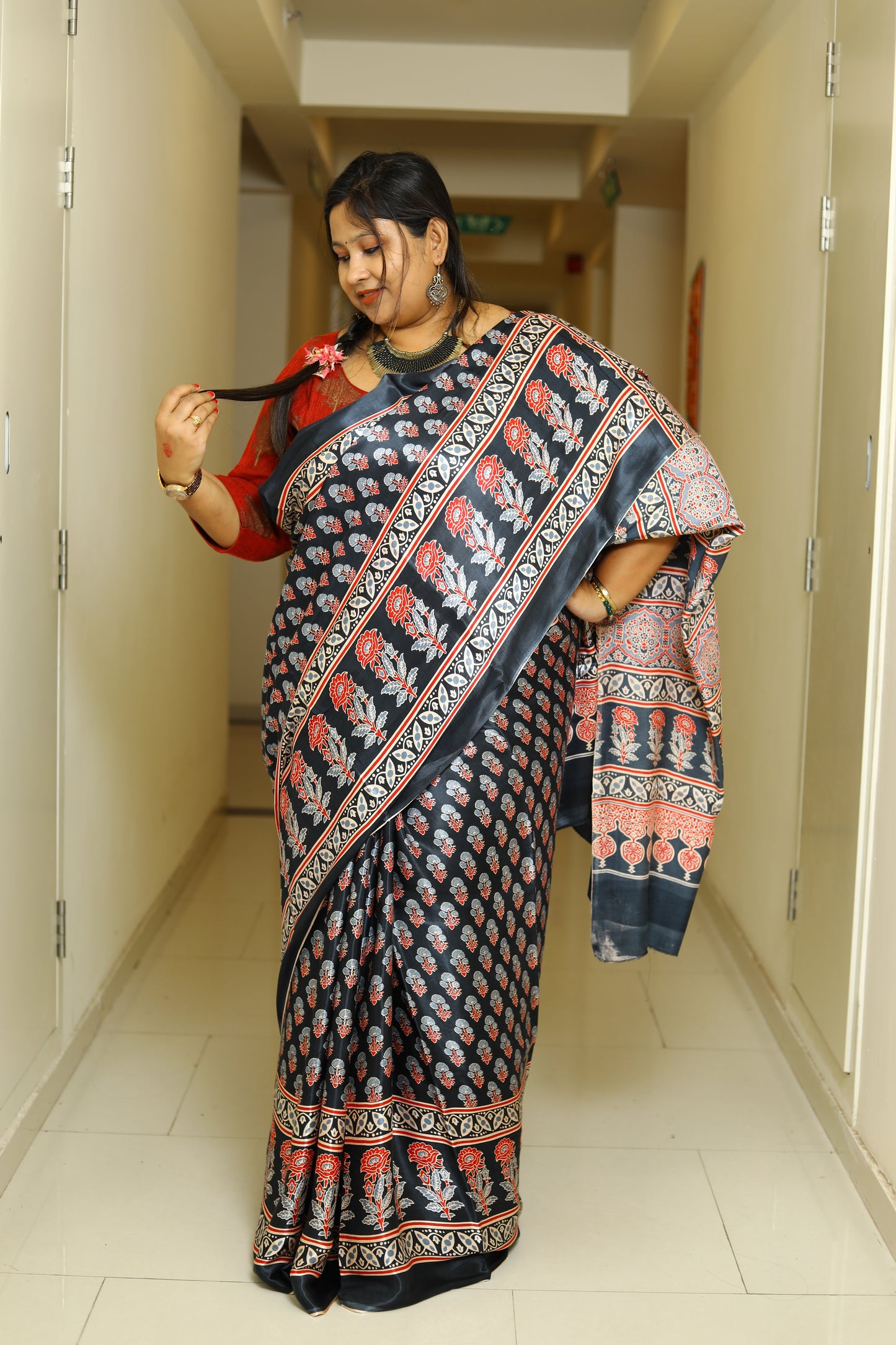Sayantanee Acharjee The Midnight Mystique saree is so versatileI wore it for a formal dinner, and it was absolutely superb. The rich color and design made me eel confident and classy all nighlong.