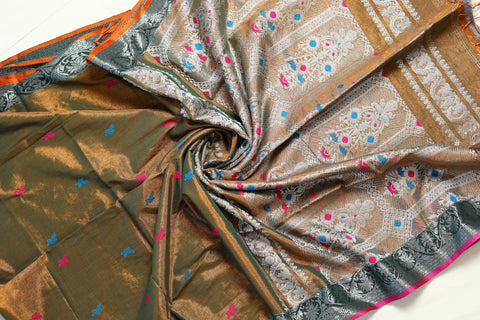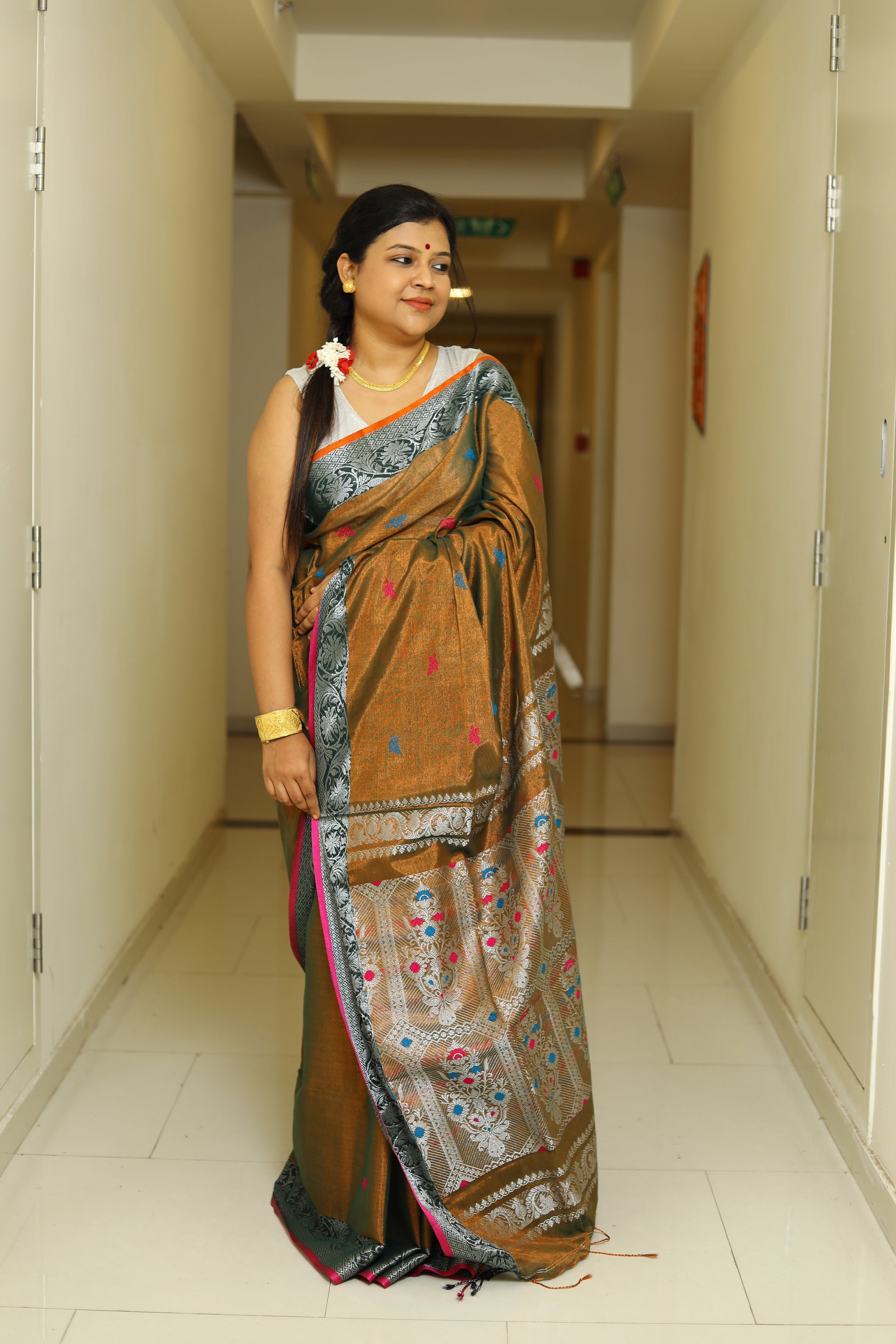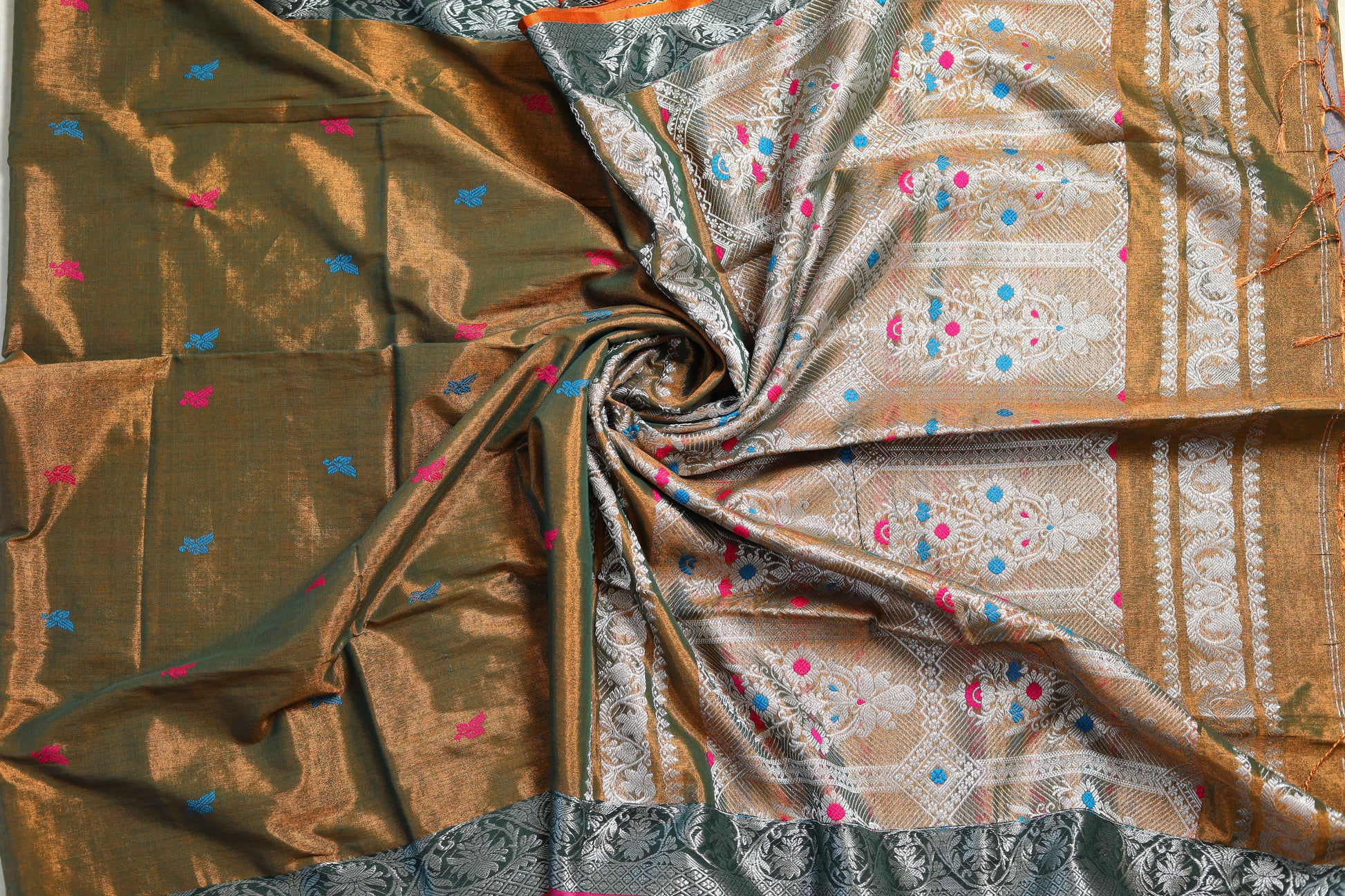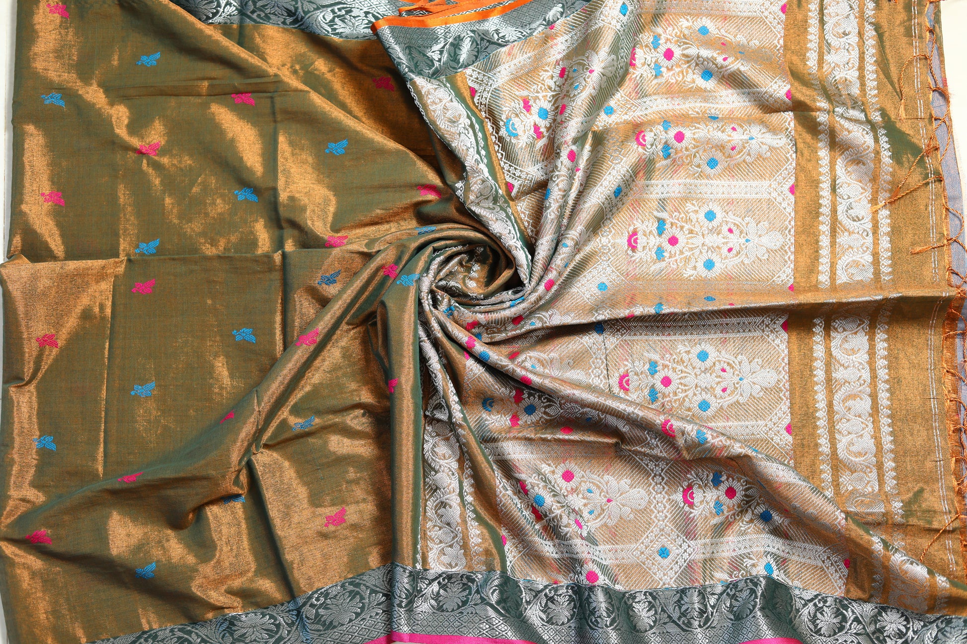 Embrace the spirit of the festive season with our stunning tissue linen Benarasi saree. This exquisite piece combines the lightweight elegance of tissue linen with the rich heritage of Benarasi weaving, making it a perfect choice for celebrations. Adorned with intricate designs and a lustrous sheen, the saree drapes beautifully, enhancing your natural grace. Ideal for festive gatherings, family celebrations, or traditional events, this saree offers comfort without compromising on style. Elevate your festive wardrobe and make a statement with this timeless piece that reflects artistry and tradition. Celebrate in style and let your elegance shine!