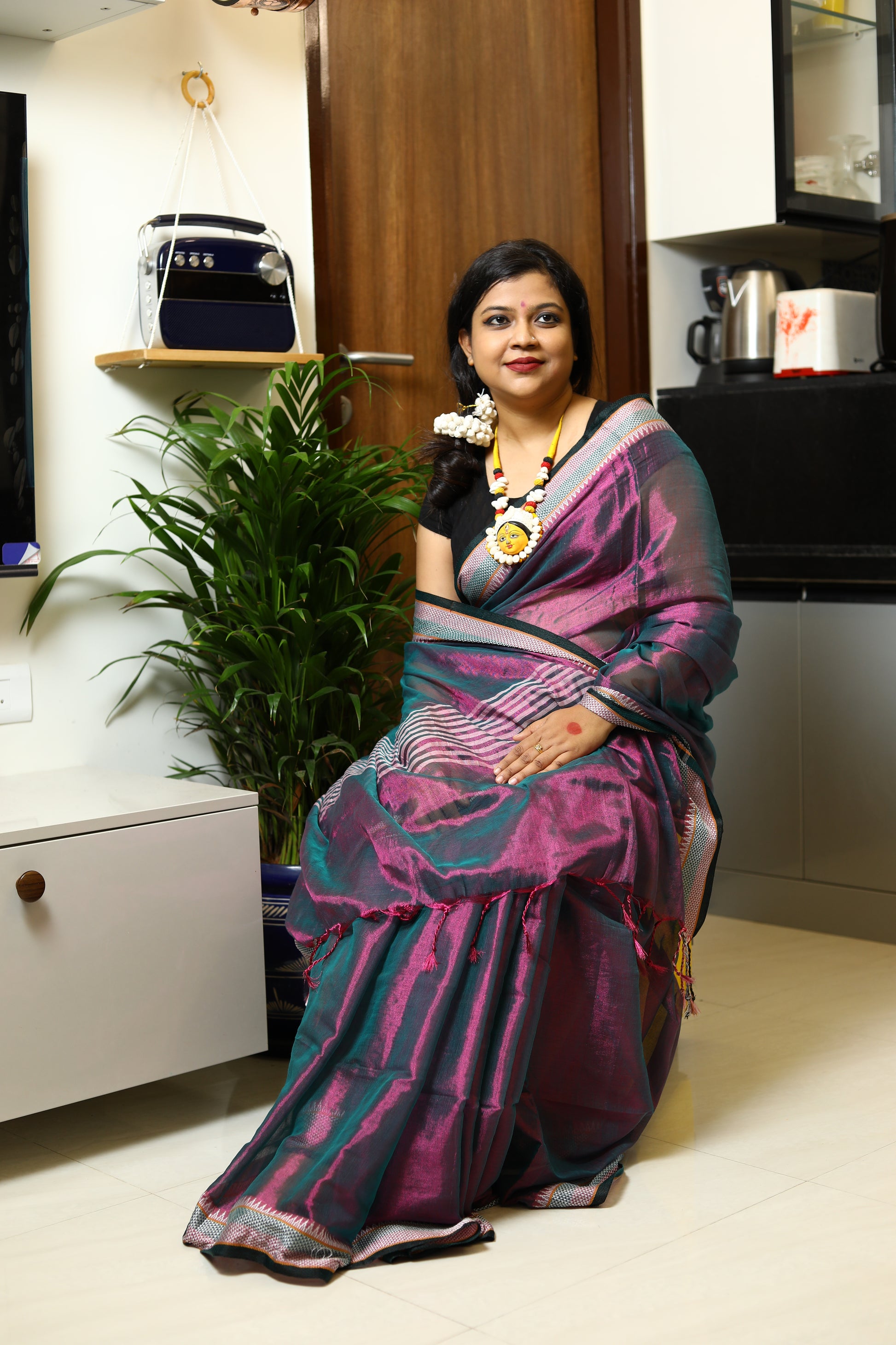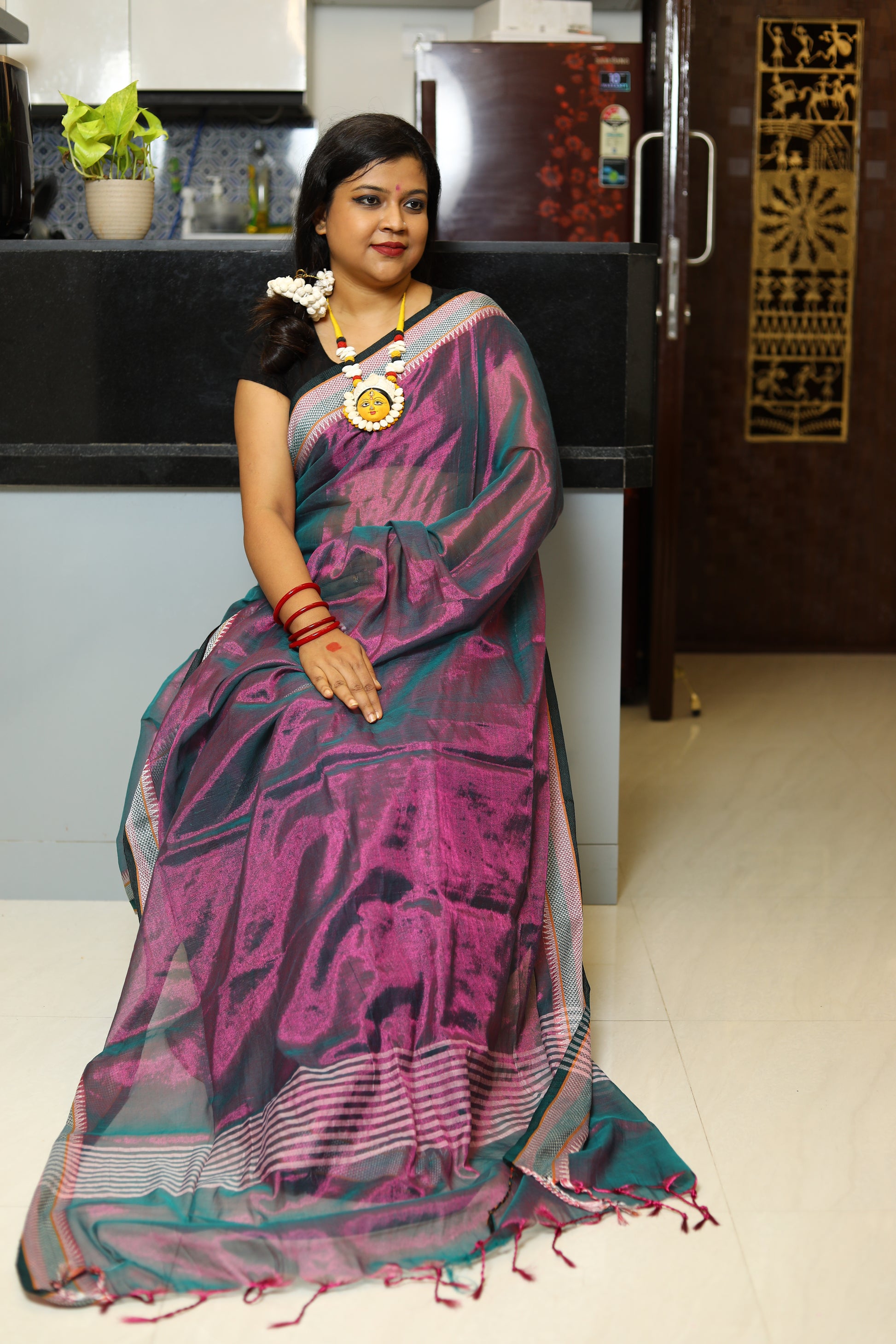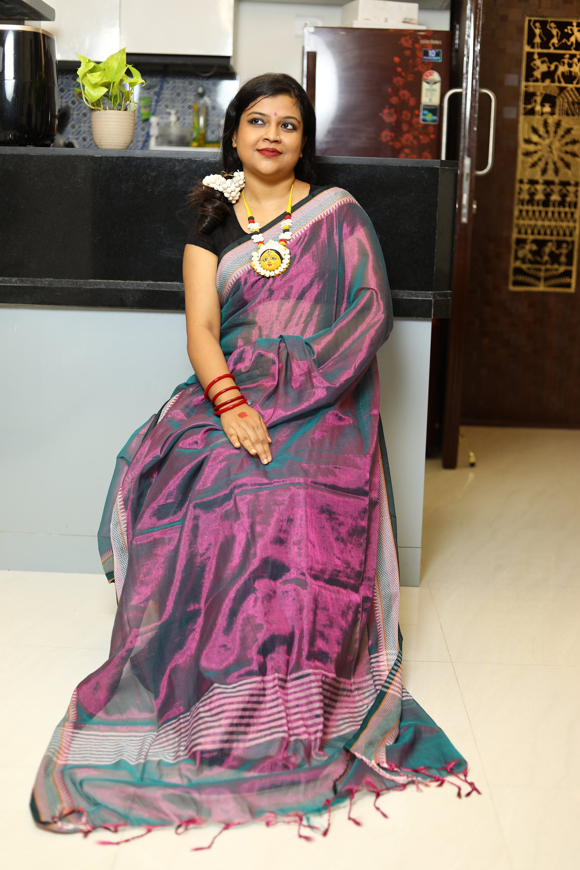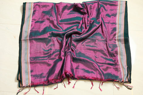 A stunning blend of elegance and comfort, crafted to make you shine on every occasion. This gorgeous saree features a delicate shimmer, while the linen base ensures a breathable, lightweight feel. Whether you're attending a festive celebration, a wedding, or a special event, this saree drapes effortlessly, offering both grace and ease. Its subtle sheen adds a touch of glamour, making it the perfect choice for those who seek a refined, timeless look.