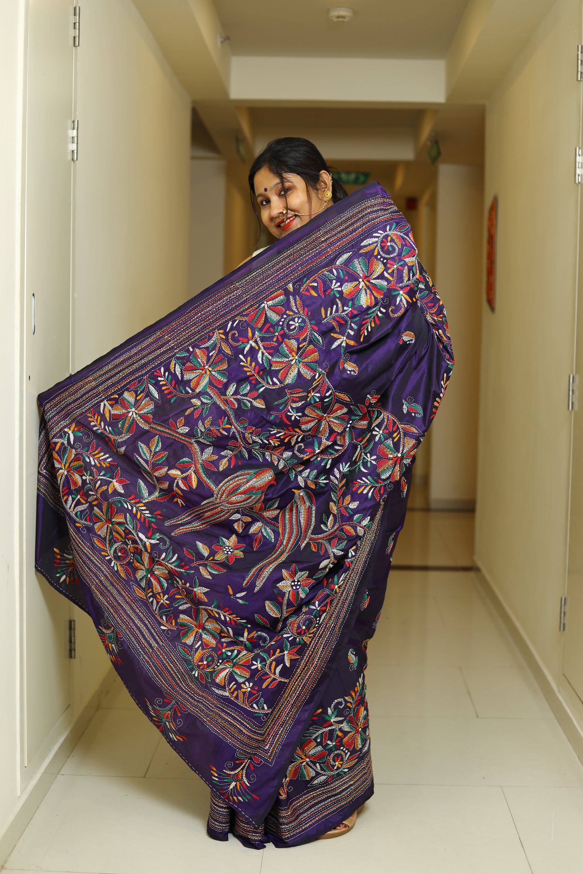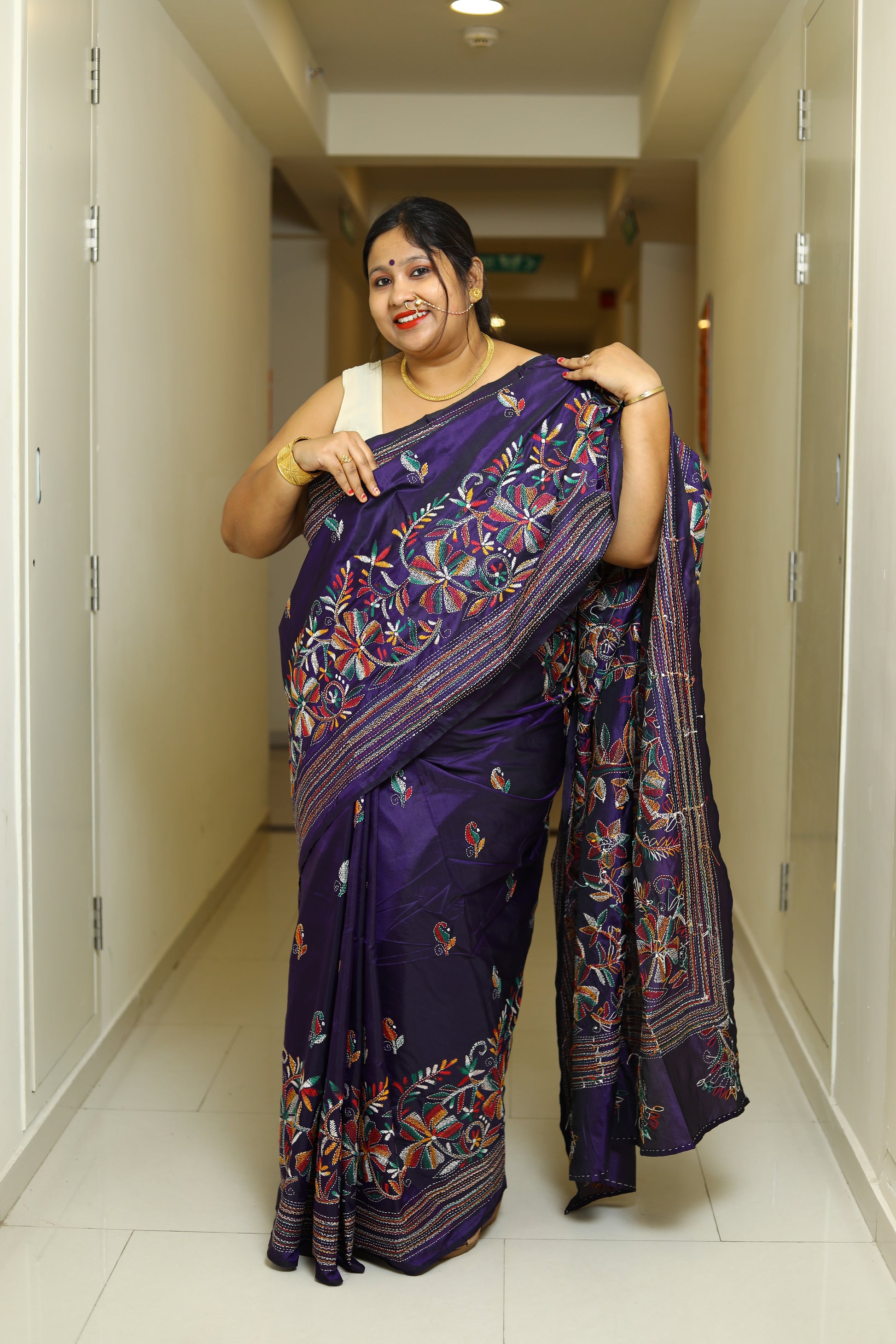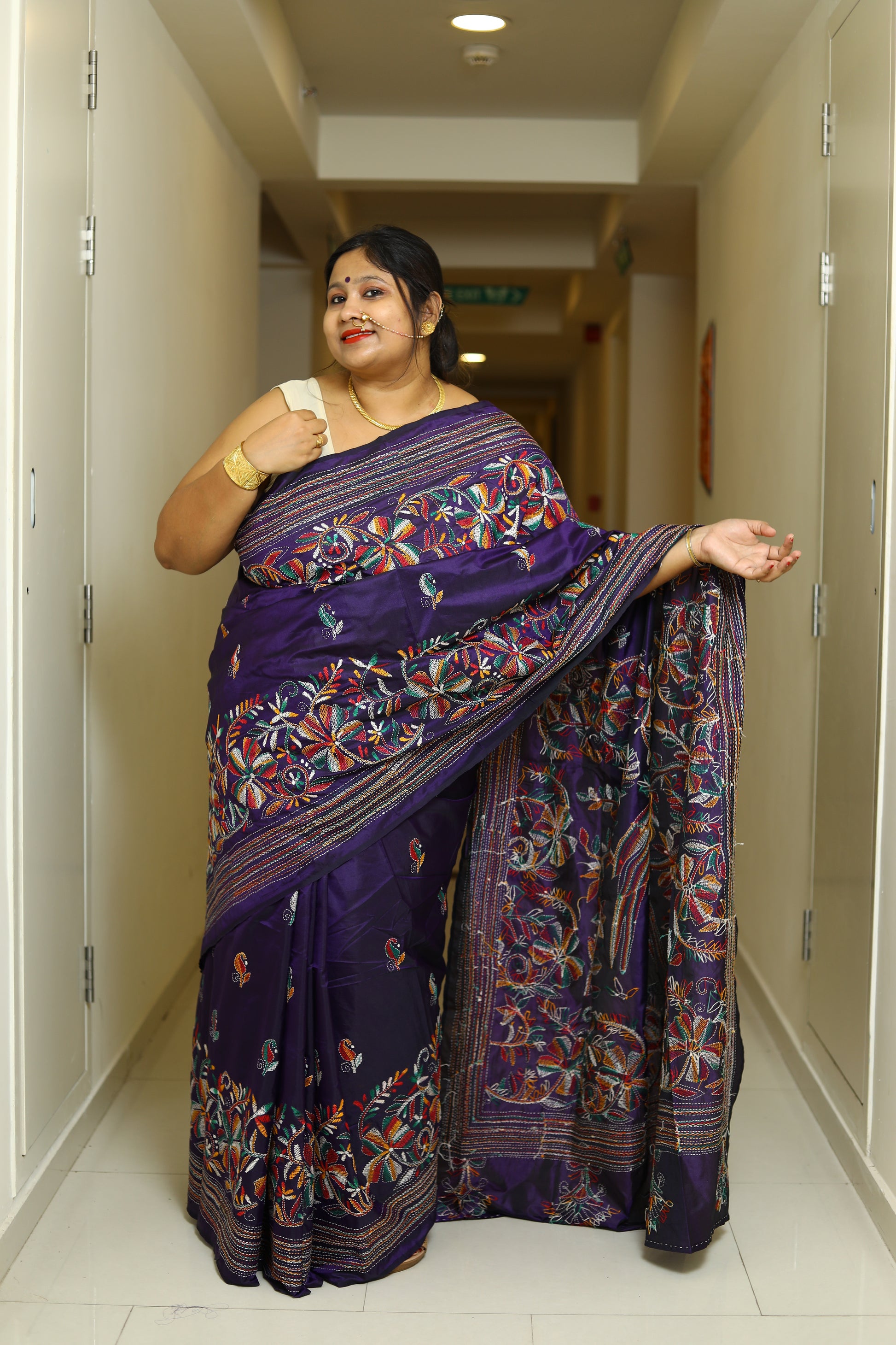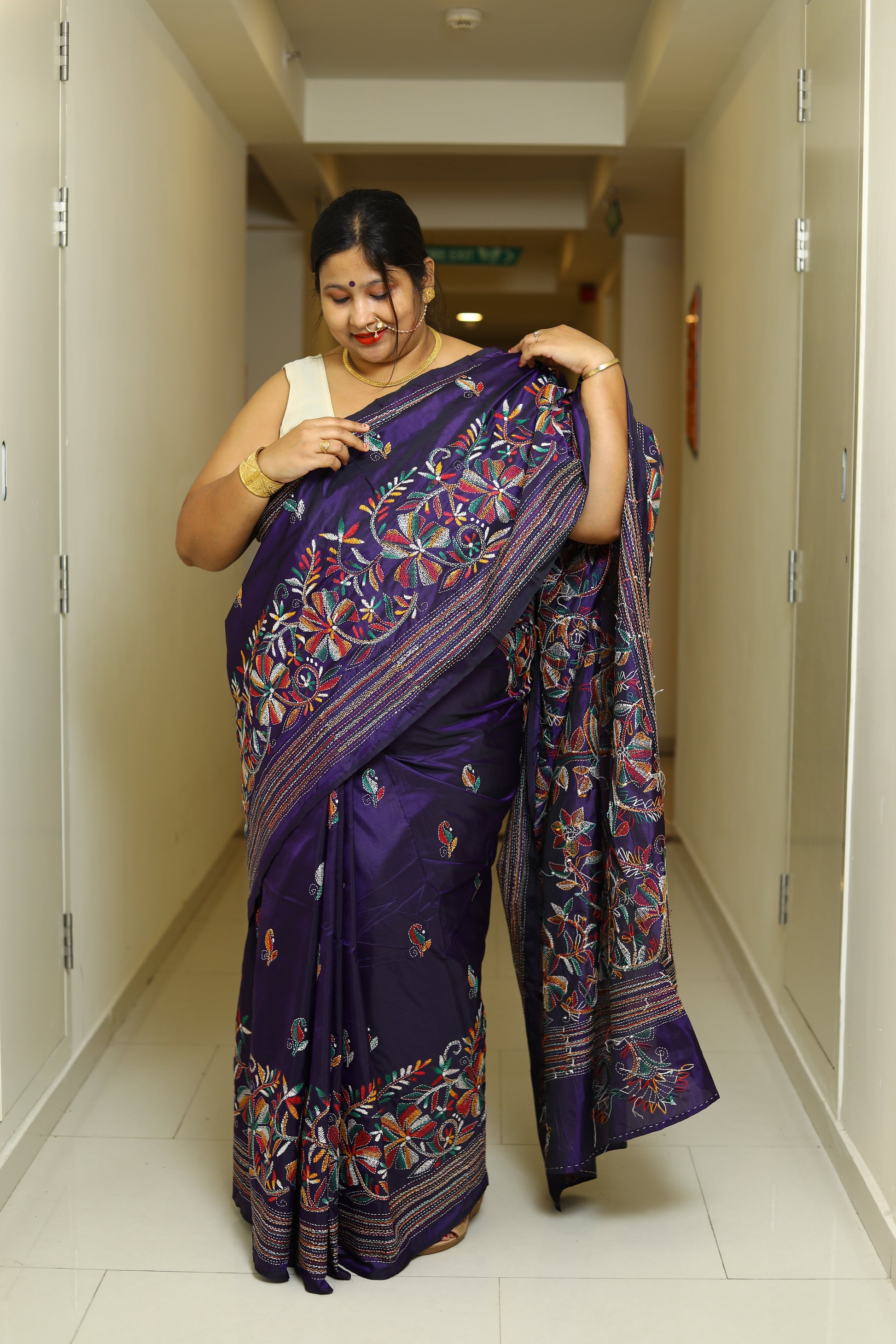 Kantha sarees are a traditional form of hand-embroidered sarees, originating from Bengal. Known for their intricate stitching, they feature beautiful motifs inspired by nature, daily life, and folklore. The embroidery is done using simple running stitches, often layered, creating unique textures and designs. Each Kantha saree tells a story, making it a timeless symbol of artistic craftsmanship and cultural heritage.