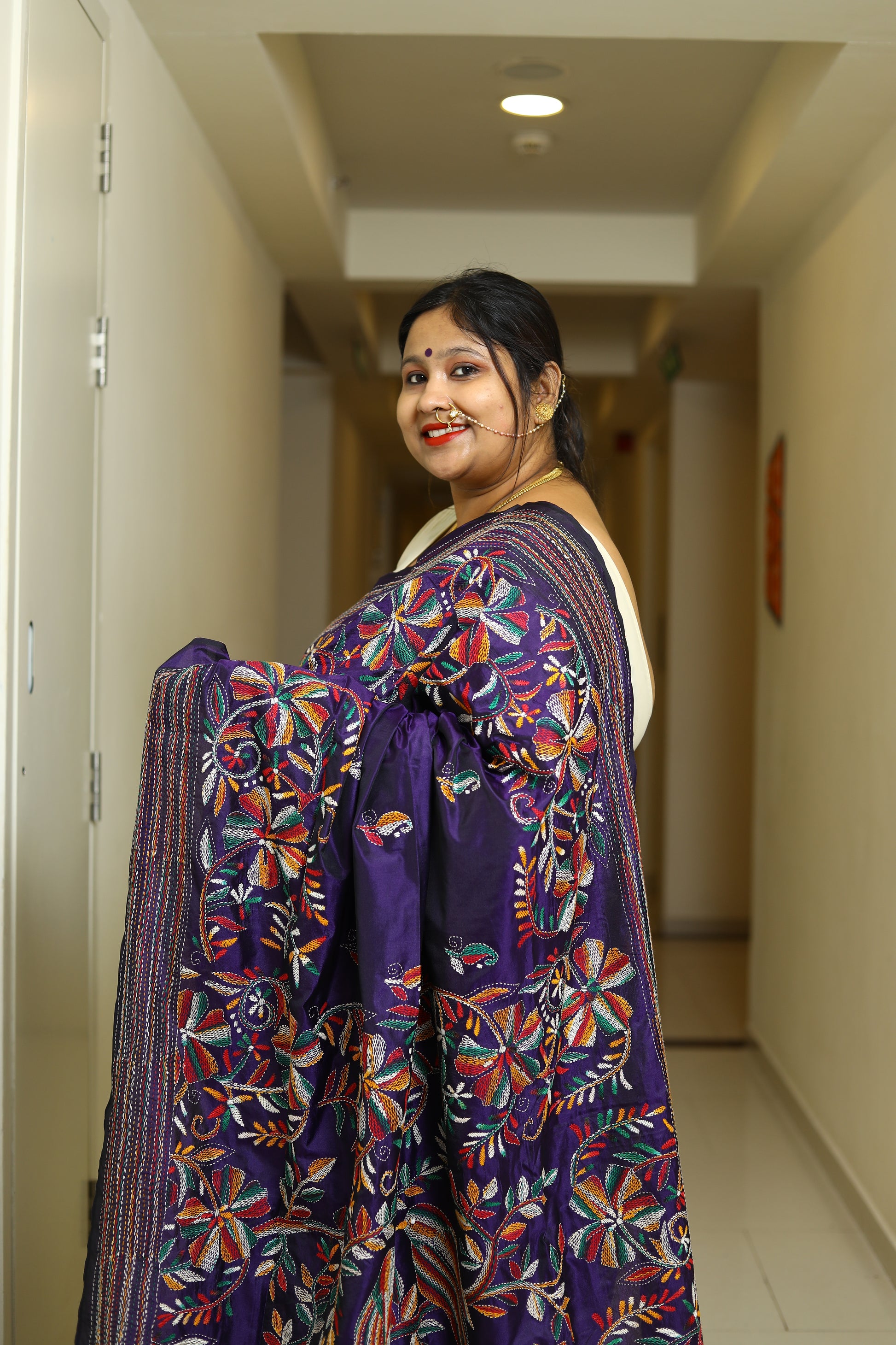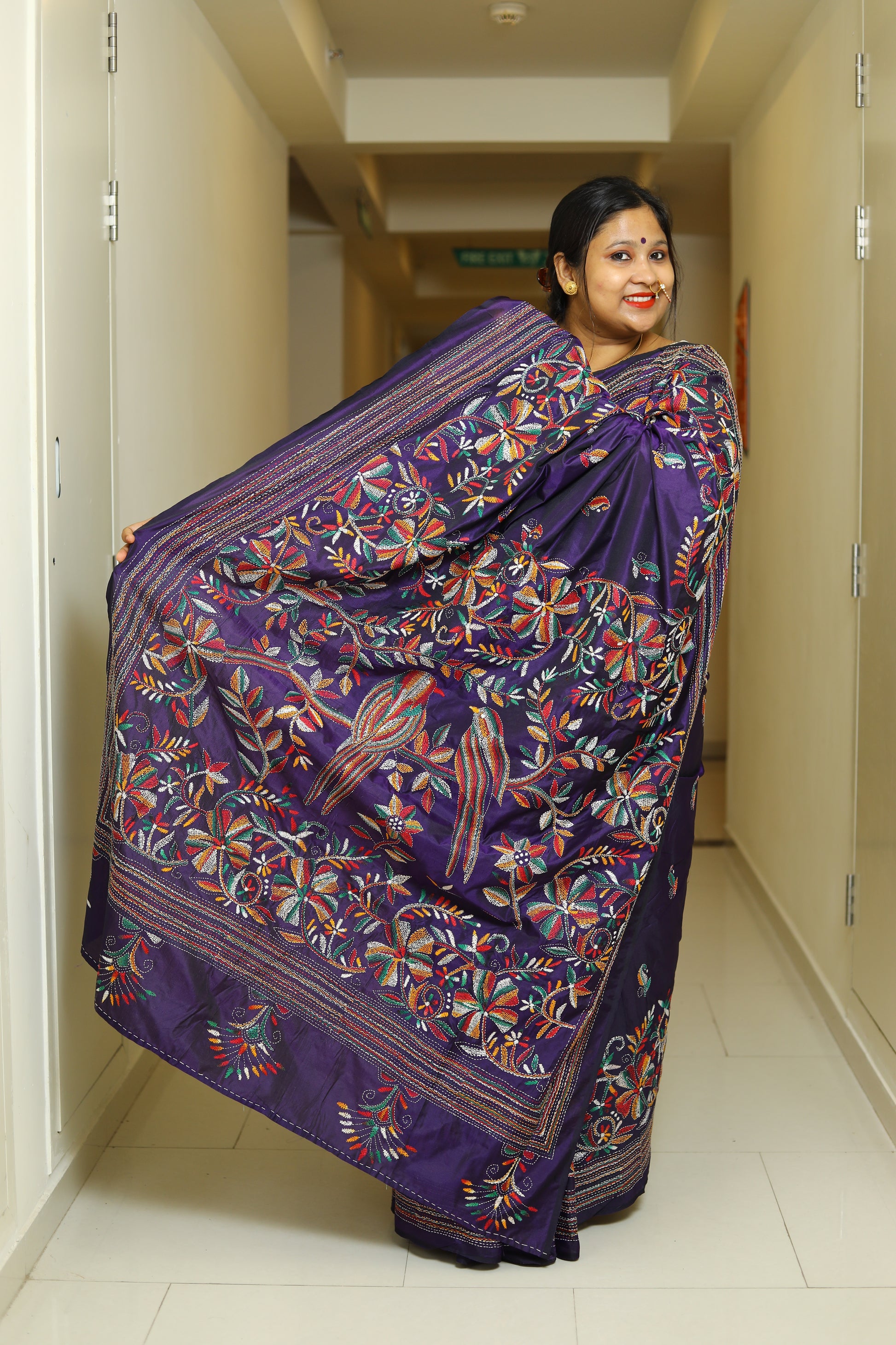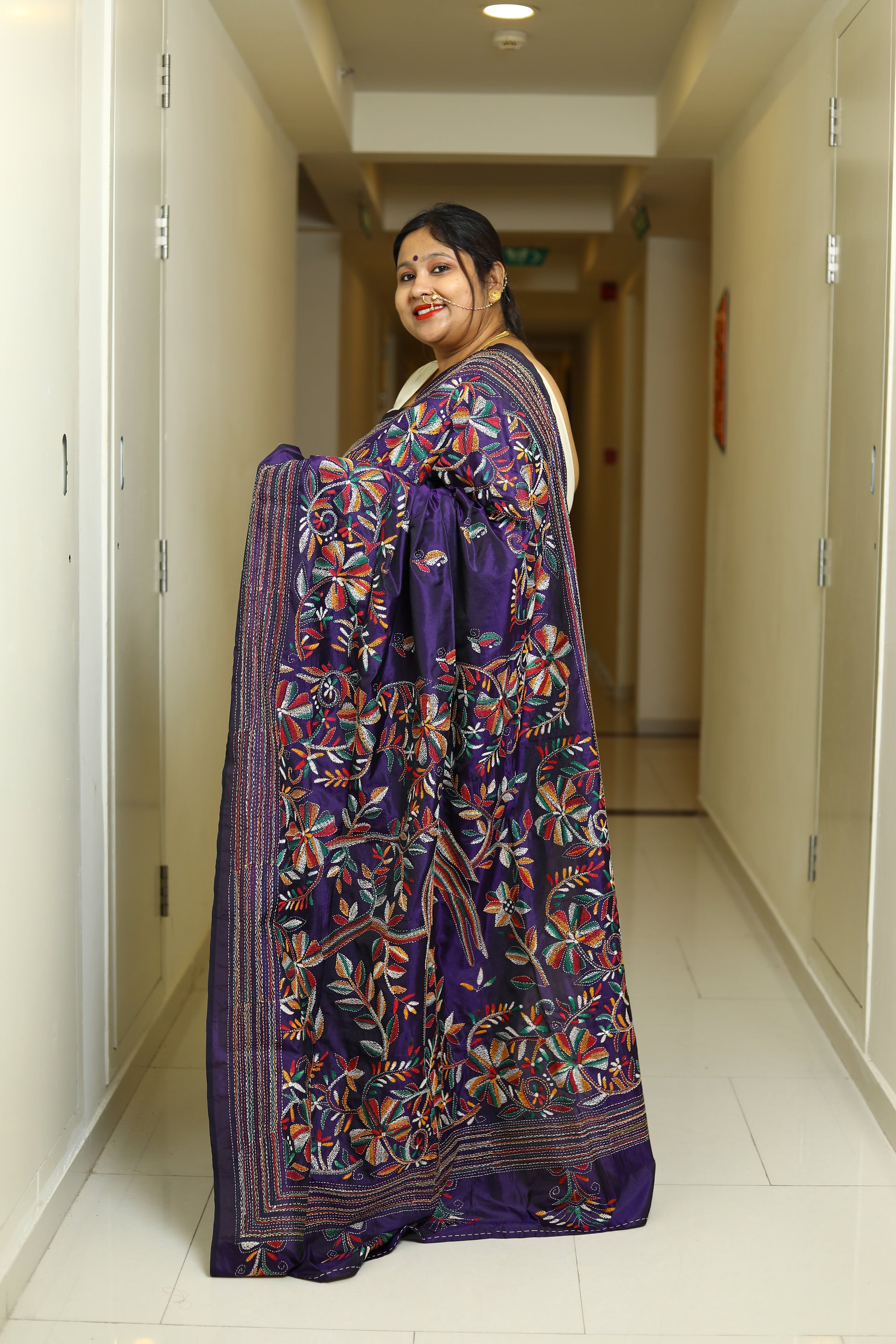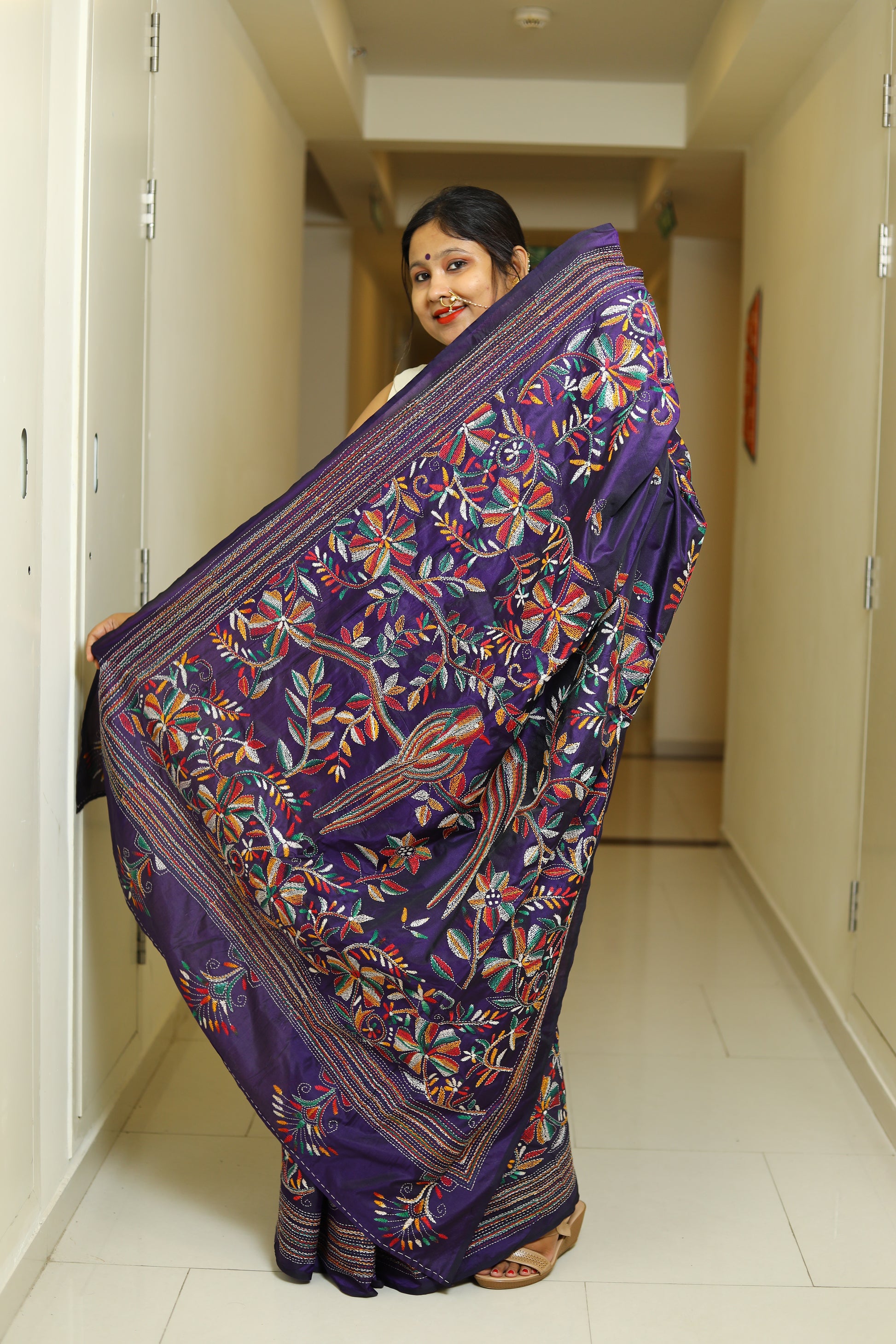 Kantha sarees are a traditional form of hand-embroidered sarees, originating from Bengal. Known for their intricate stitching, they feature beautiful motifs inspired by nature, daily life, and folklore. The embroidery is done using simple running stitches, often layered, creating unique textures and designs. Each Kantha saree tells a story, making it a timeless symbol of artistic craftsmanship and cultural heritage.