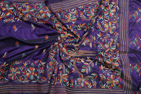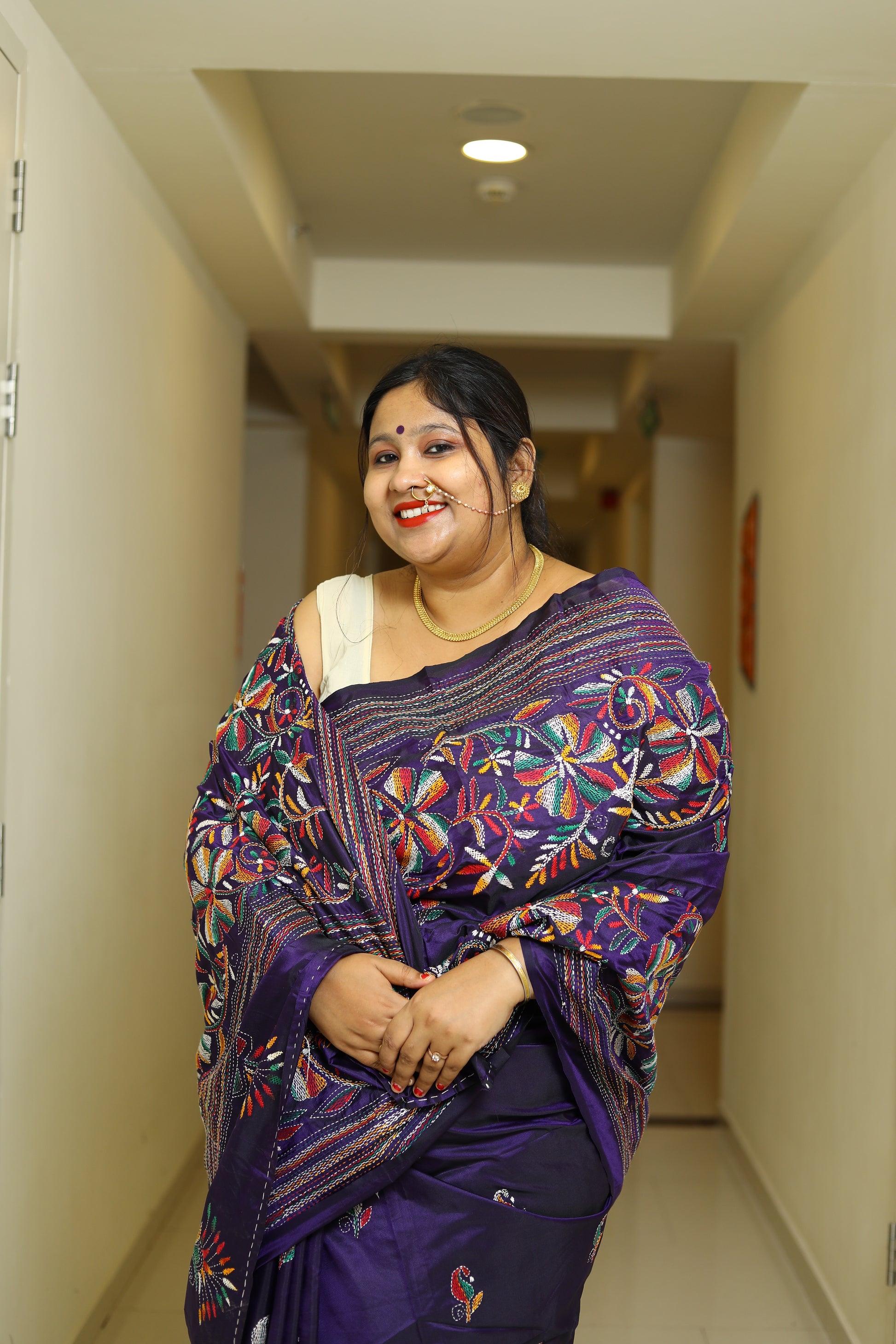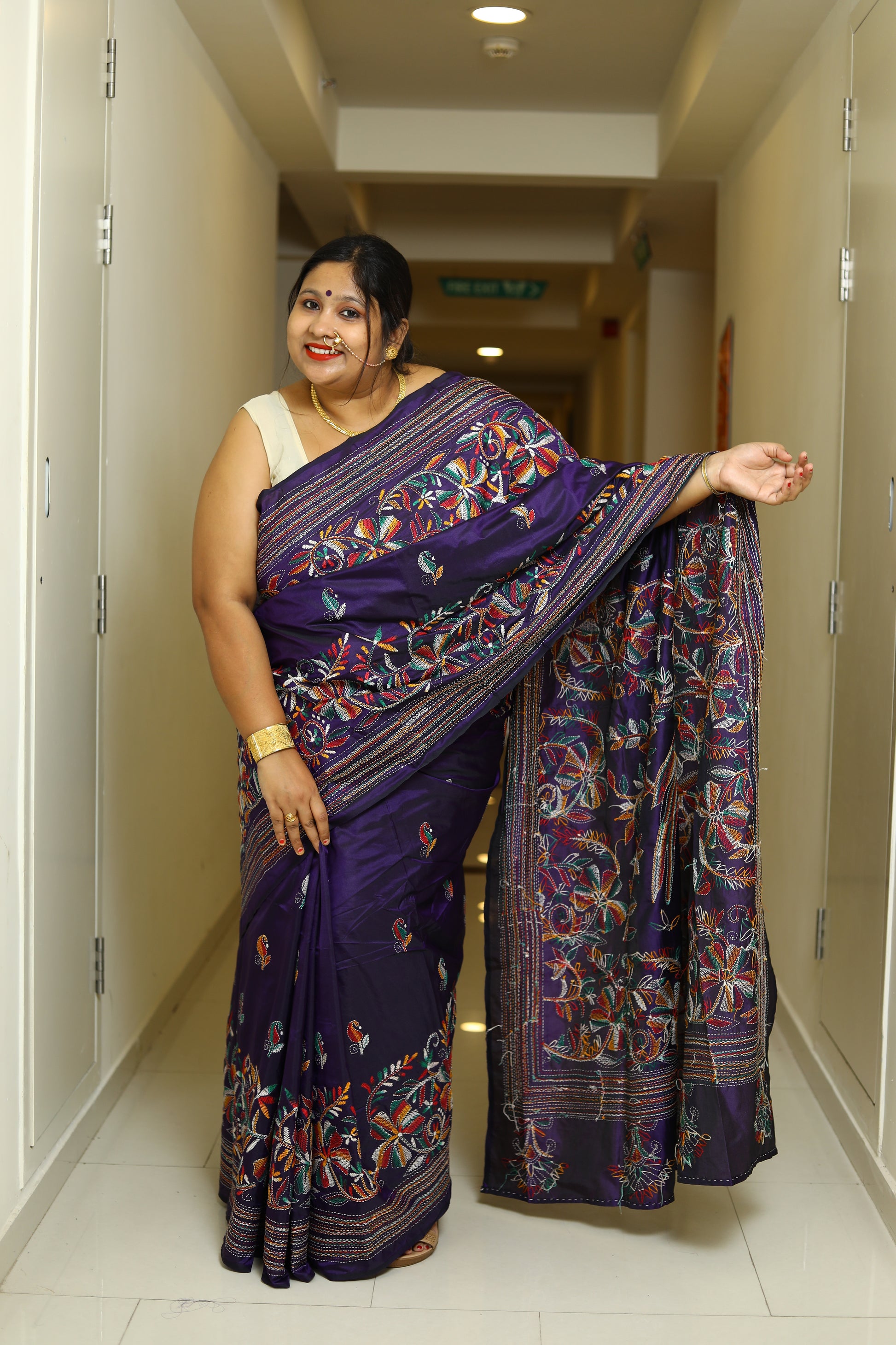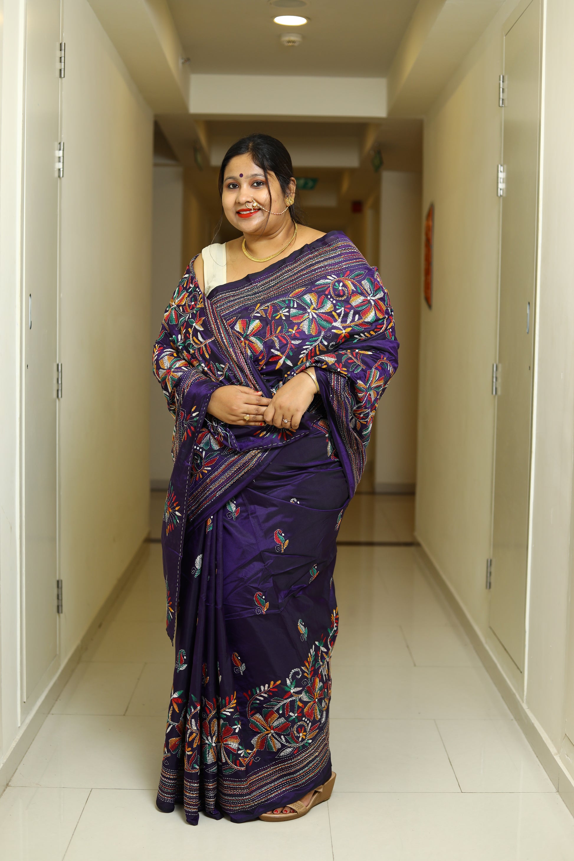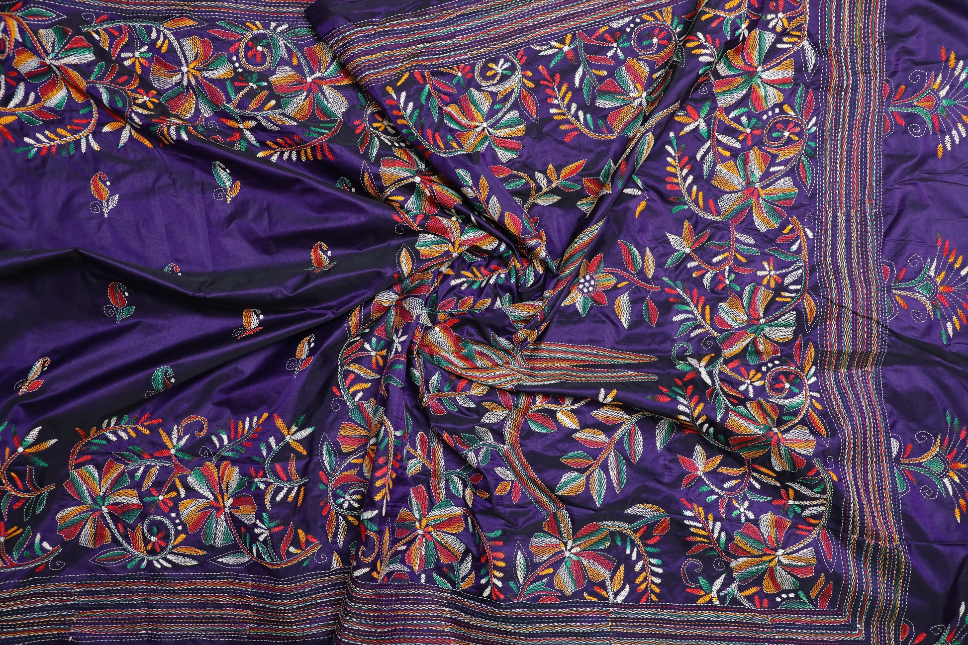 Kantha sarees are a traditional form of hand-embroidered sarees, originating from Bengal. Known for their intricate stitching, they feature beautiful motifs inspired by nature, daily life, and folklore. The embroidery is done using simple running stitches, often layered, creating unique textures and designs. Each Kantha saree tells a story, making it a timeless symbol of artistic craftsmanship and cultural heritage.