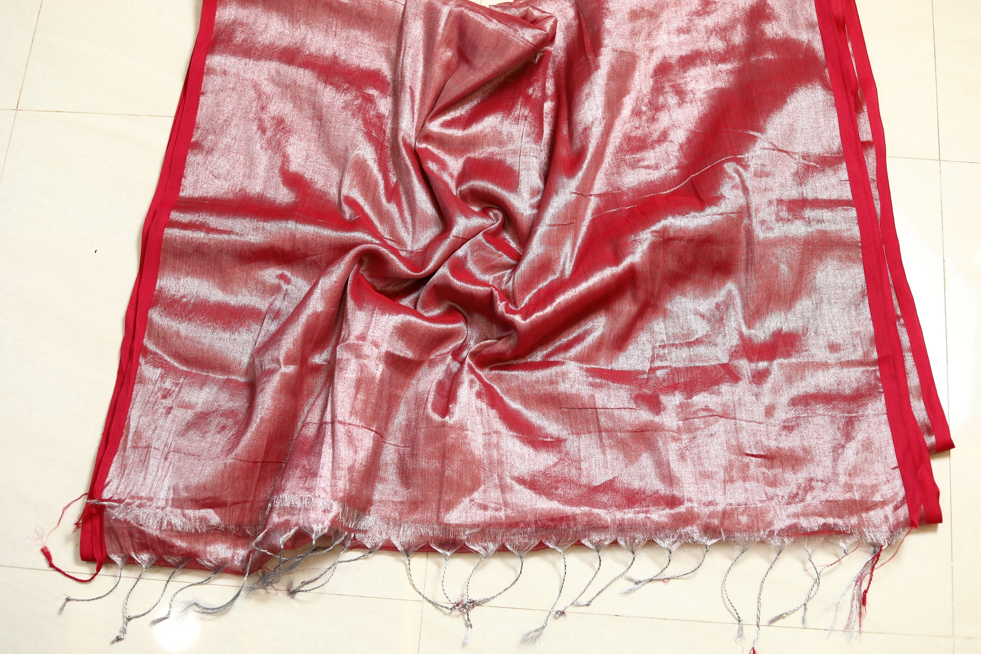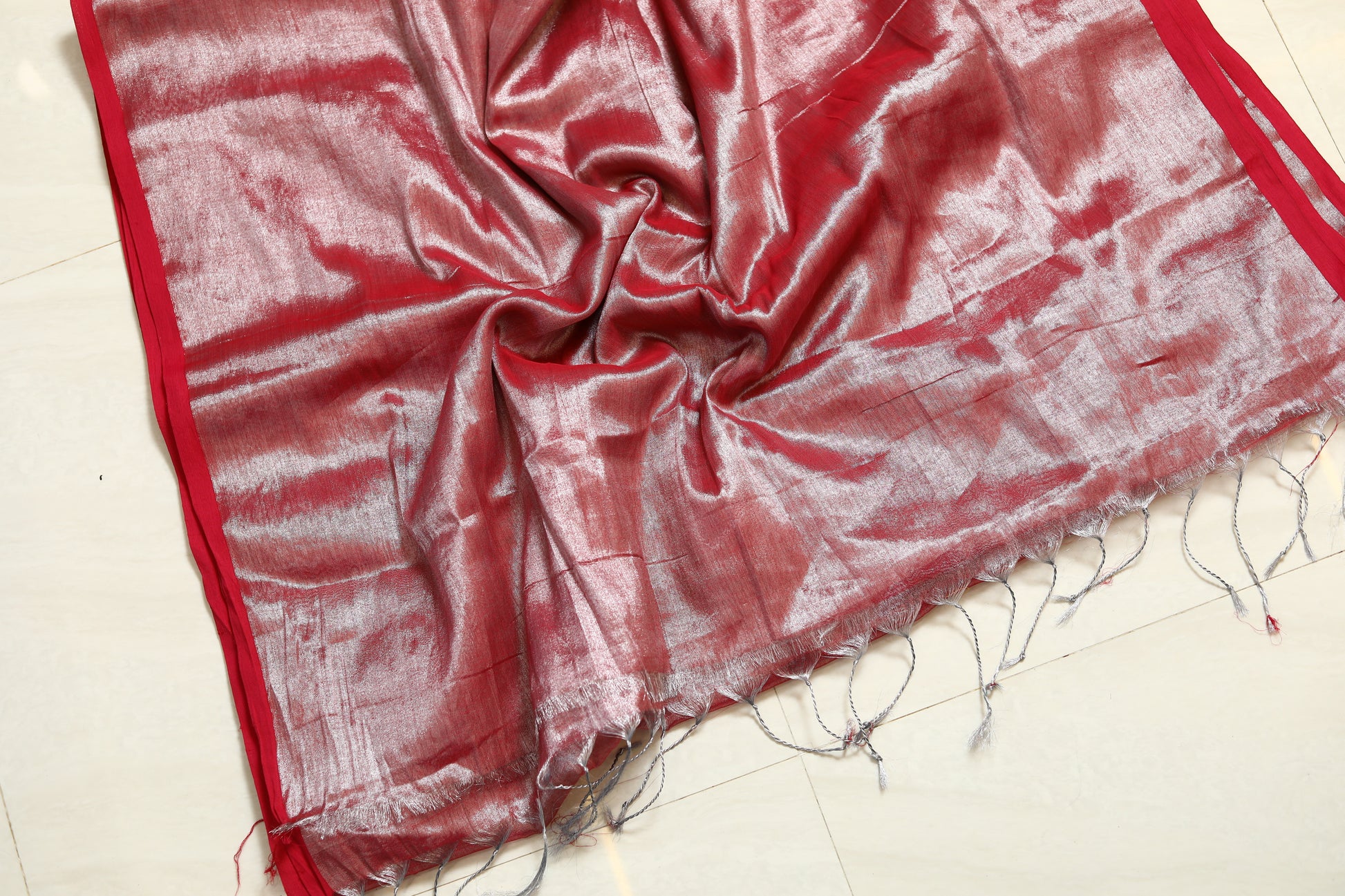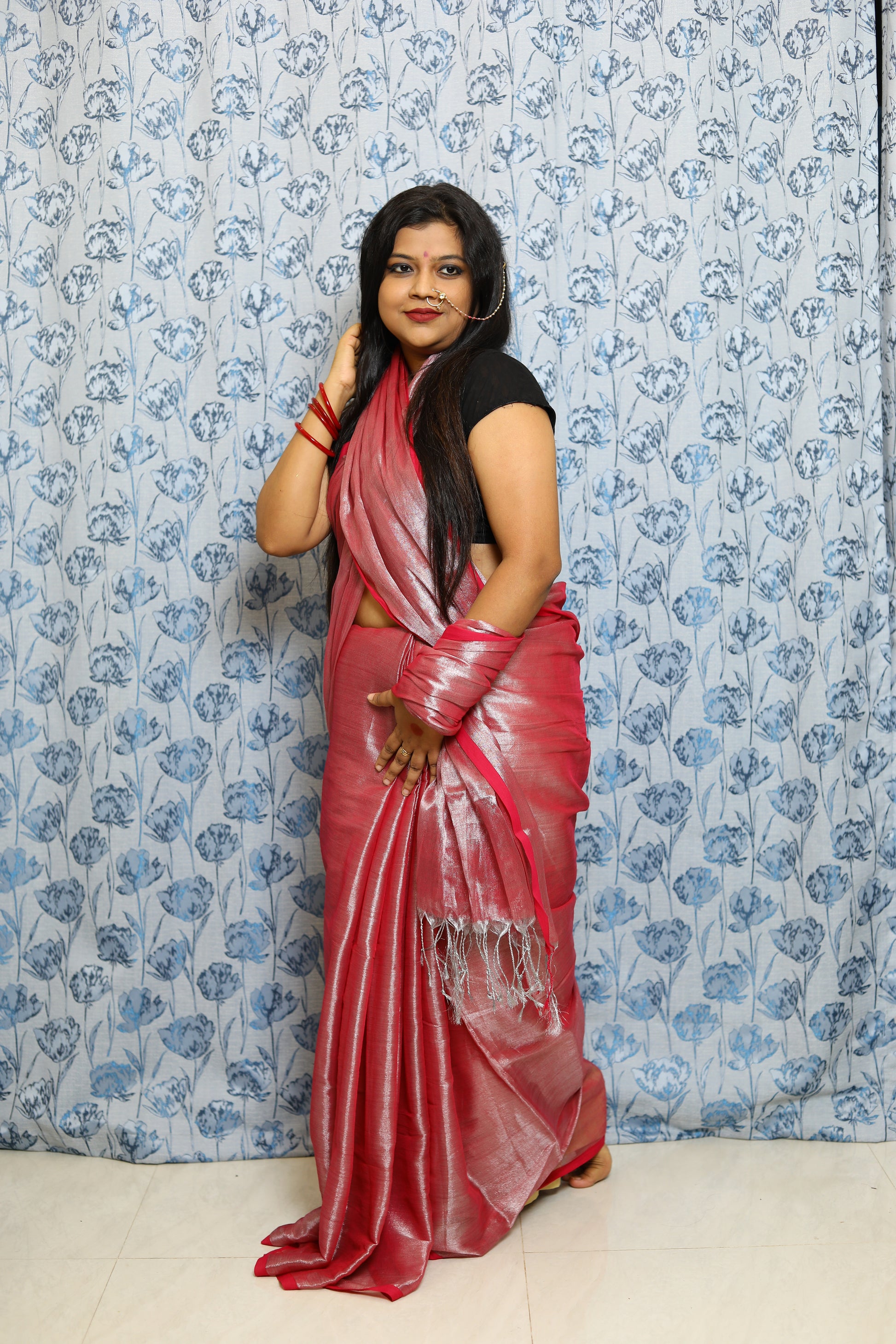 A stunning blend of elegance and comfort, crafted to make you shine on every occasion. This gorgeous saree features a delicate shimmer, while the linen base ensures a breathable, lightweight feel. Whether you're attending a festive celebration, a wedding, or a special event, this saree drapes effortlessly, offering both grace and ease. Its subtle sheen adds a touch of glamour, making it the perfect choice for those who seek a refined, timeless look.