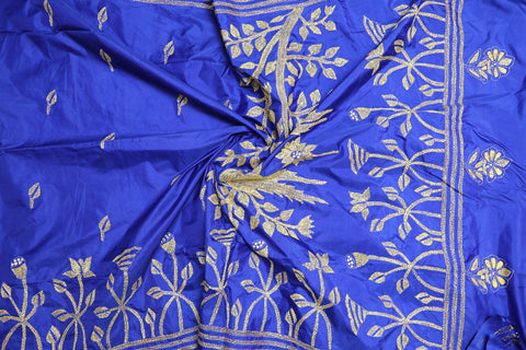 Kantha sarees are a traditional form of hand-embroidered sarees, originating from Bengal. Known for their intricate stitching, they feature beautiful motifs inspired by nature, daily life, and folklore. The embroidery is done using simple running stitches, often layered, creating unique textures and designs. Each Kantha saree tells a story, making it a timeless symbol of artistic craftsmanship and cultural heritage.
