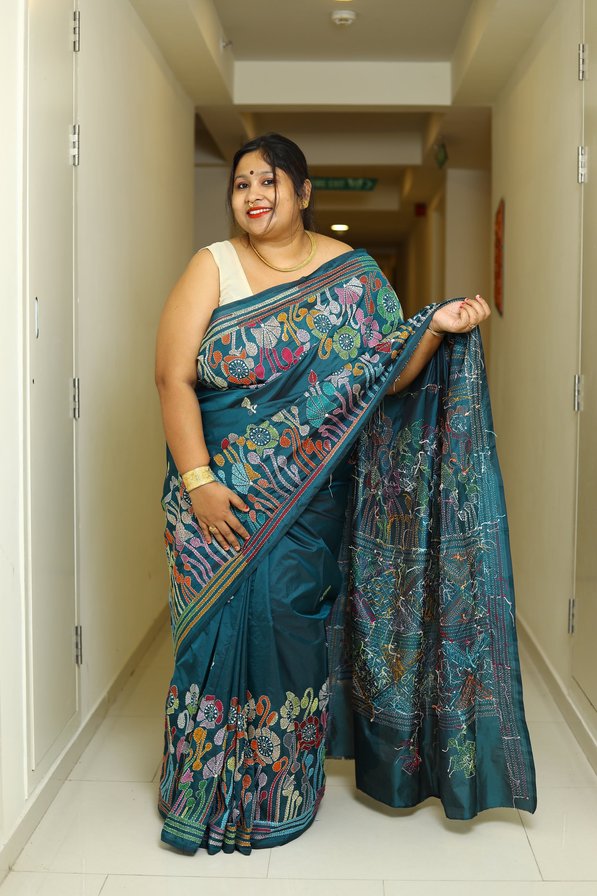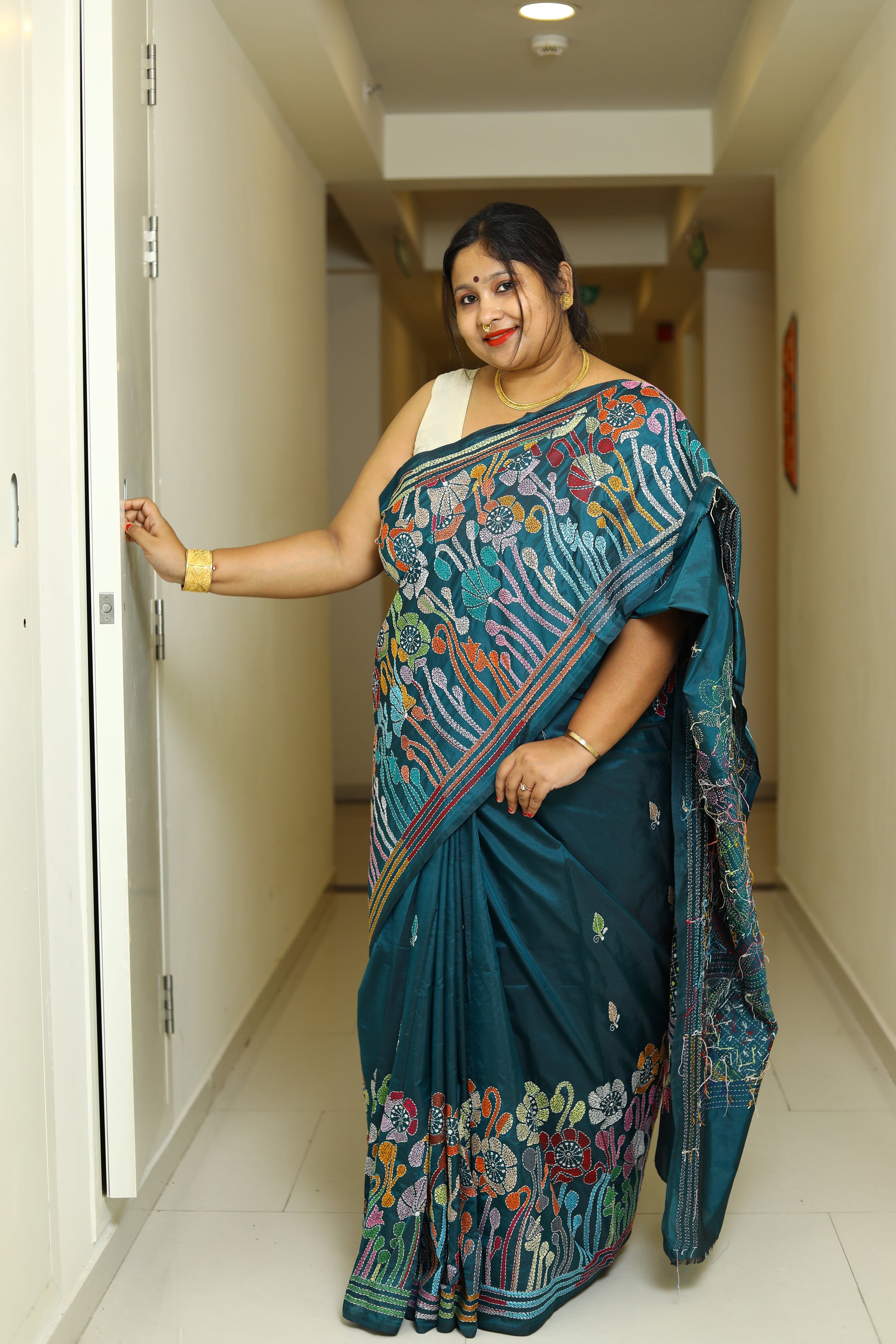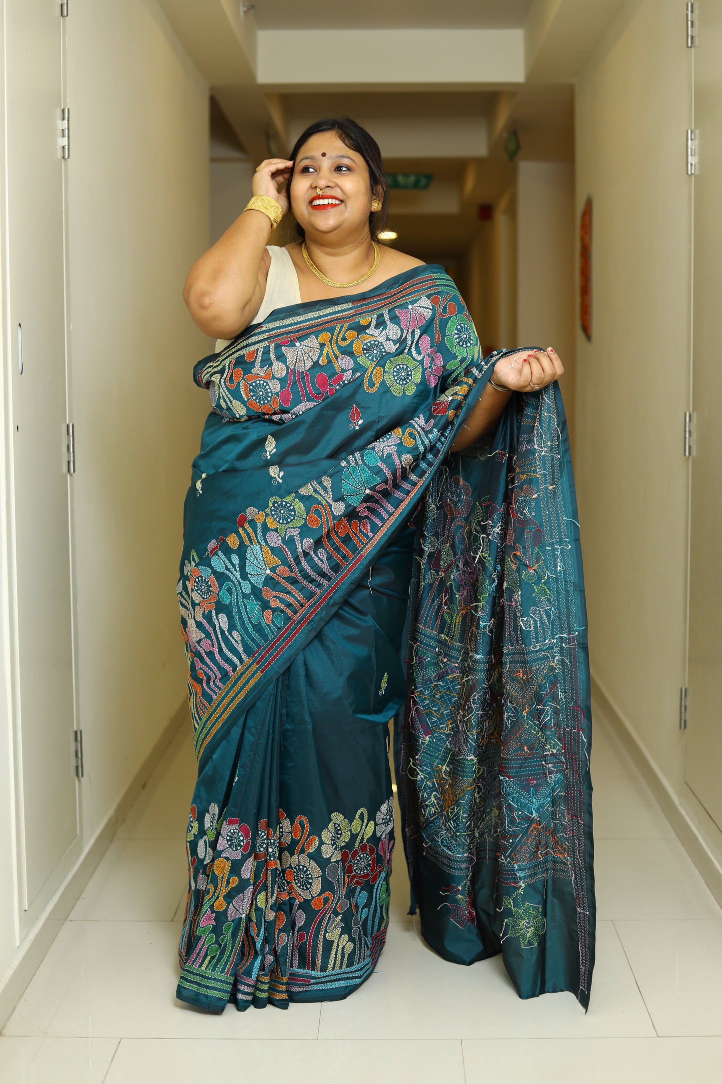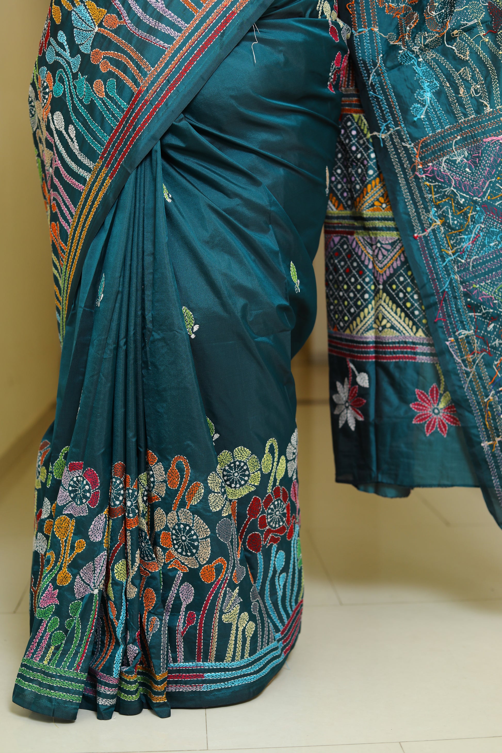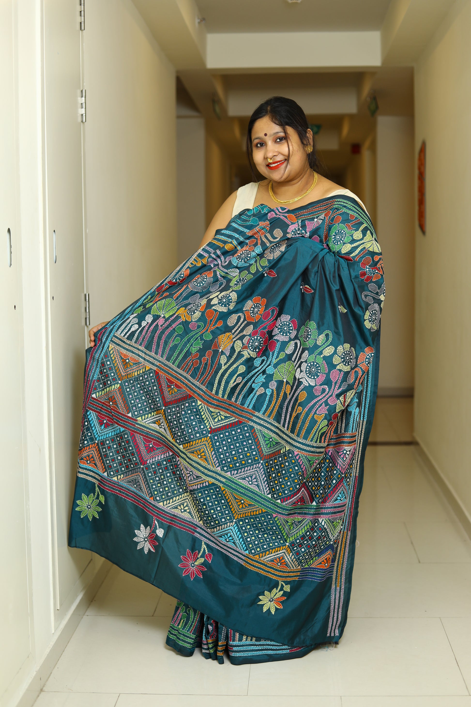 Kantha sarees are a traditional form of hand-embroidered sarees, originating from Bengal. Known for their intricate stitching, they feature beautiful motifs inspired by nature, daily life, and folklore. The embroidery is done using simple running stitches, often layered, creating unique textures and designs. Each Kantha saree tells a story, making it a timeless symbol of artistic craftsmanship and cultural heritage.
