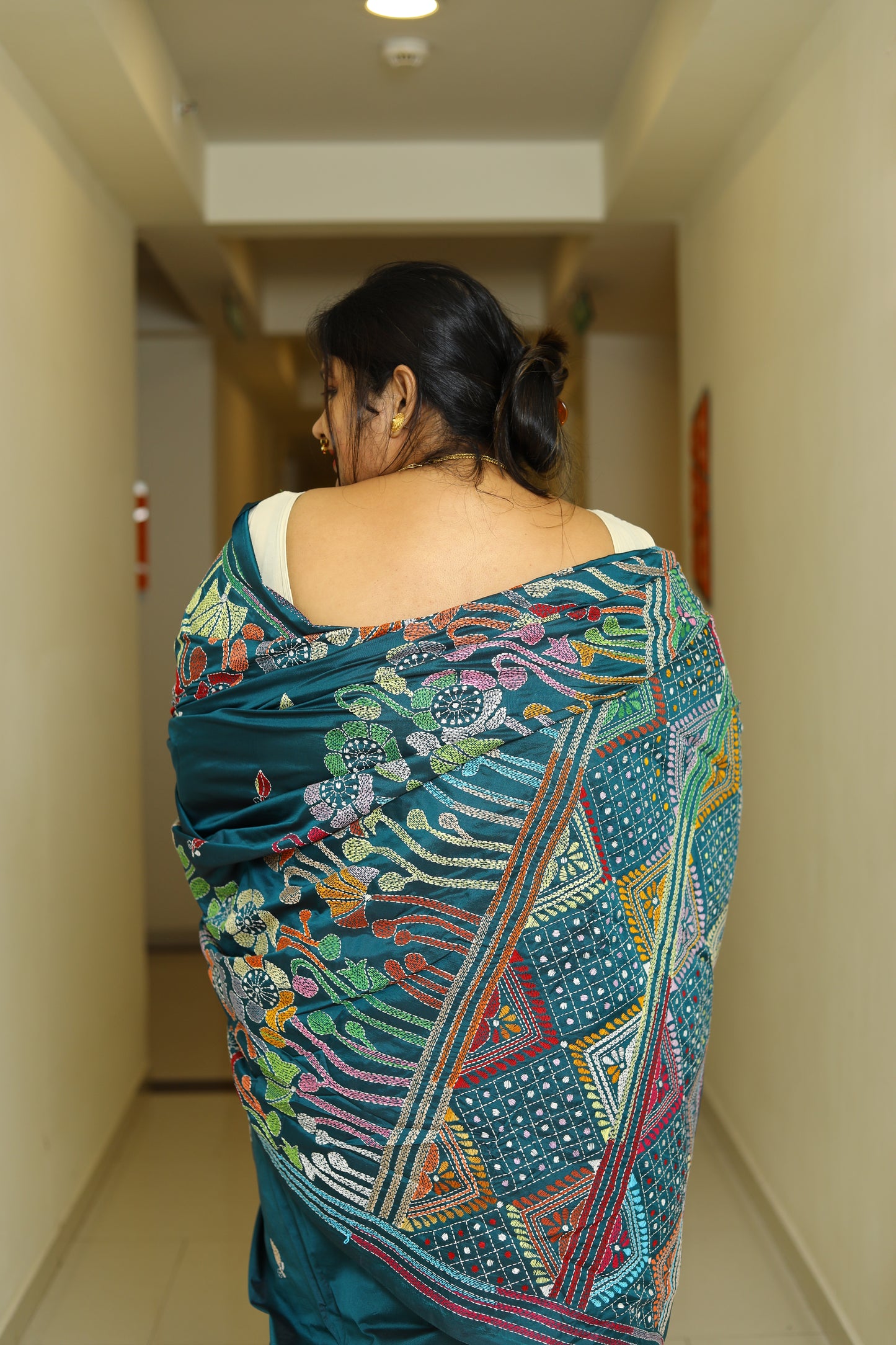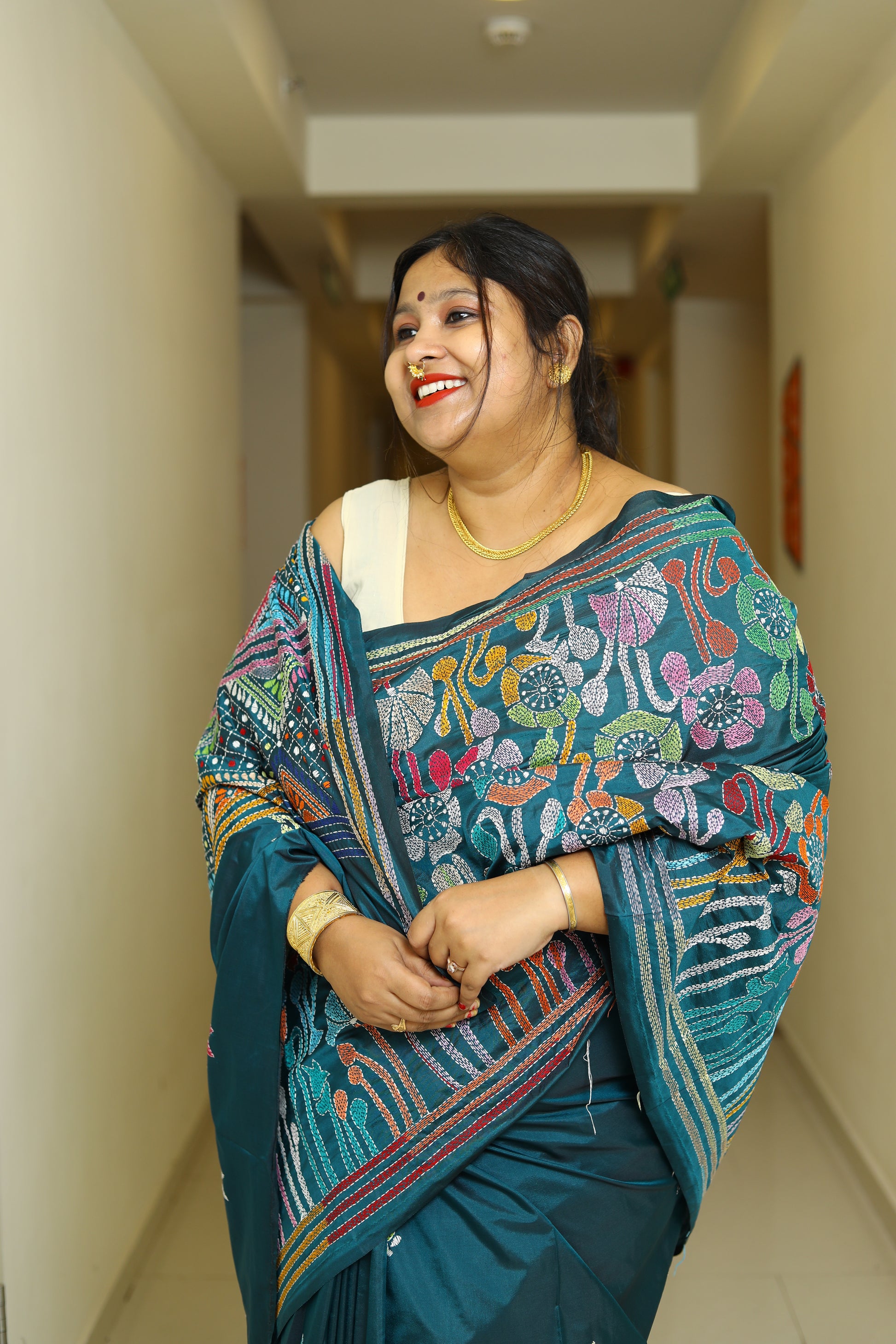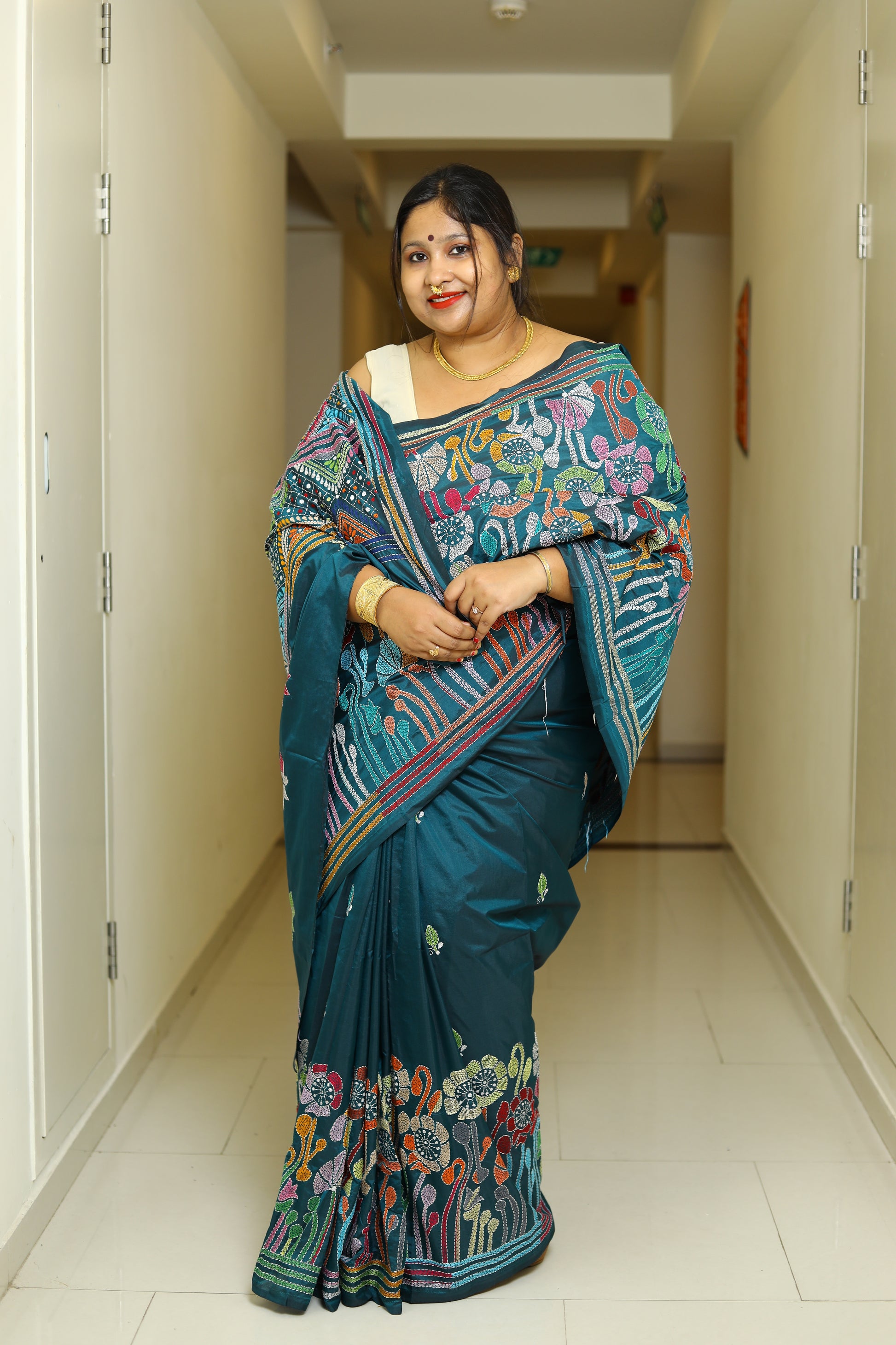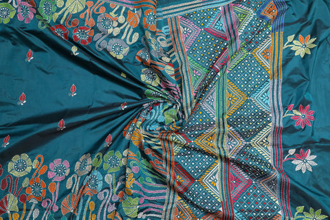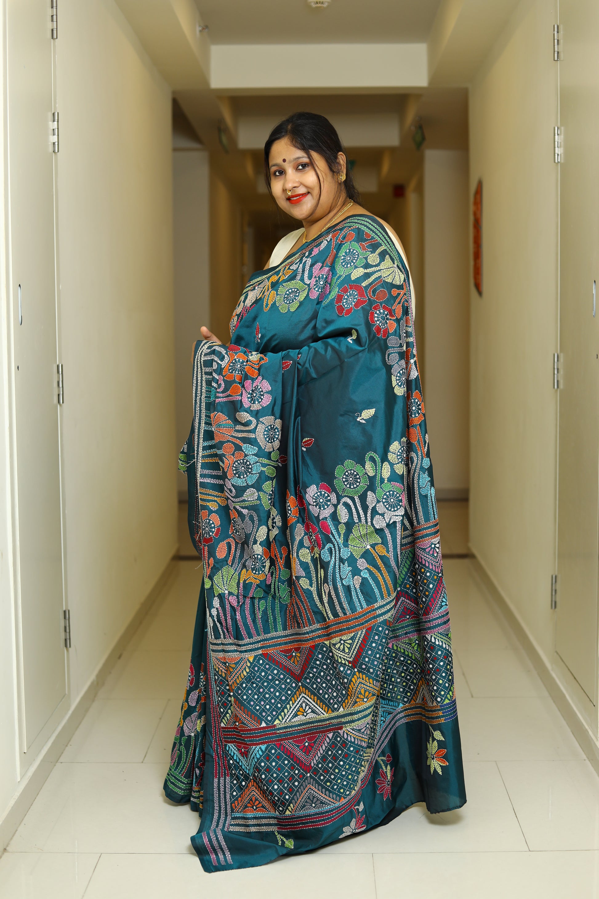 Kantha sarees are a traditional form of hand-embroidered sarees, originating from Bengal. Known for their intricate stitching, they feature beautiful motifs inspired by nature, daily life, and folklore. The embroidery is done using simple running stitches, often layered, creating unique textures and designs. Each Kantha saree tells a story, making it a timeless symbol of artistic craftsmanship and cultural heritage.