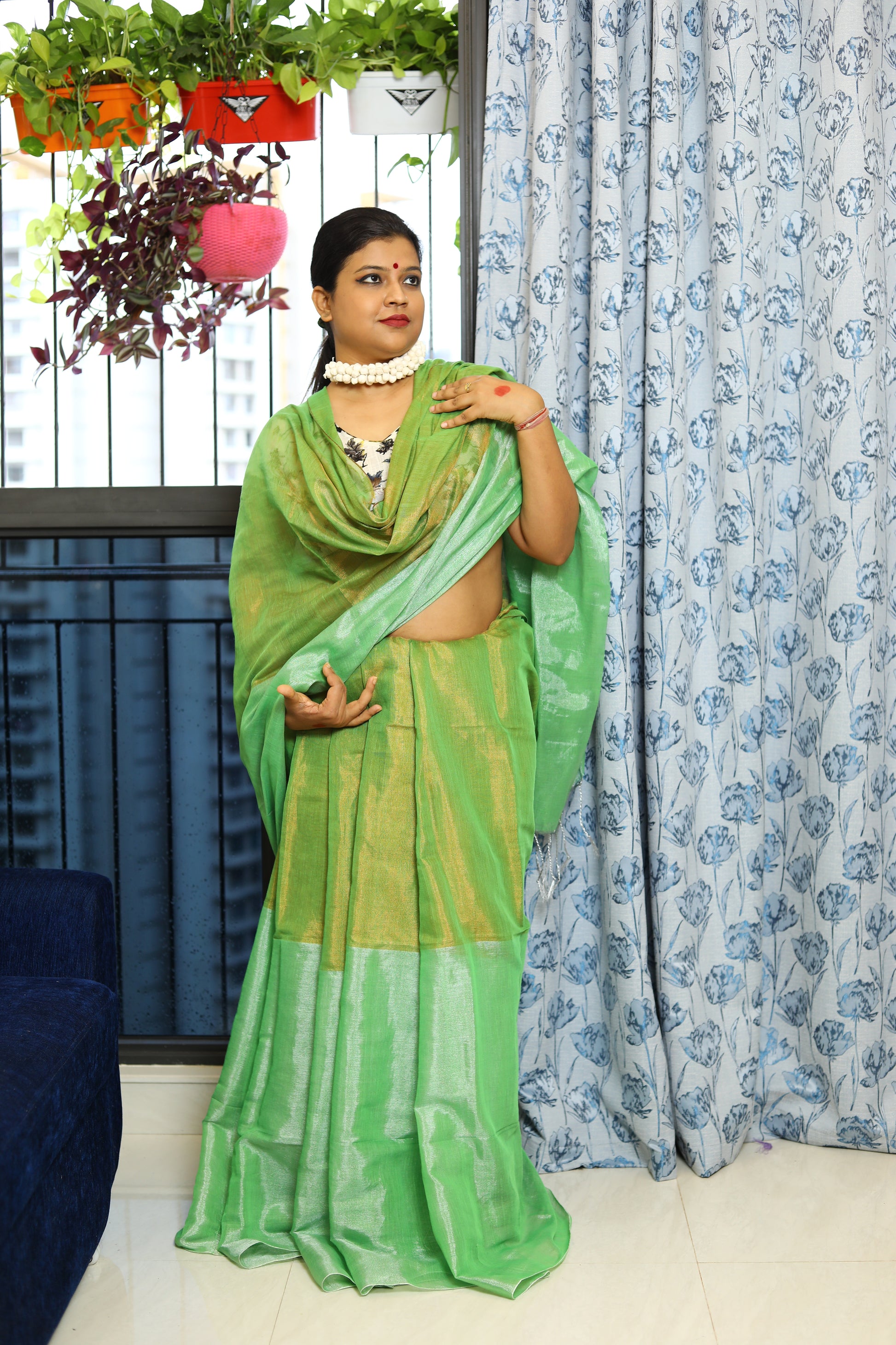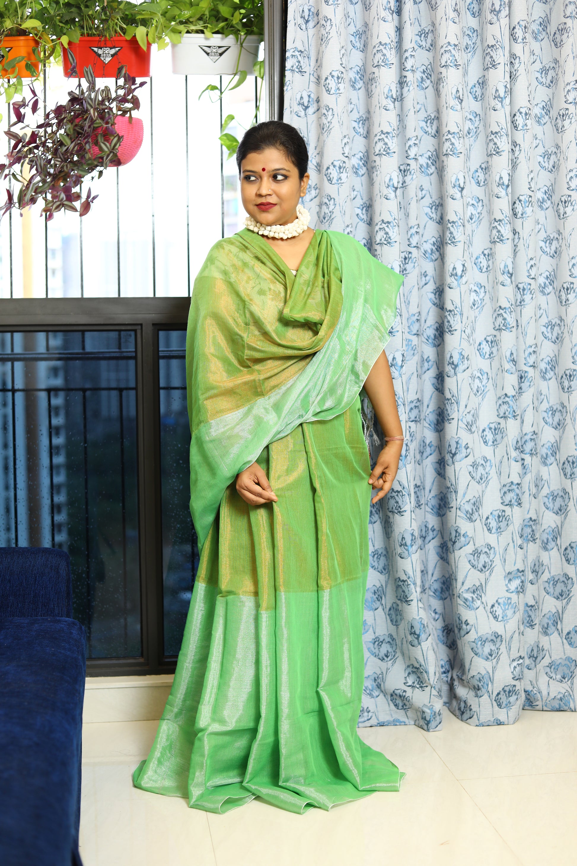 A stunning blend of elegance and comfort, crafted to make you shine on every occasion. This gorgeous saree features a delicate shimmer, while the linen base ensures a breathable, lightweight feel. Whether you're attending a festive celebration, a wedding, or a special event, this saree drapes effortlessly, offering both grace and ease. Its subtle sheen adds a touch of glamour, making it the perfect choice for those who seek a refined, timeless look.
