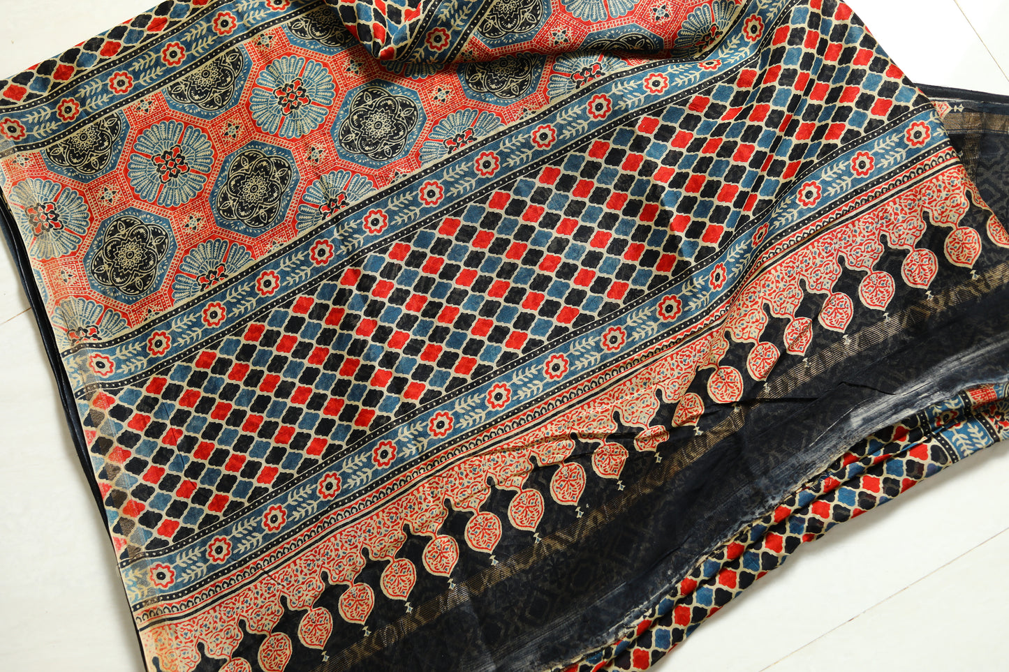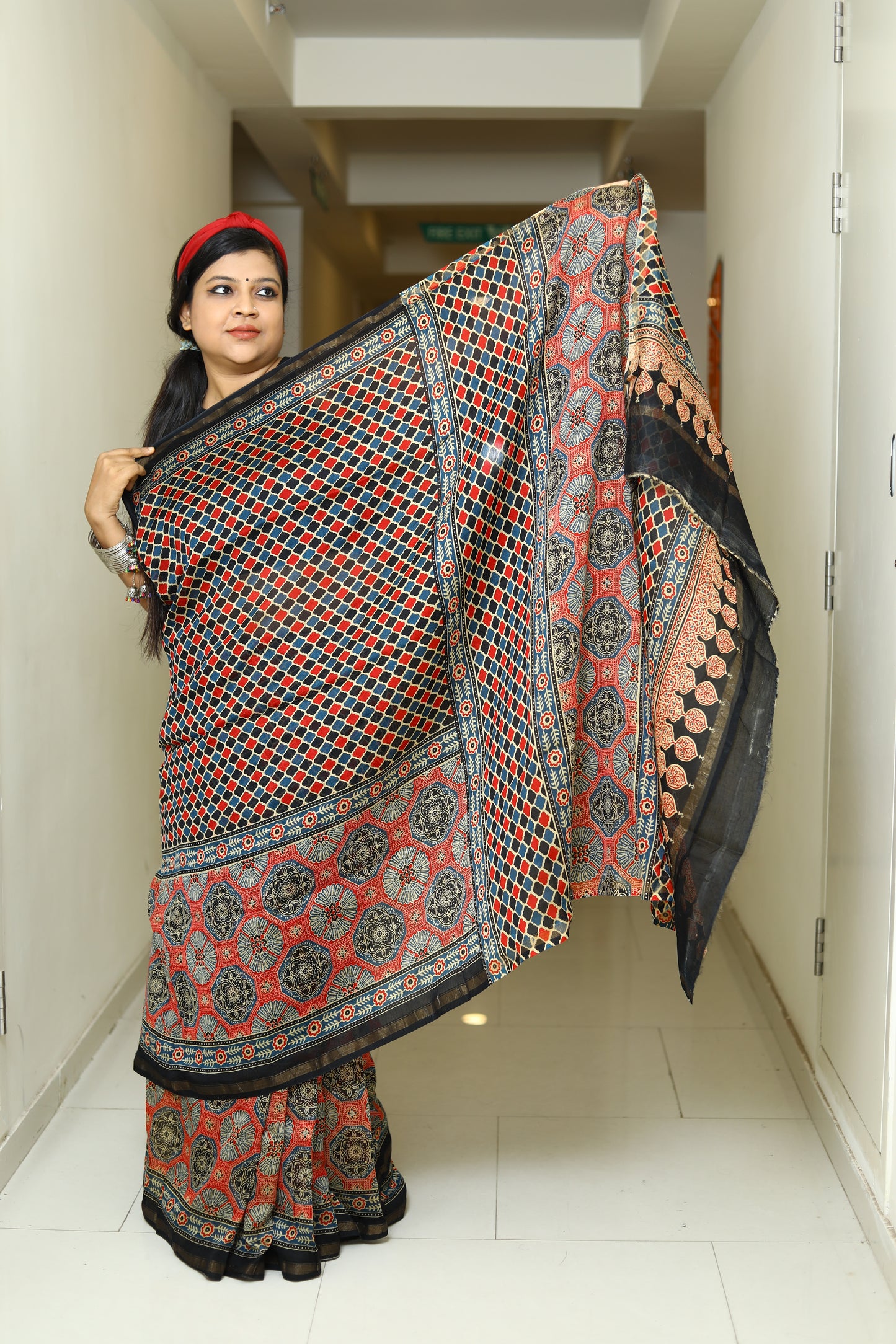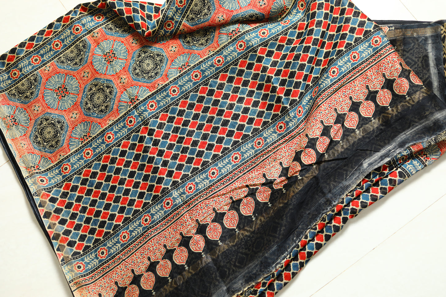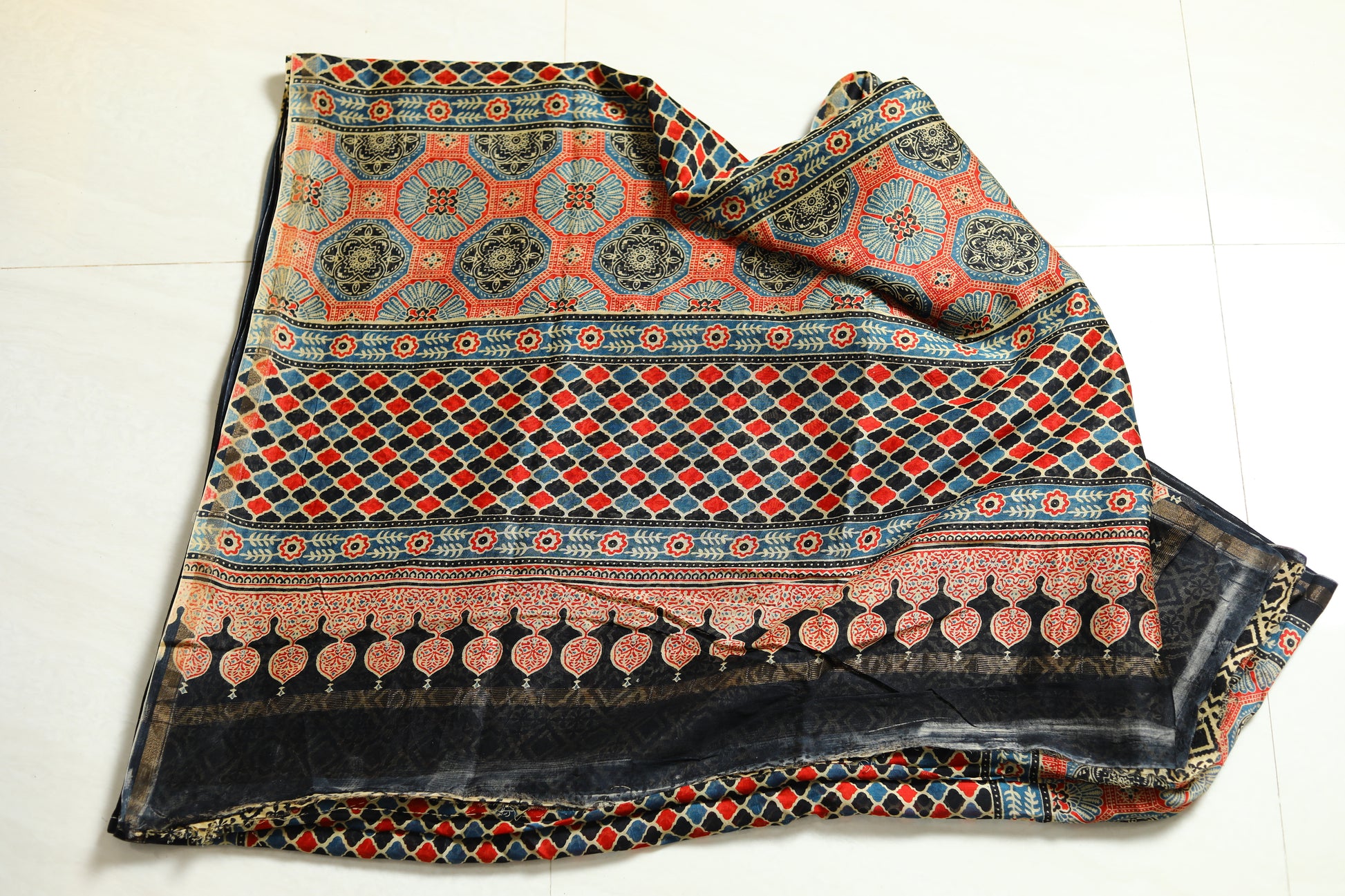 The Ajrakh printed Chanderi silk saree is a fusion of two rich textile traditions. Ajrakh, a centuries-old block printing technique, is known for its intricate geometric patterns and deep, earthy colors, typically using natural dyes like indigo, madder, and black. This printing style originates from the Kutch region of Gujarat and is revered for its meticulous, handcrafted process, often involving up to 14 different stages of dyeing and printing.