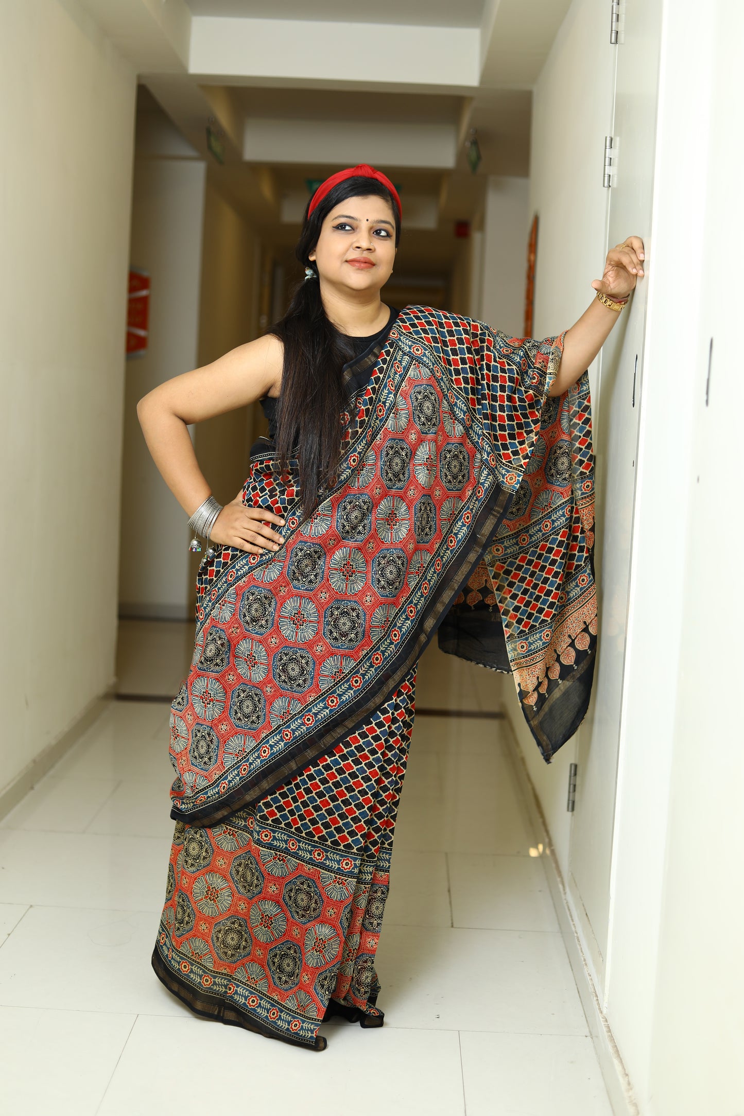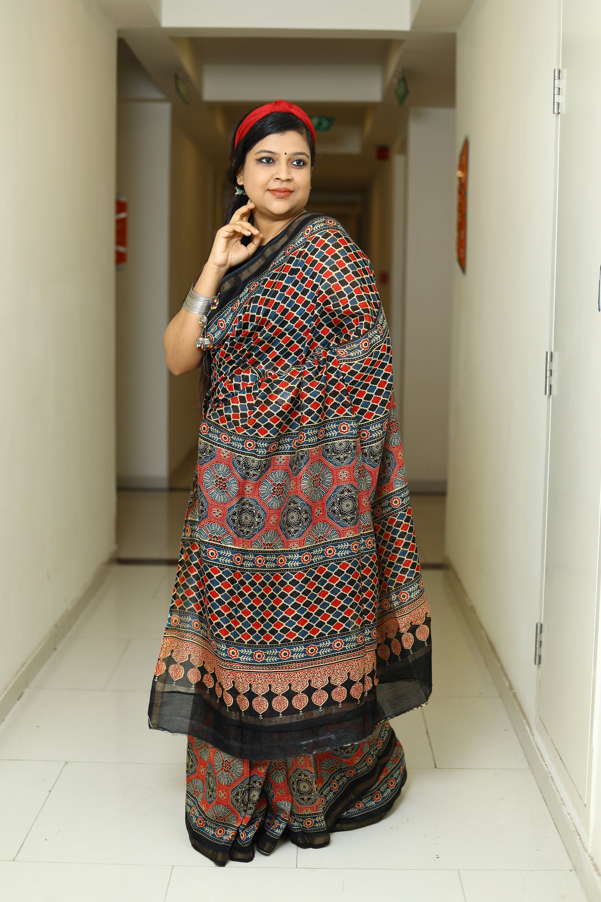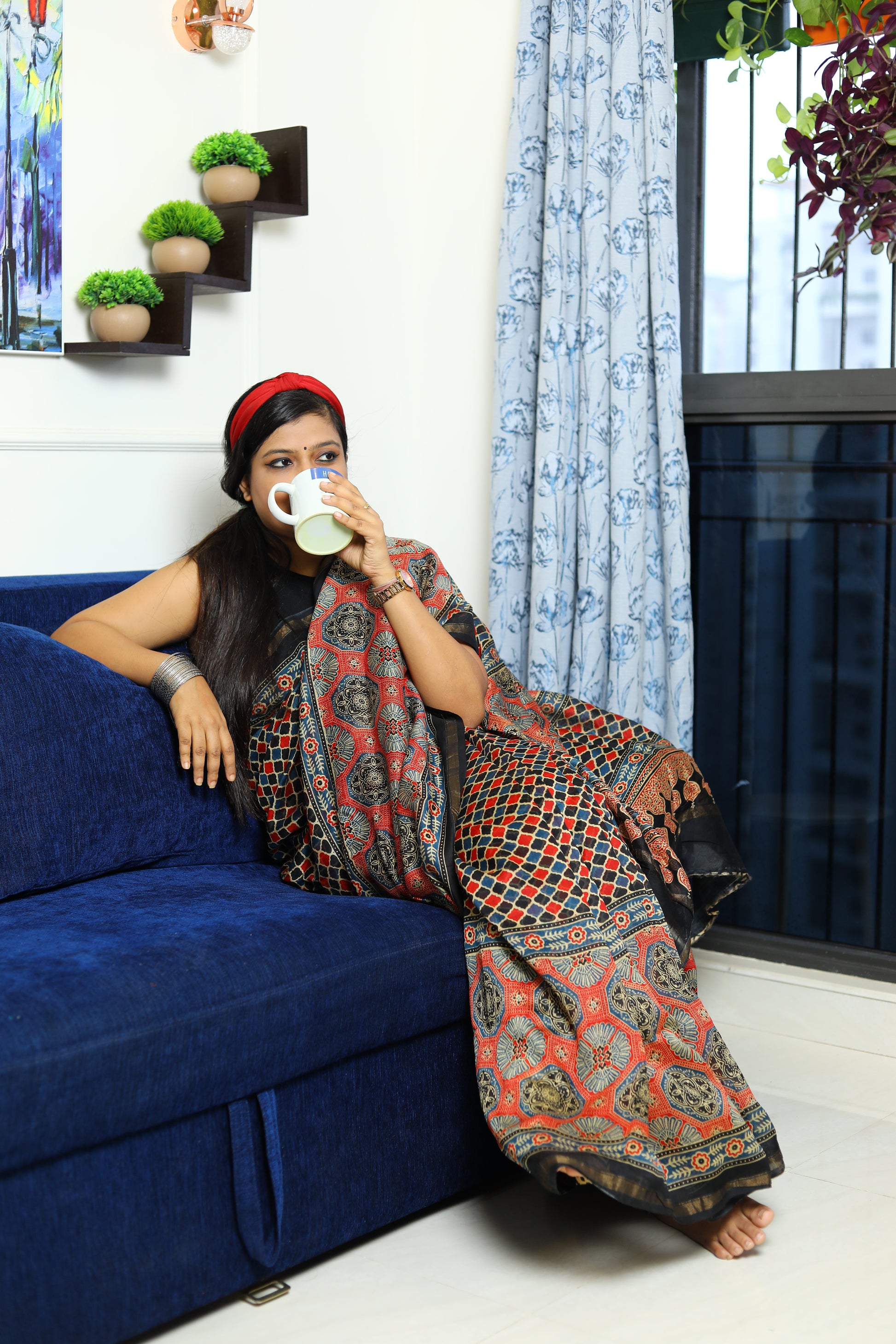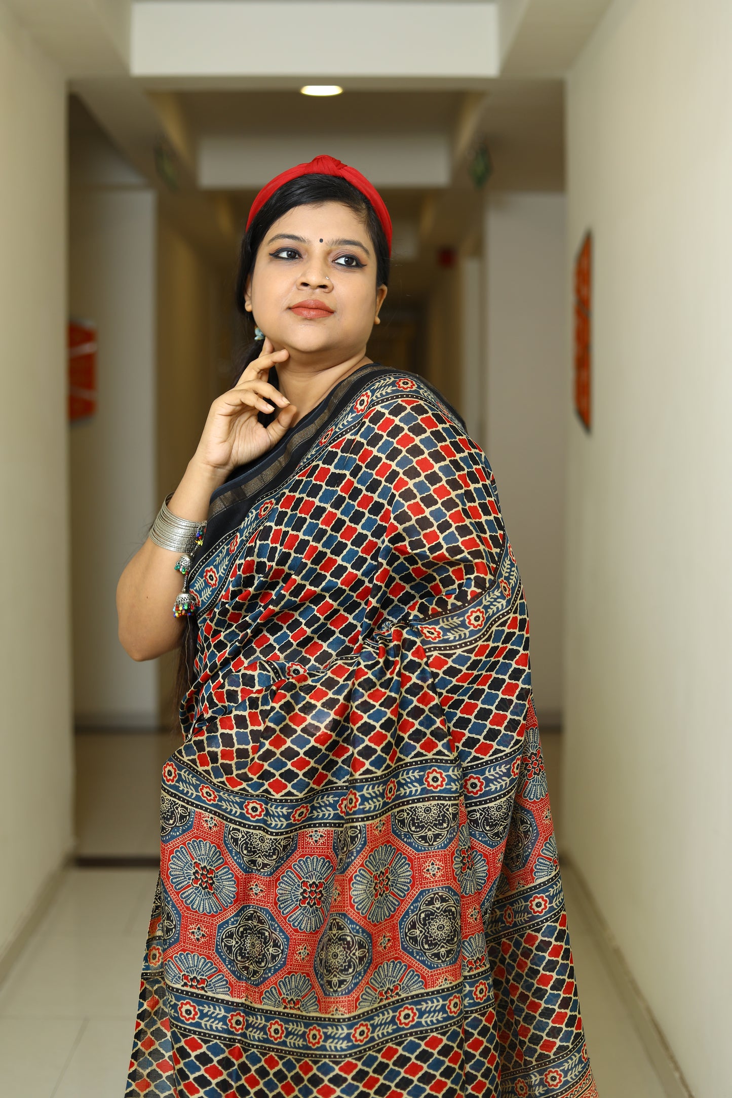 The Ajrakh printed Chanderi silk saree is a fusion of two rich textile traditions. Ajrakh, a centuries-old block printing technique, is known for its intricate geometric patterns and deep, earthy colors, typically using natural dyes like indigo, madder, and black. This printing style originates from the Kutch region of Gujarat and is revered for its meticulous, handcrafted process, often involving up to 14 different stages of dyeing and printing.