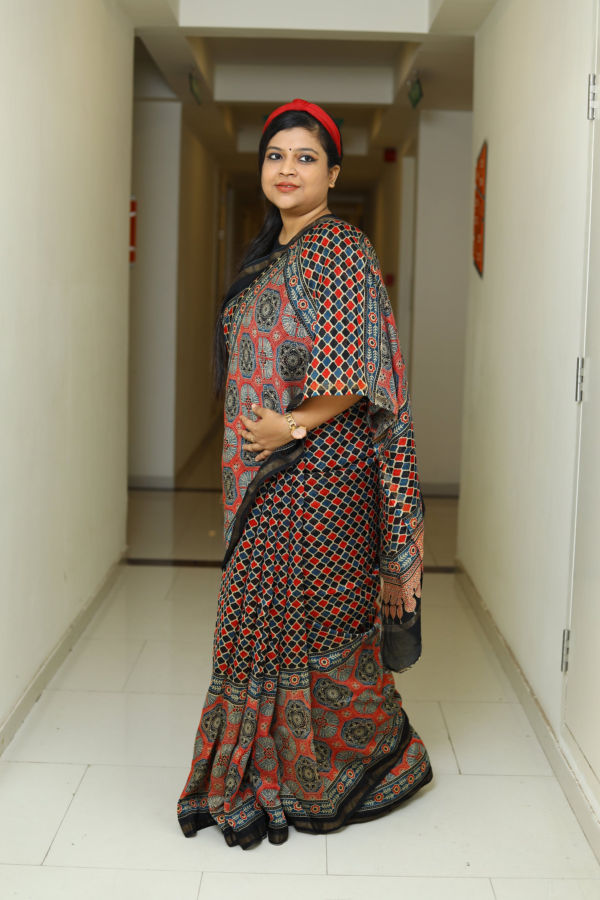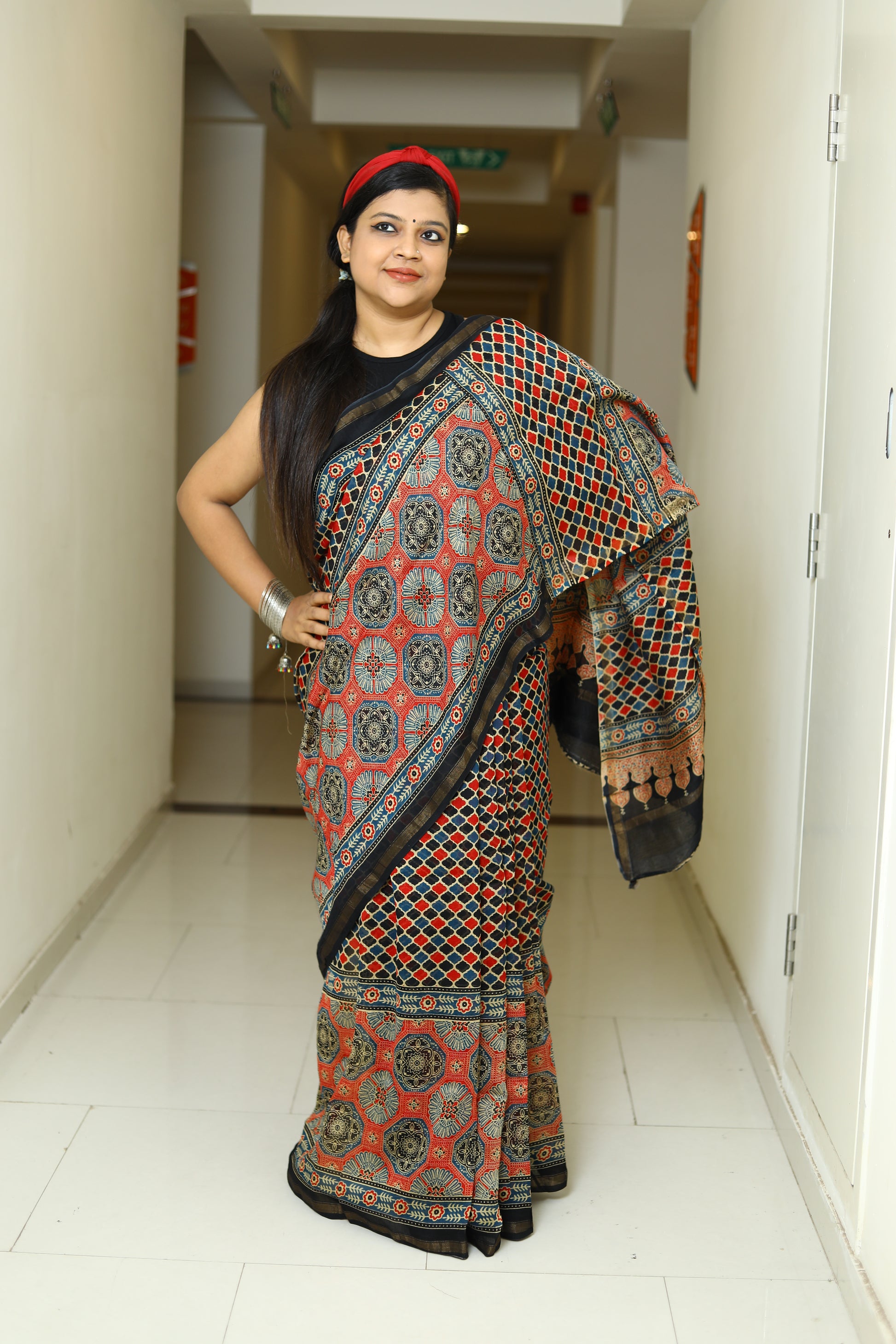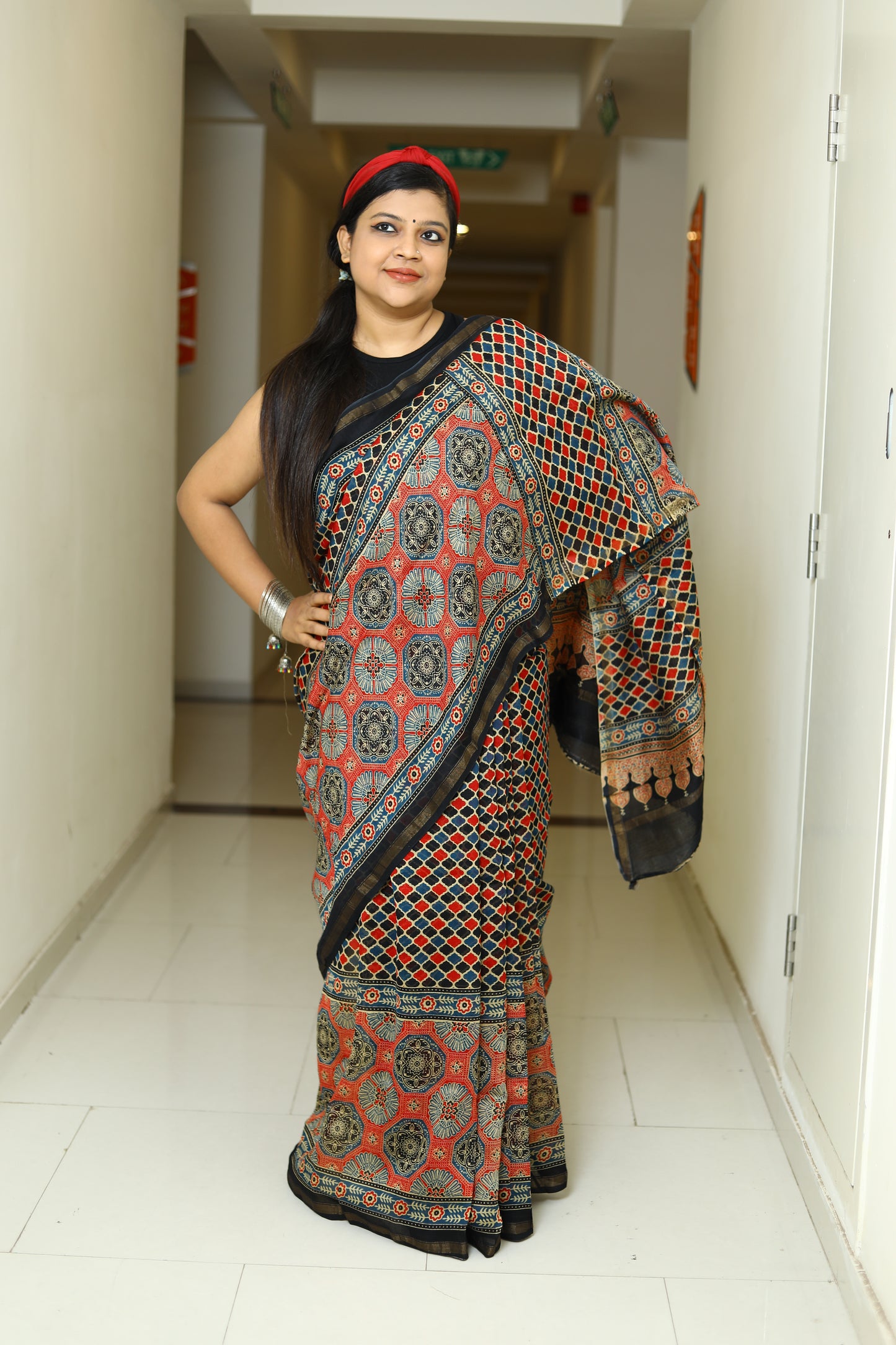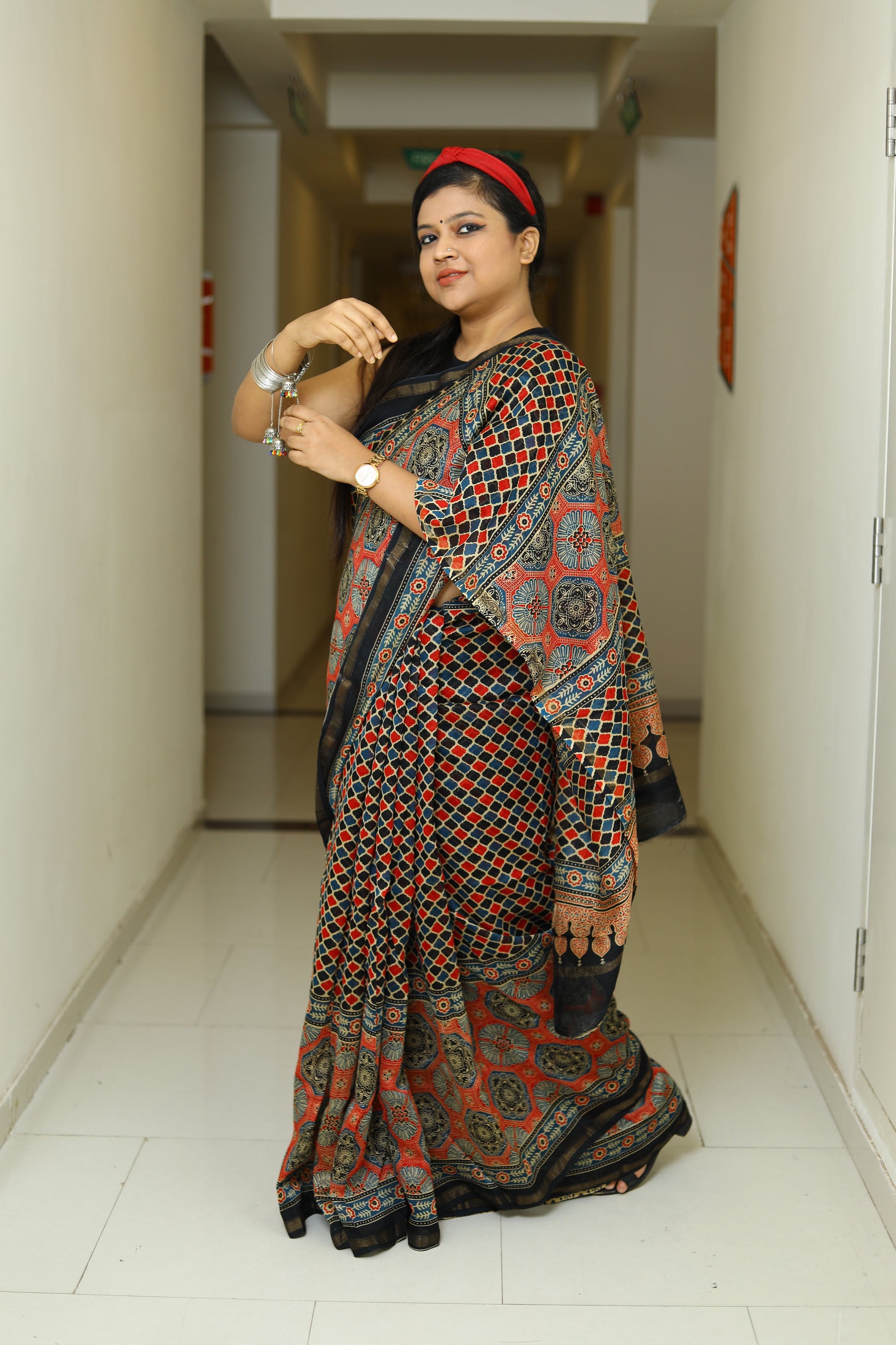 The Ajrakh printed Chanderi silk saree is a fusion of two rich textile traditions. Ajrakh, a centuries-old block printing technique, is known for its intricate geometric patterns and deep, earthy colors, typically using natural dyes like indigo, madder, and black. This printing style originates from the Kutch region of Gujarat and is revered for its meticulous, handcrafted process, often involving up to 14 different stages of dyeing and printing.