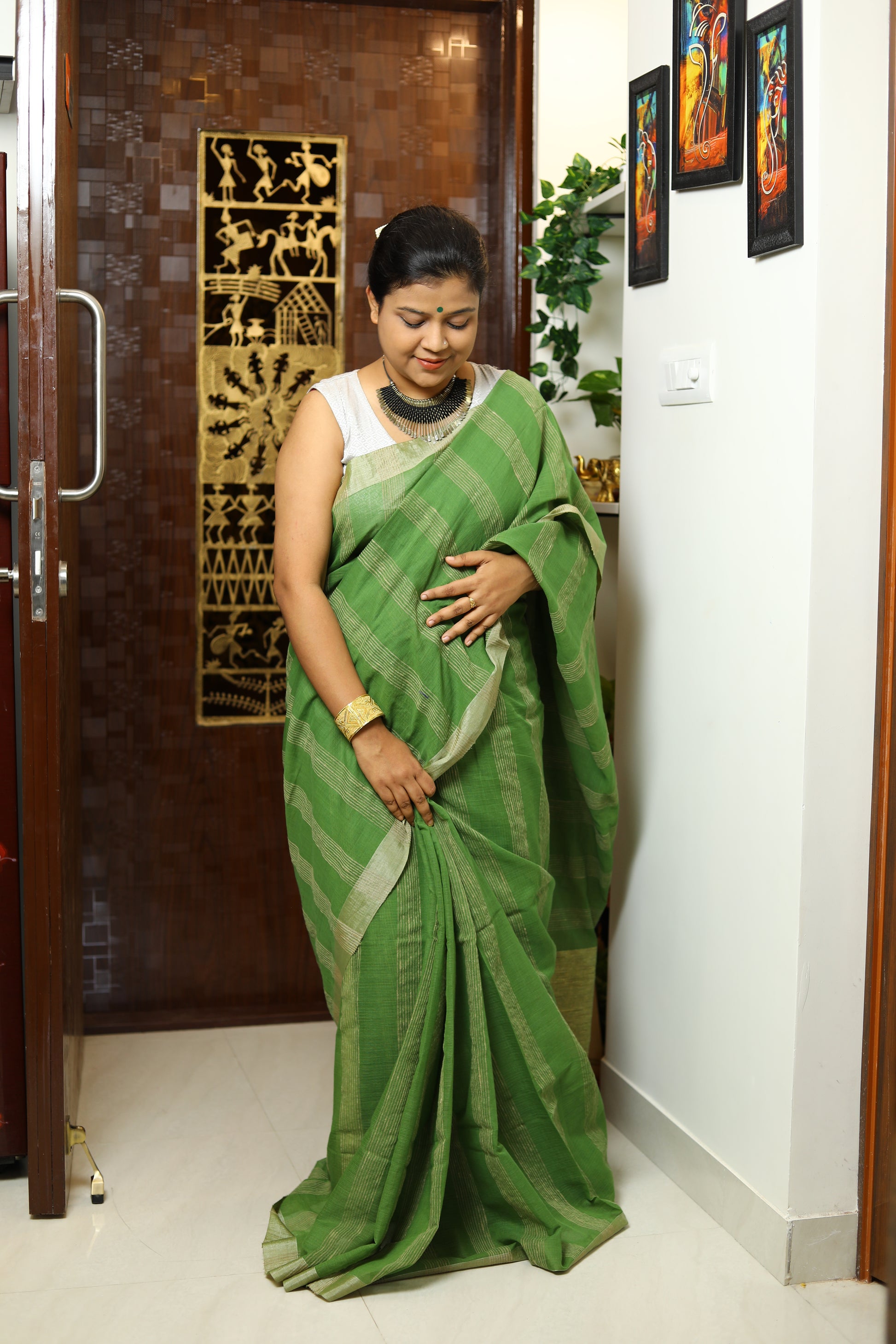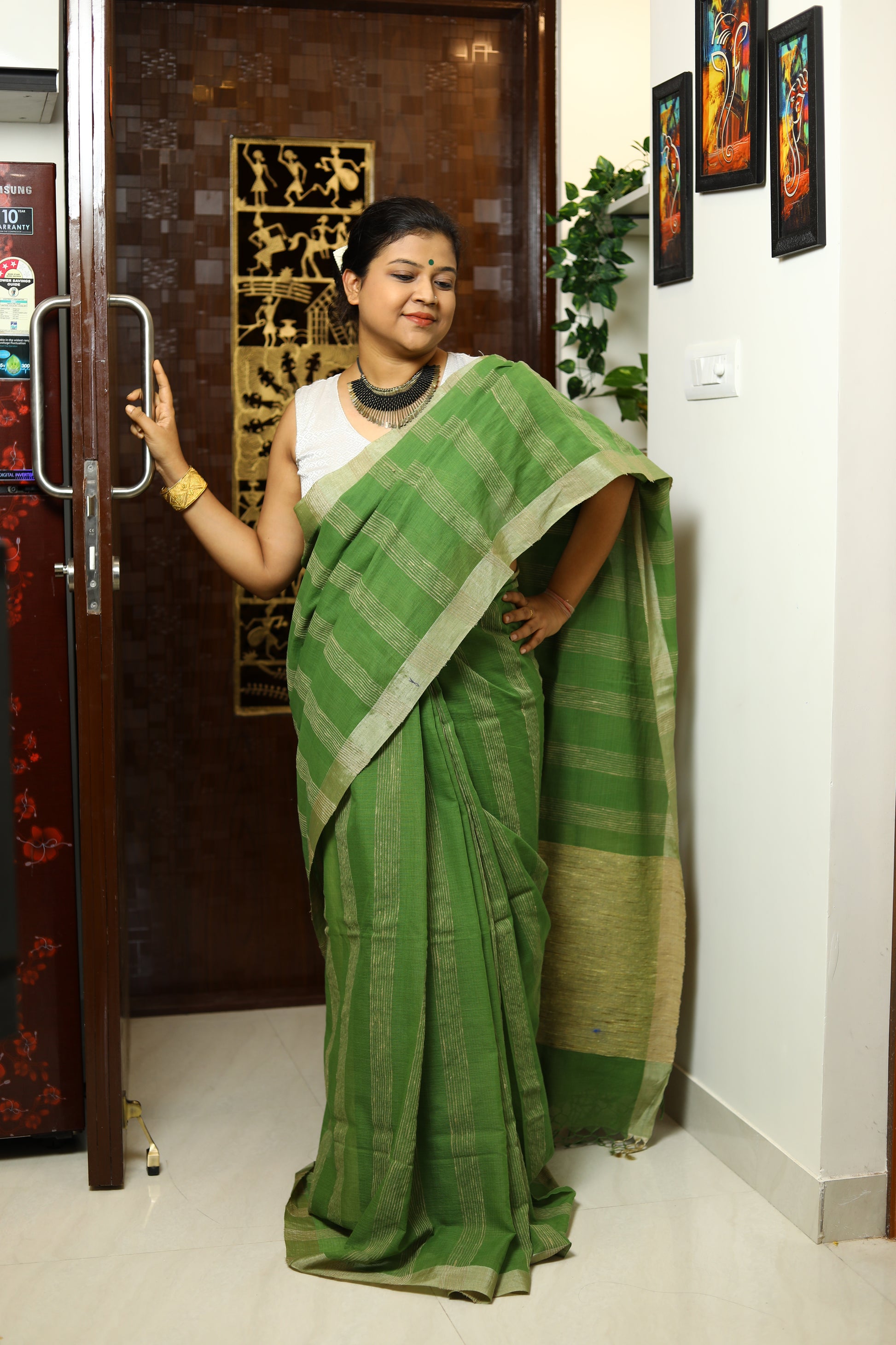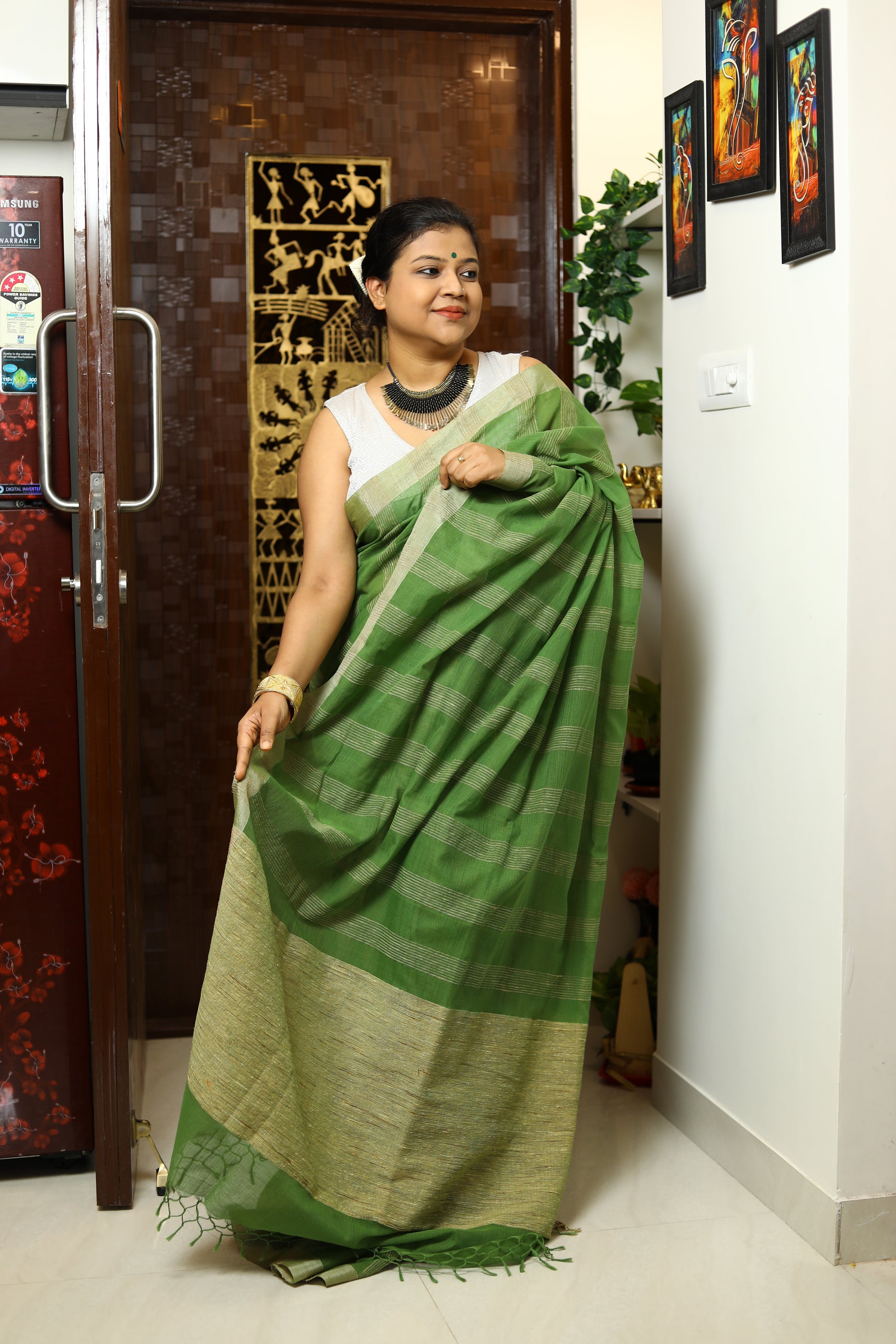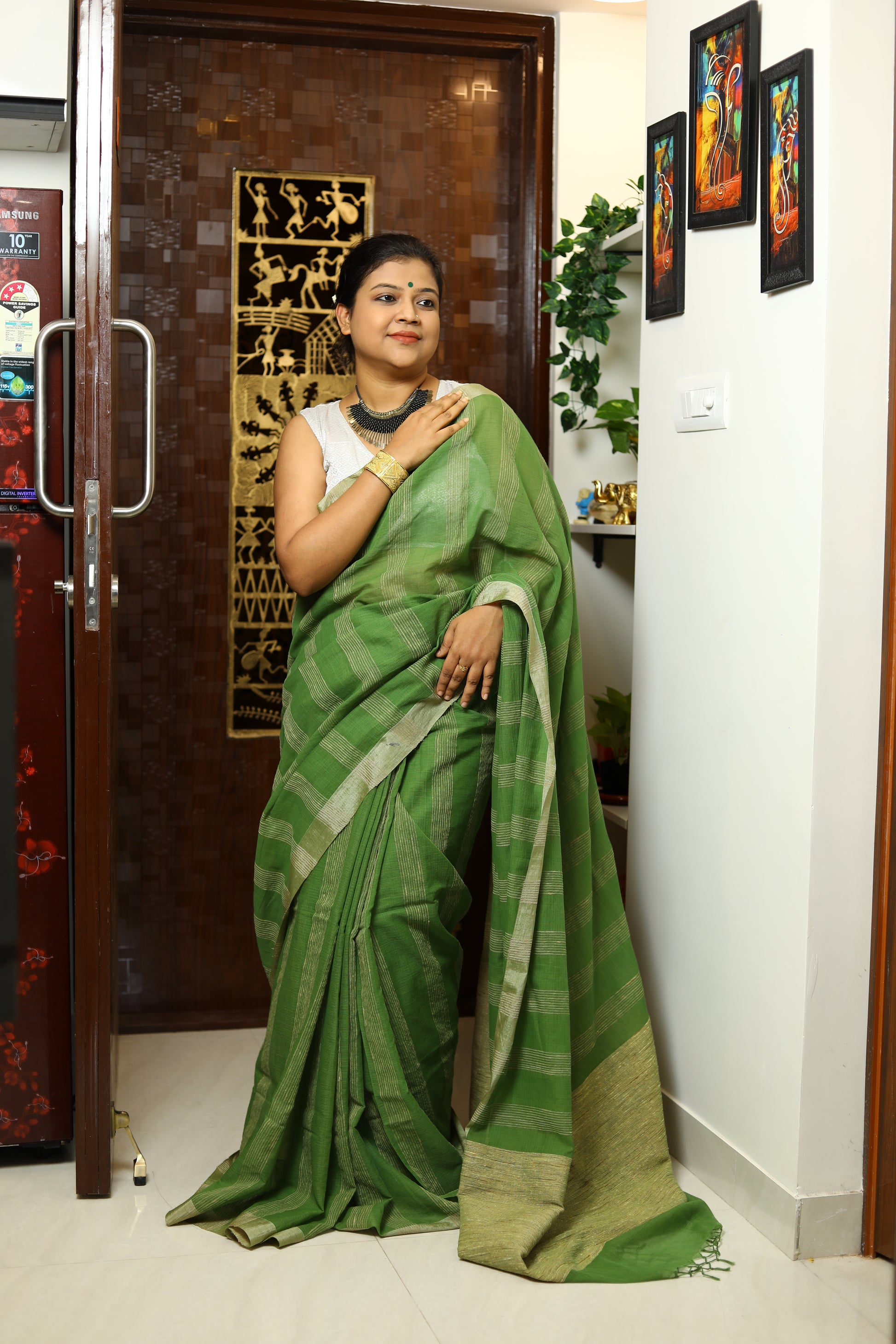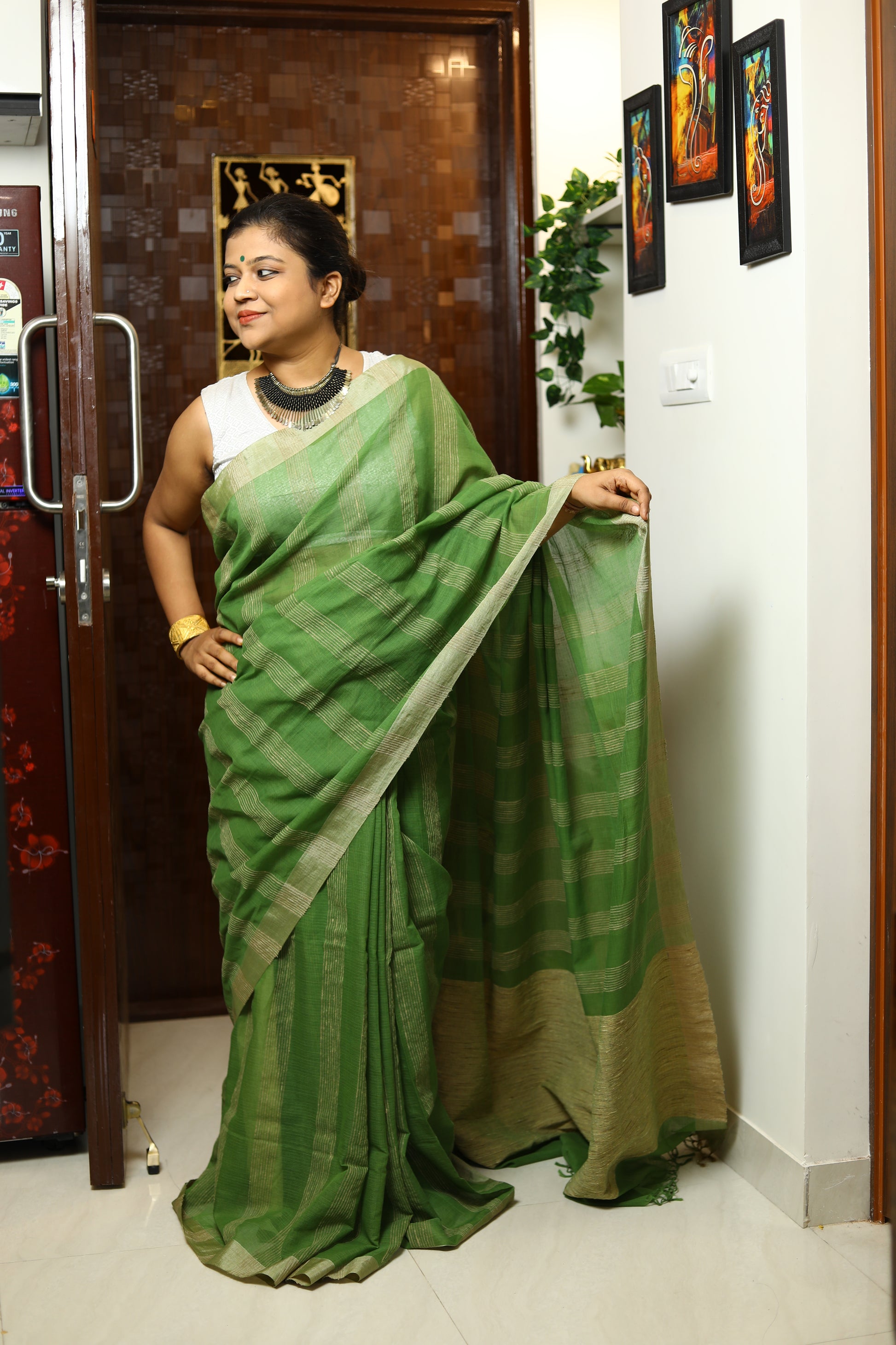 Available in a palette of serene colors, this saree embodies a sense of calm and grace, making it ideal for the modern woman who appreciates understated sophistication. Easy to drape and comfortable to wear, it offers versatility for various settings, from casual gatherings to more formal events. With its blend of heritage and contemporary style, this saree is a beautiful addition to any wardrobe, perfect for those who value elegance in simplicity.