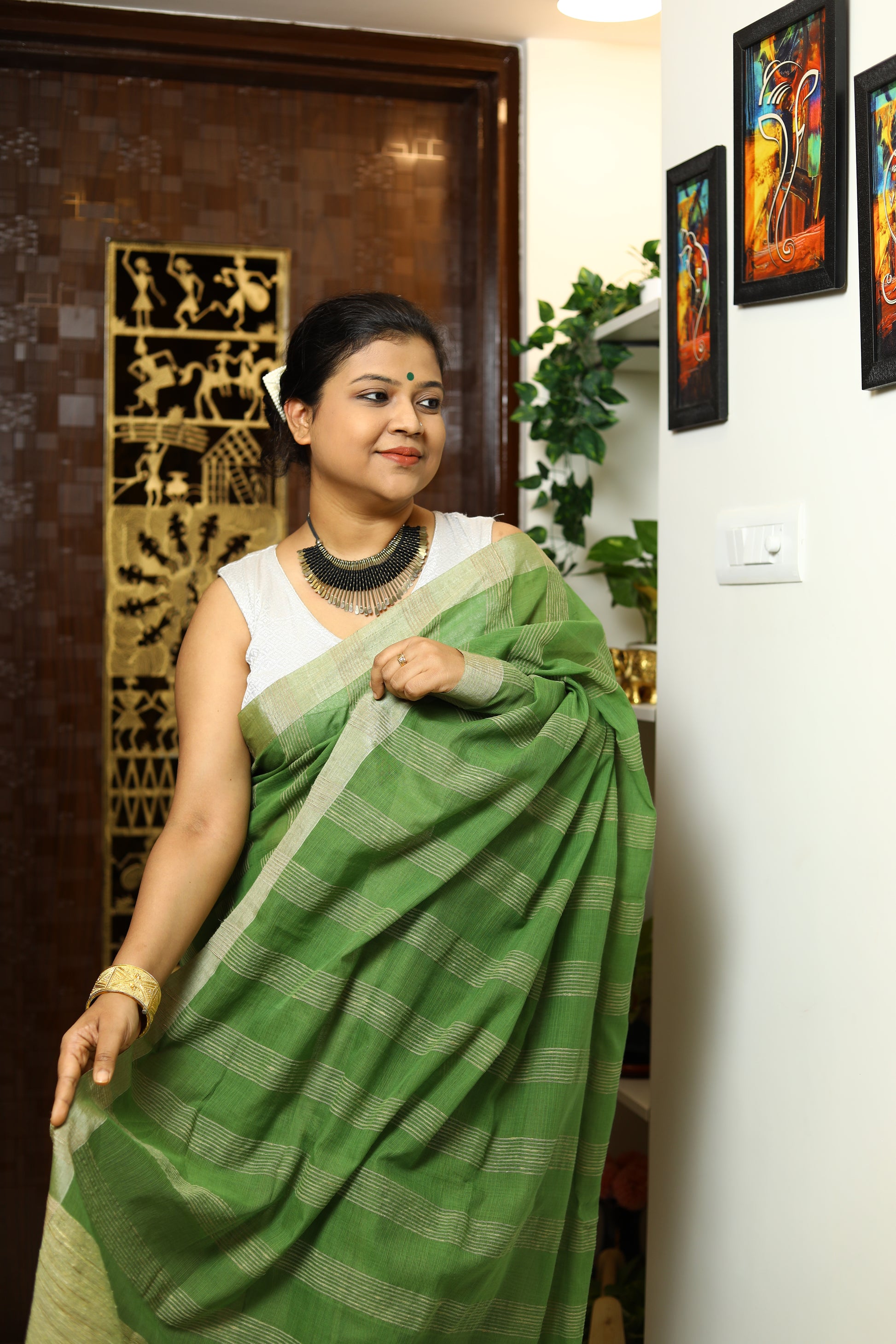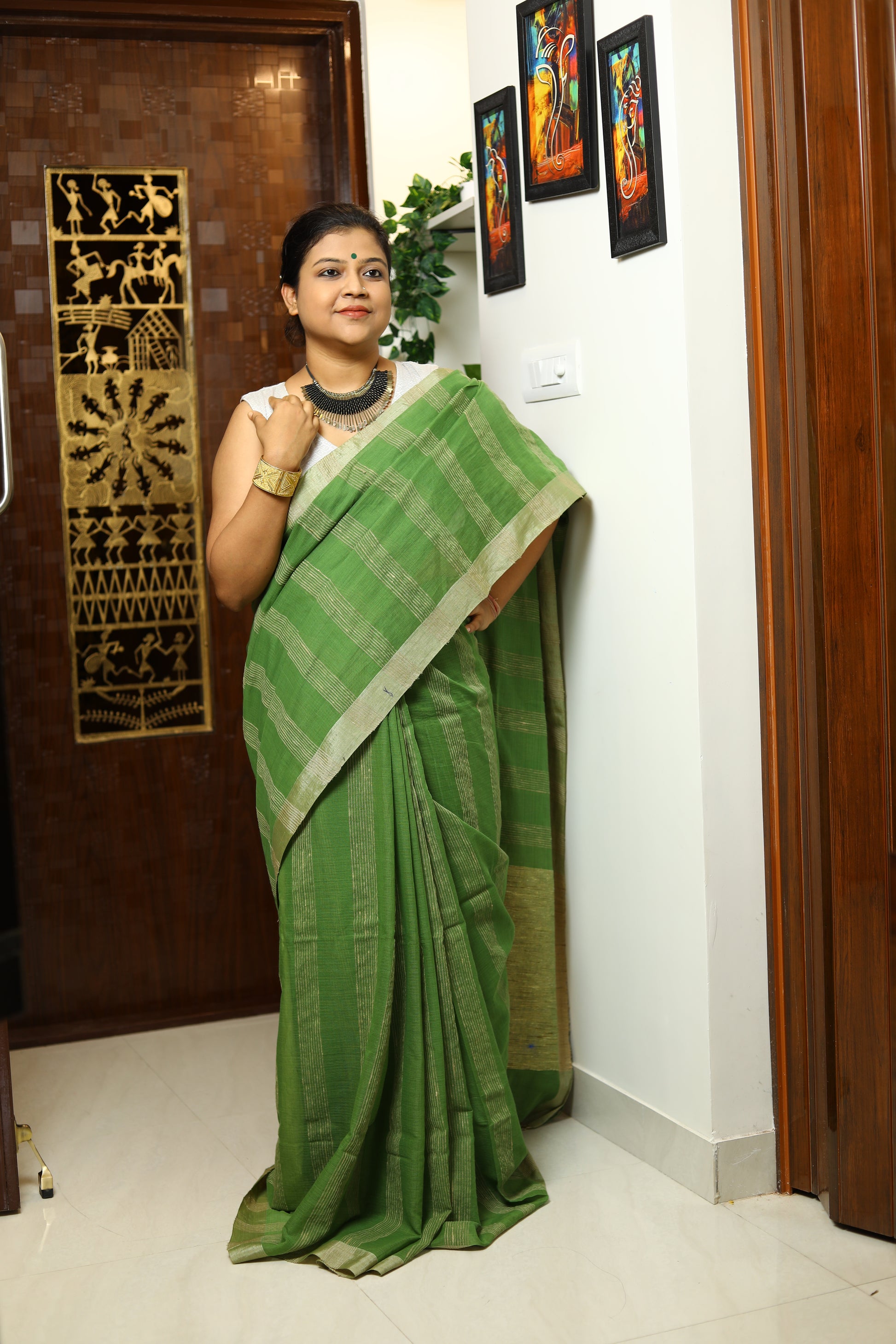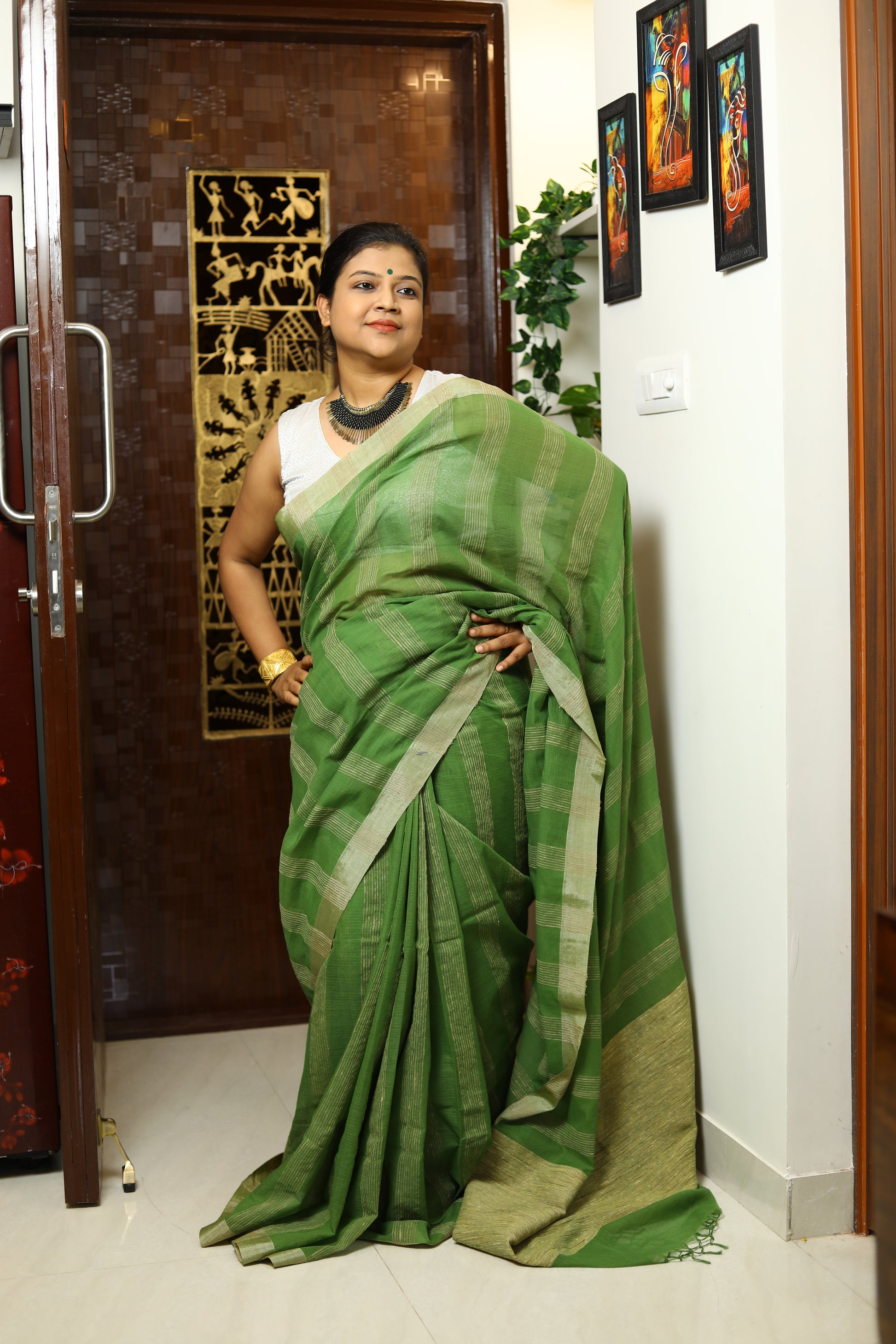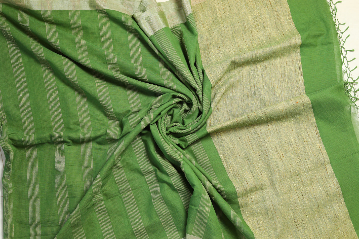 The tussar-bordered pure cotton handloomed saree with jute work on the pallu is a testament to artisanal craftsmanship and timeless elegance. This saree combines the softness of cotton with the rich texture of tussar silk, creating a beautiful contrast that enhances its appeal. The subtle yet sophisticated tussar border adds a touch of luxury, making it perfect for both everyday wear and special occasions.