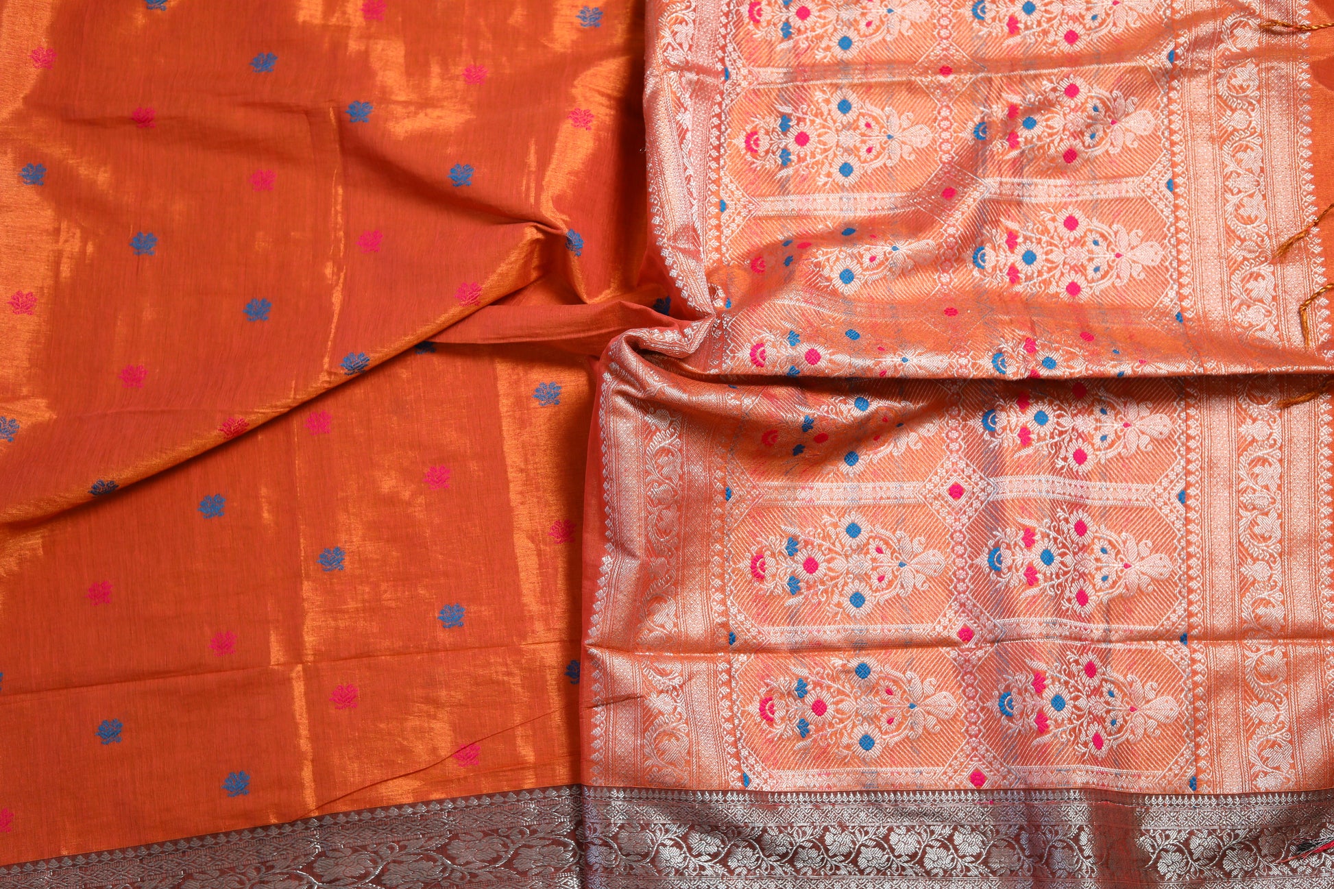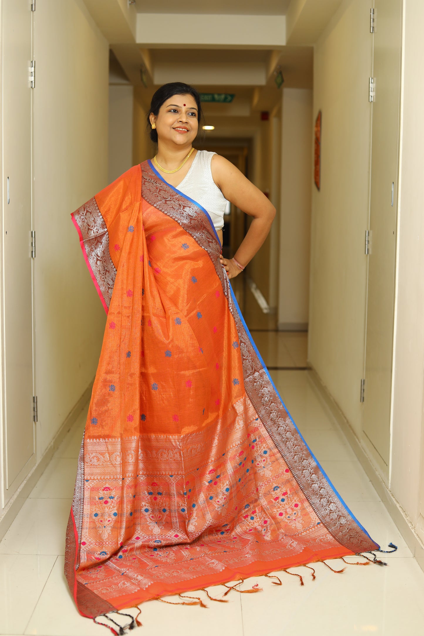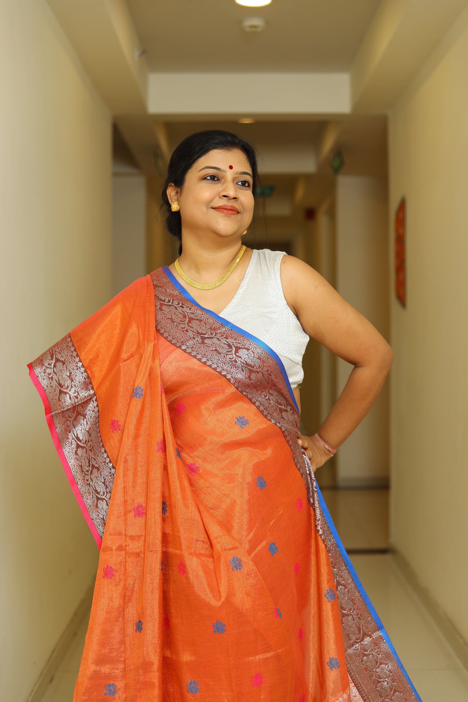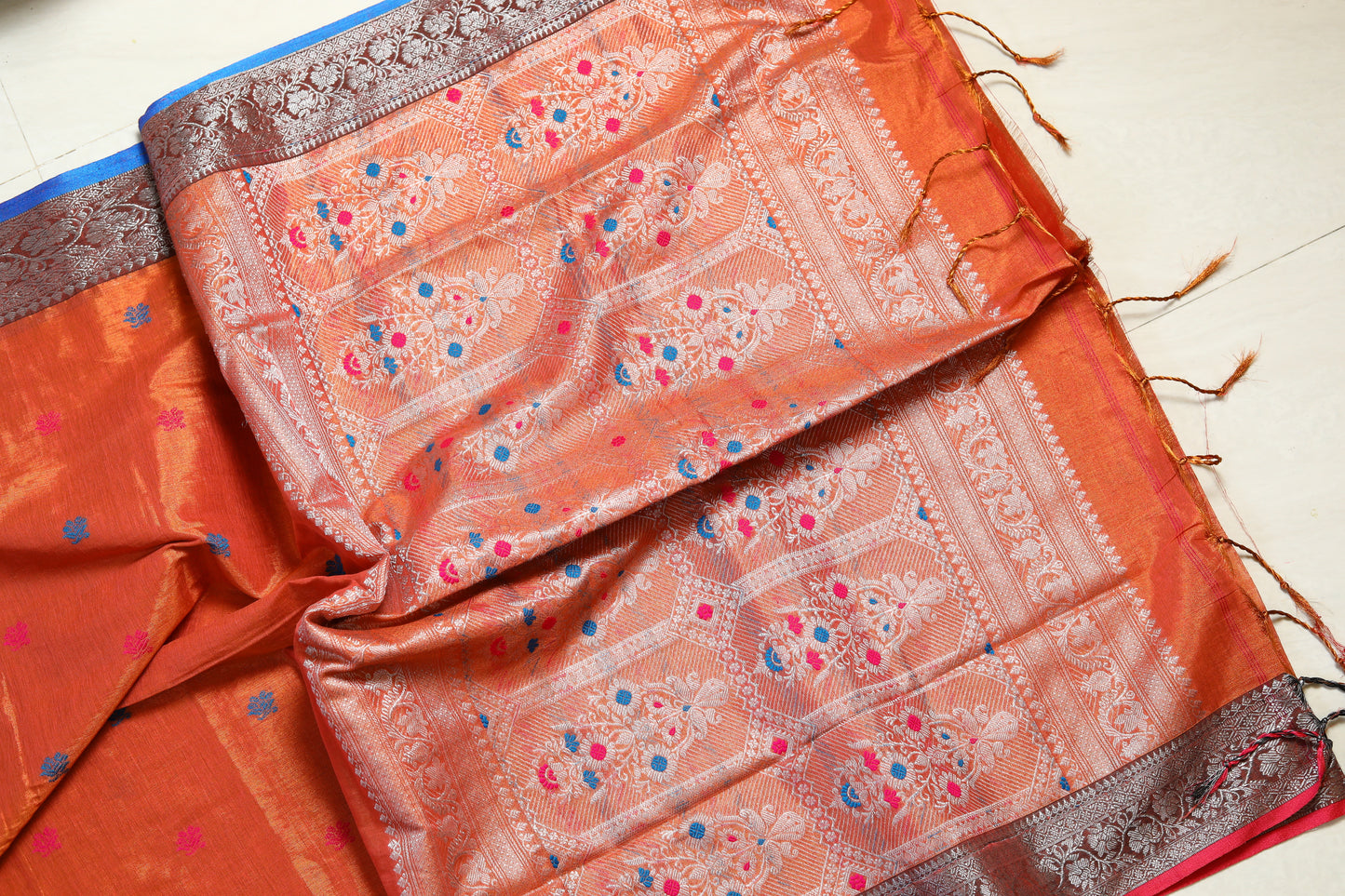 Embrace the spirit of the festive season with our stunning tissue linen Benarasi saree. This exquisite piece combines the lightweight elegance of tissue linen with the rich heritage of Benarasi weaving, making it a perfect choice for celebrations. Adorned with intricate designs and a lustrous sheen, the saree drapes beautifully, enhancing your natural grace. Ideal for festive gatherings, family celebrations, or traditional events, this saree offers comfort without compromising on style. Elevate your festive wardrobe and make a statement with this timeless piece that reflects artistry and tradition. Celebrate in style and let your elegance shine!