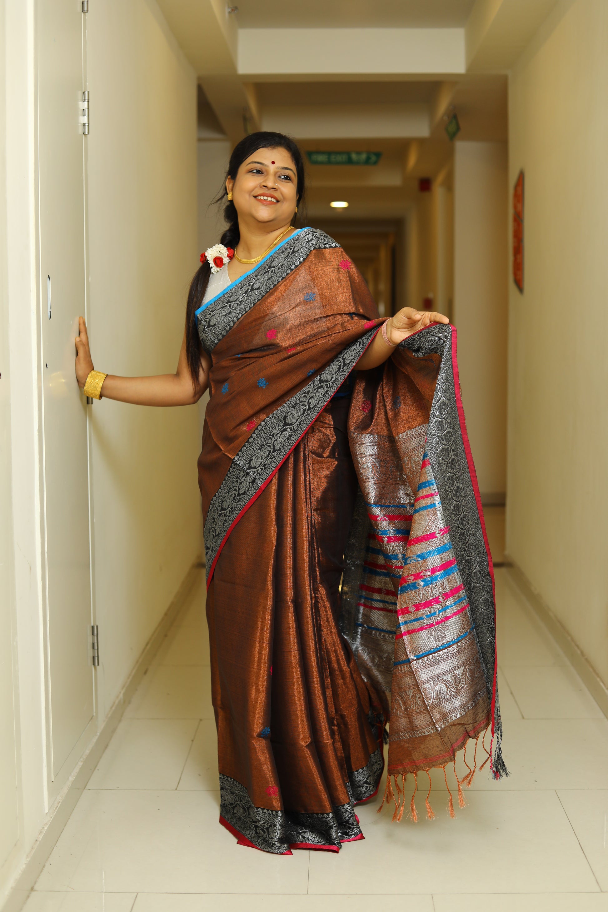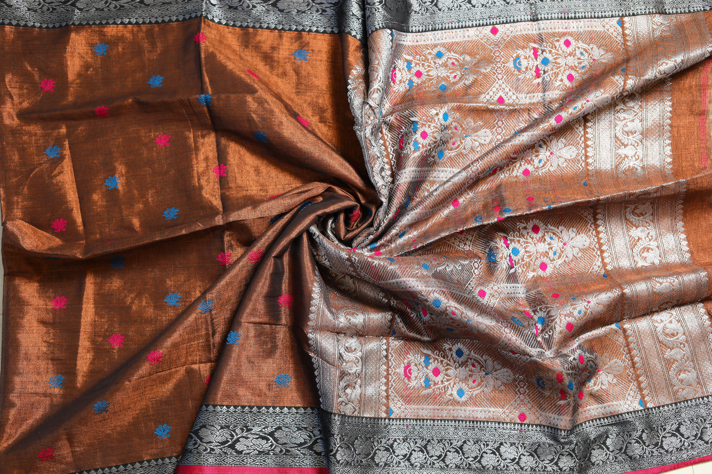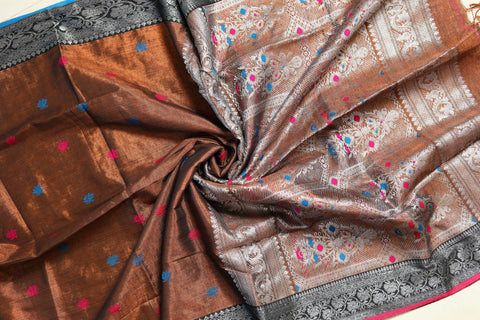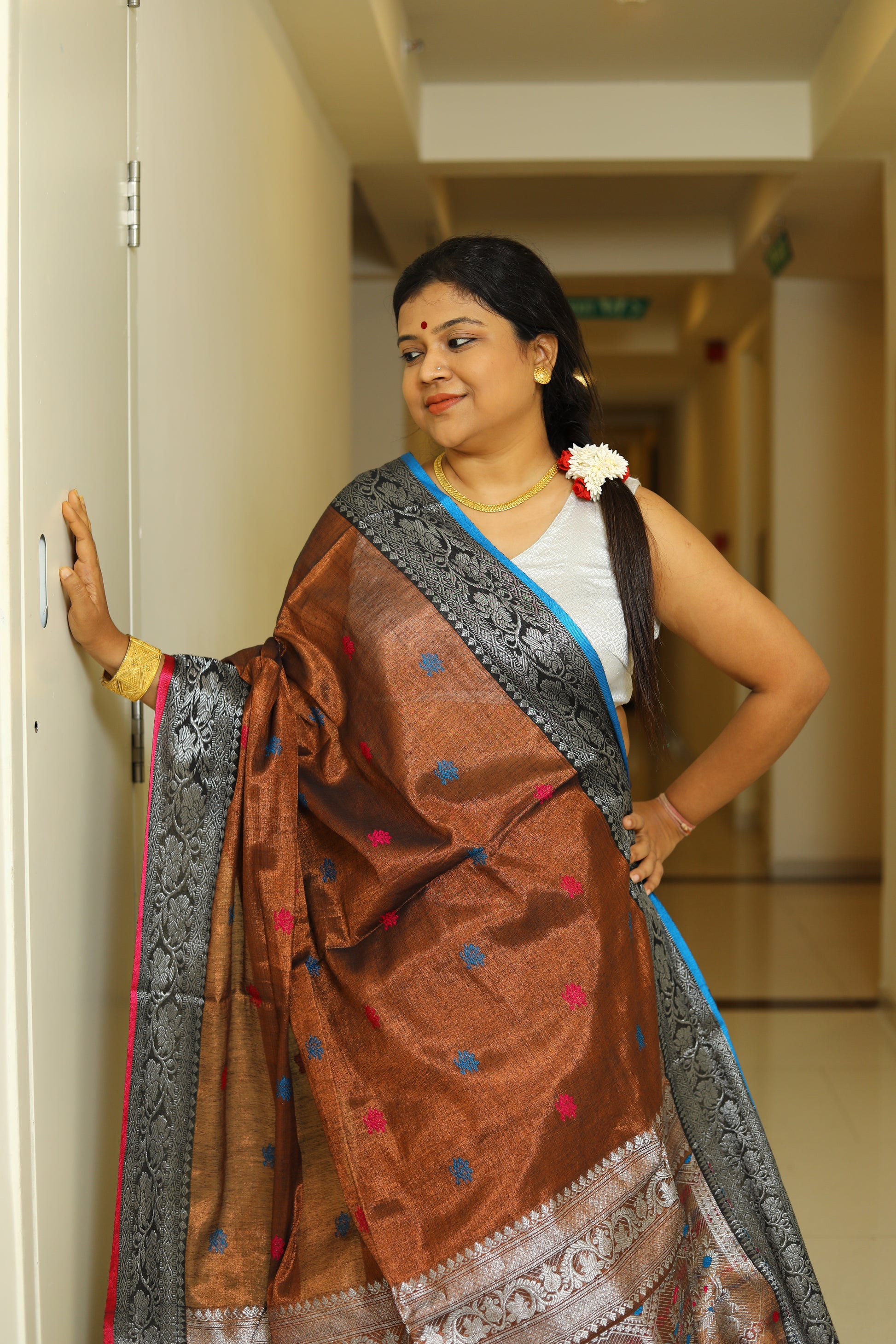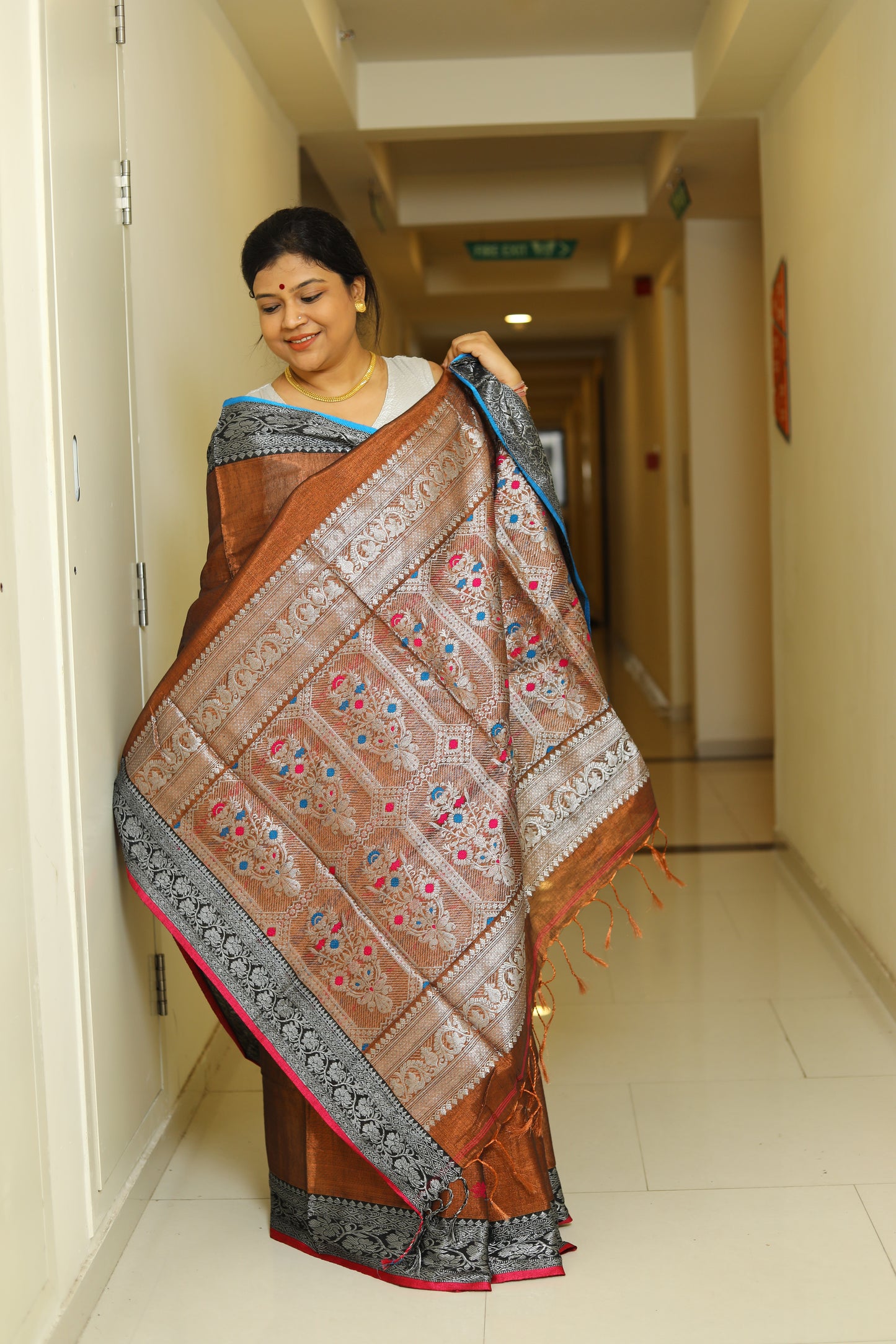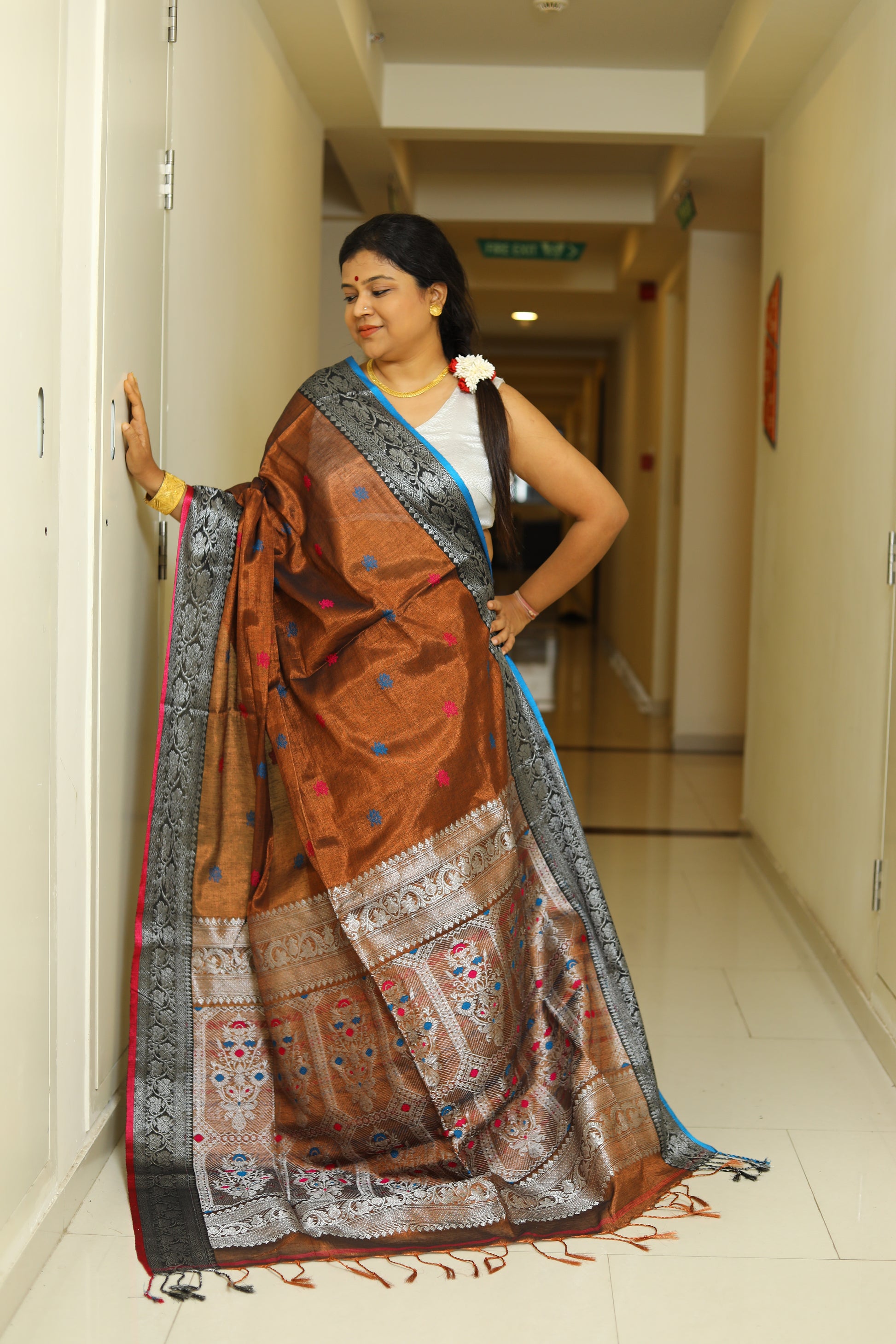 Embrace the spirit of the festive season with our stunning tissue linen Benarasi saree. This exquisite piece combines the lightweight elegance of tissue linen with the rich heritage of Benarasi weaving, making it a perfect choice for celebrations. Adorned with intricate designs and a lustrous sheen, the saree drapes beautifully, enhancing your natural grace. Ideal for festive gatherings, family celebrations, or traditional events, this saree offers comfort without compromising on style. Elevate your festive wardrobe and make a statement with this timeless piece that reflects artistry and tradition. Celebrate in style and let your elegance shine!