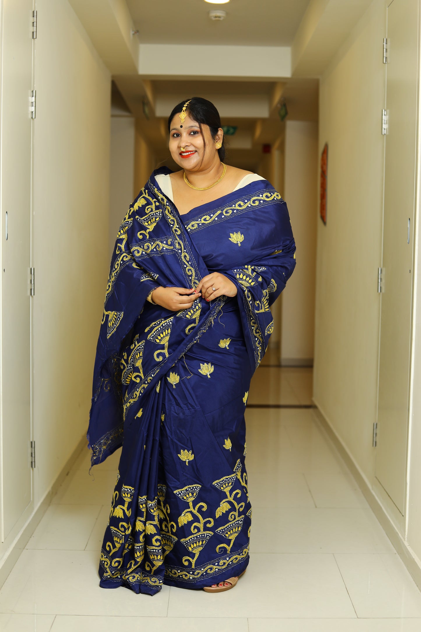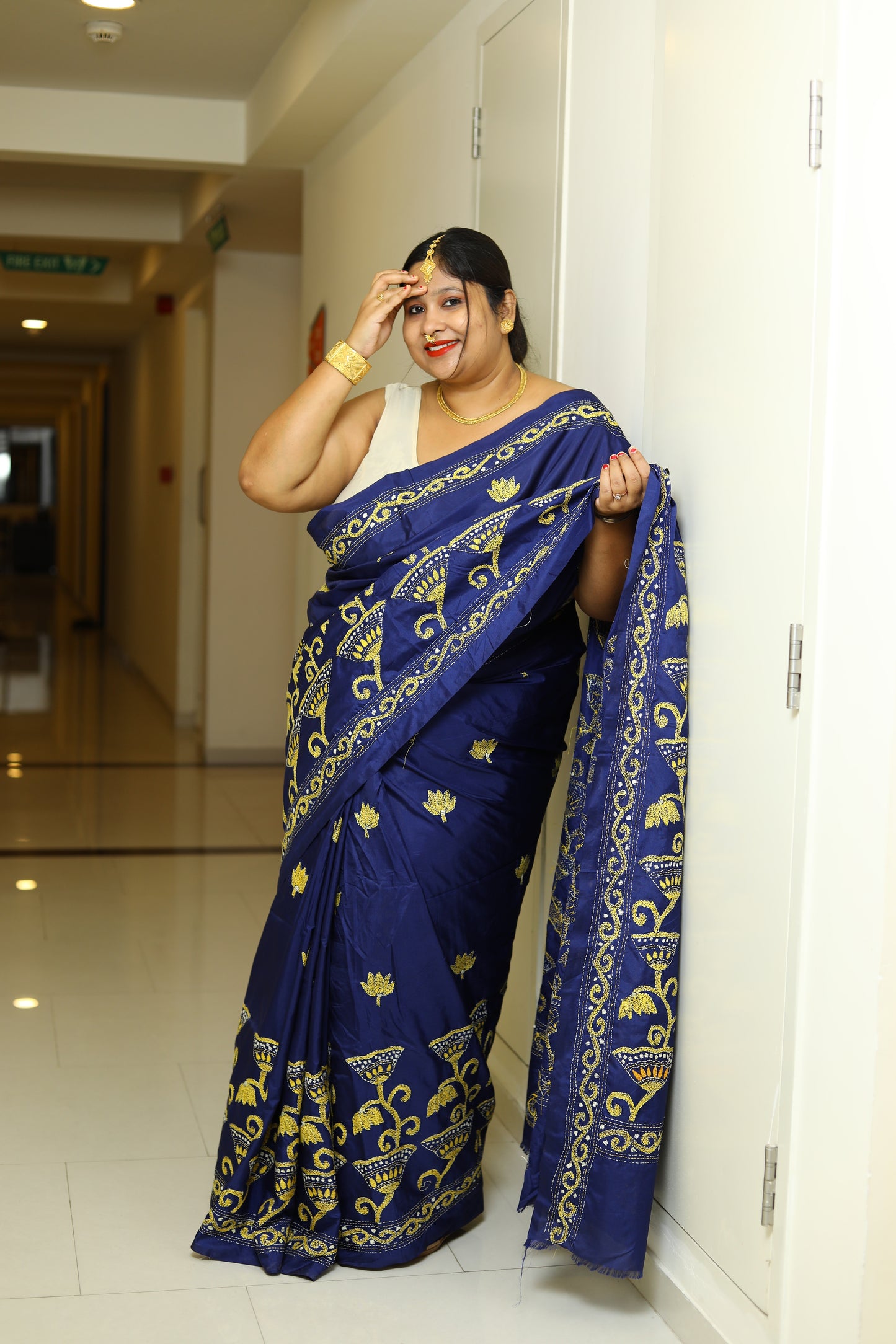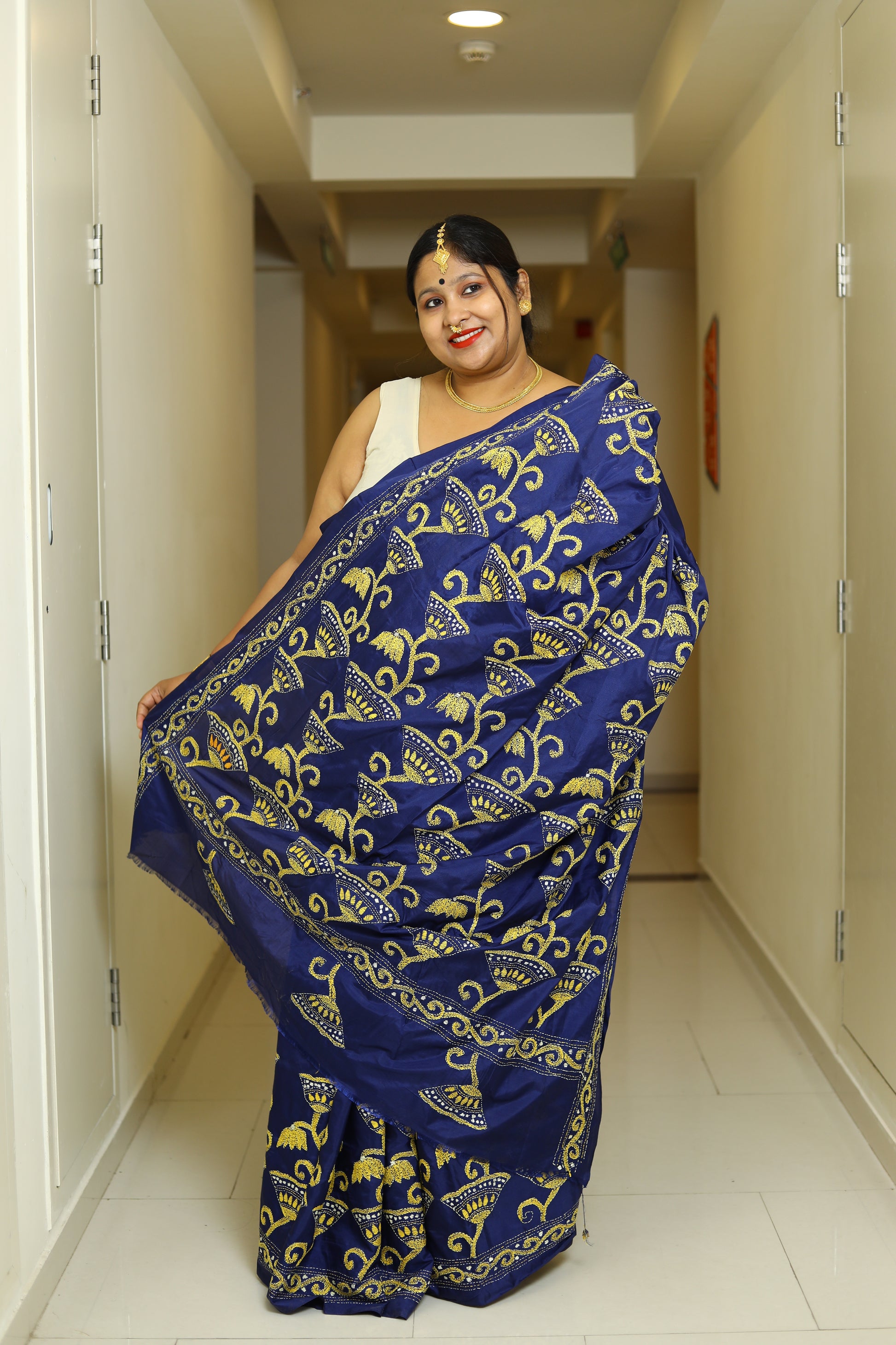 Kantha sarees are a traditional form of hand-embroidered sarees, originating from Bengal. Known for their intricate stitching, they feature beautiful motifs inspired by nature, daily life, and folklore. The embroidery is done using simple running stitches, often layered, creating unique textures and designs. Each Kantha saree tells a story, making it a timeless symbol of artistic craftsmanship and cultural heritage.