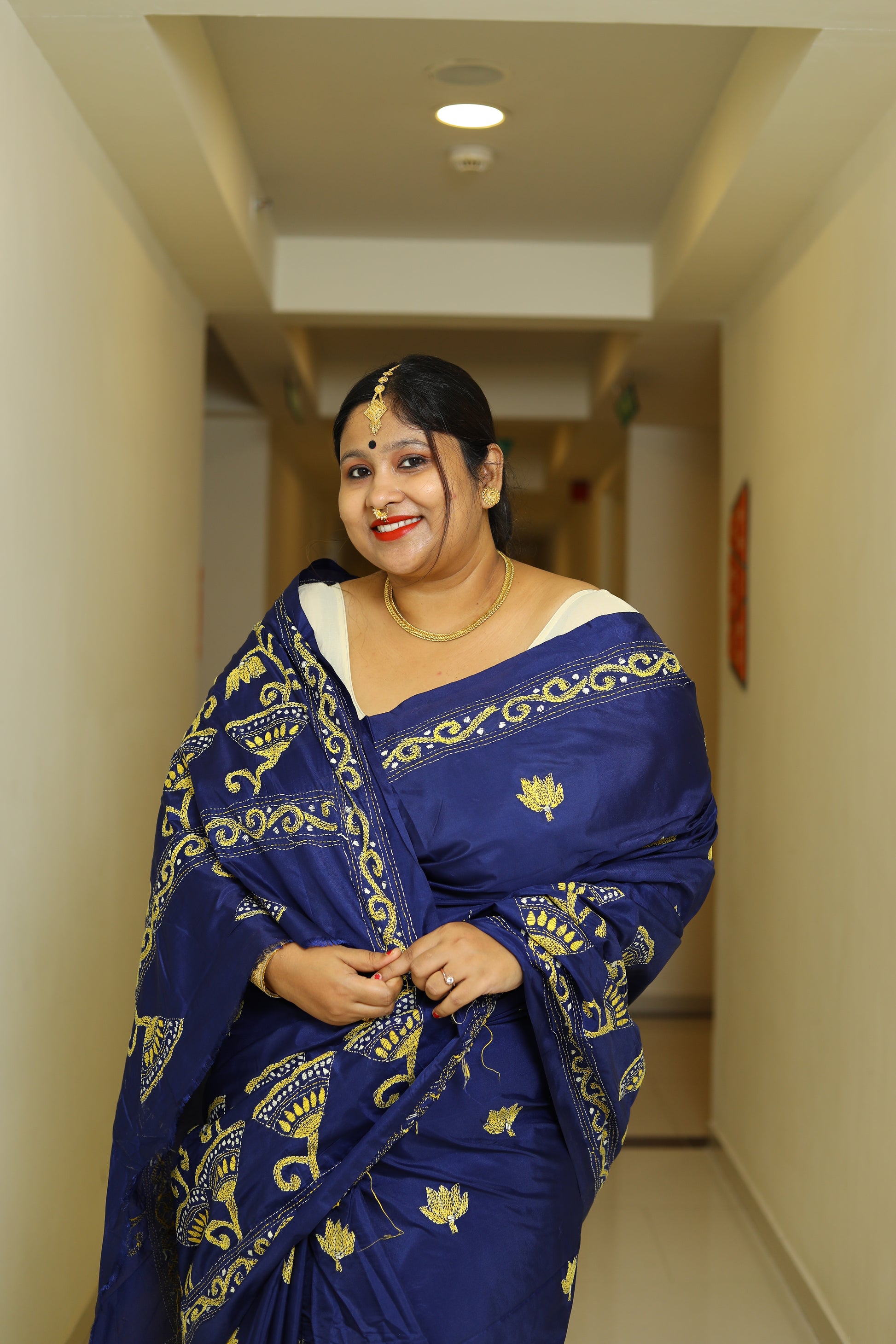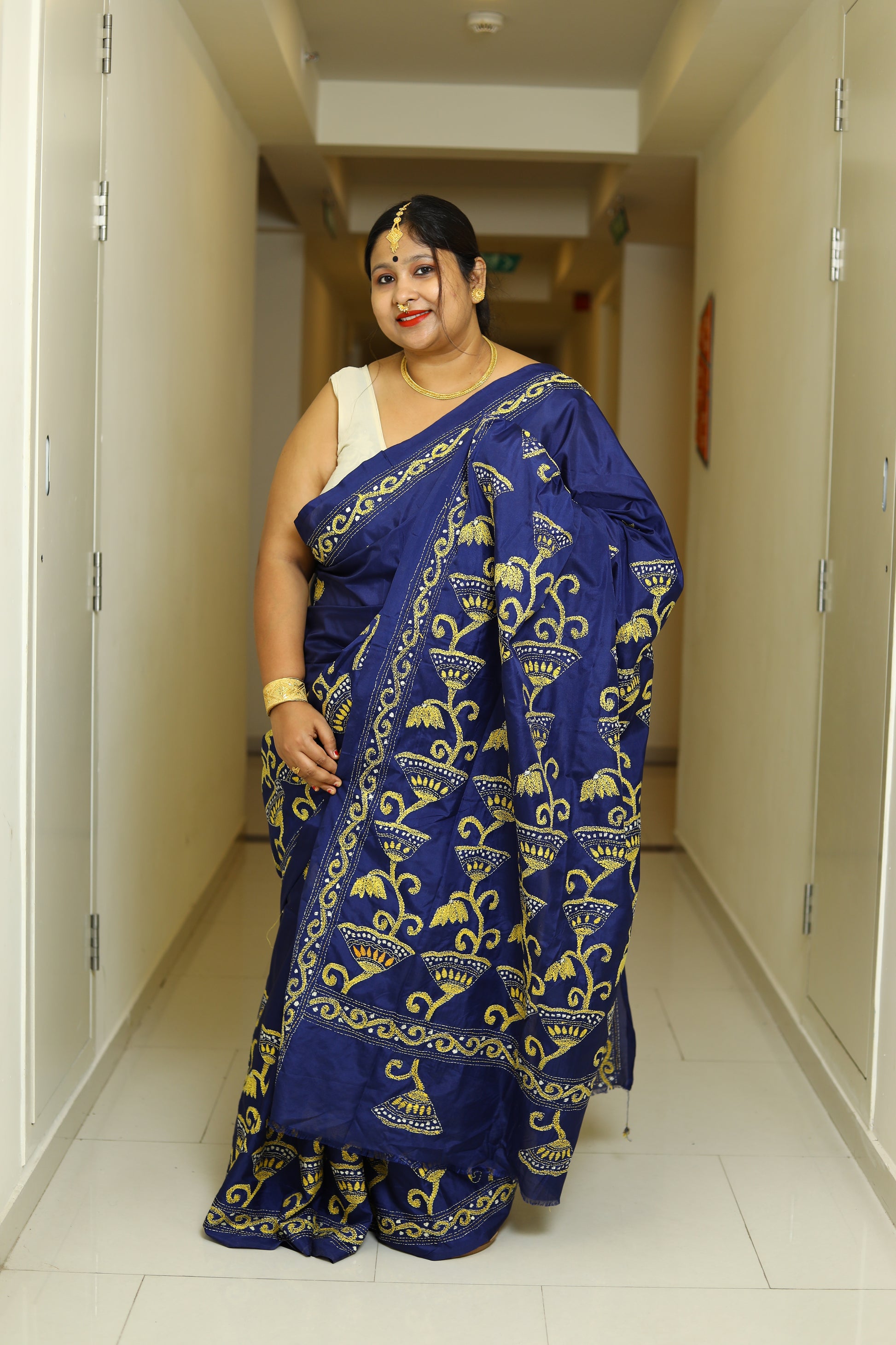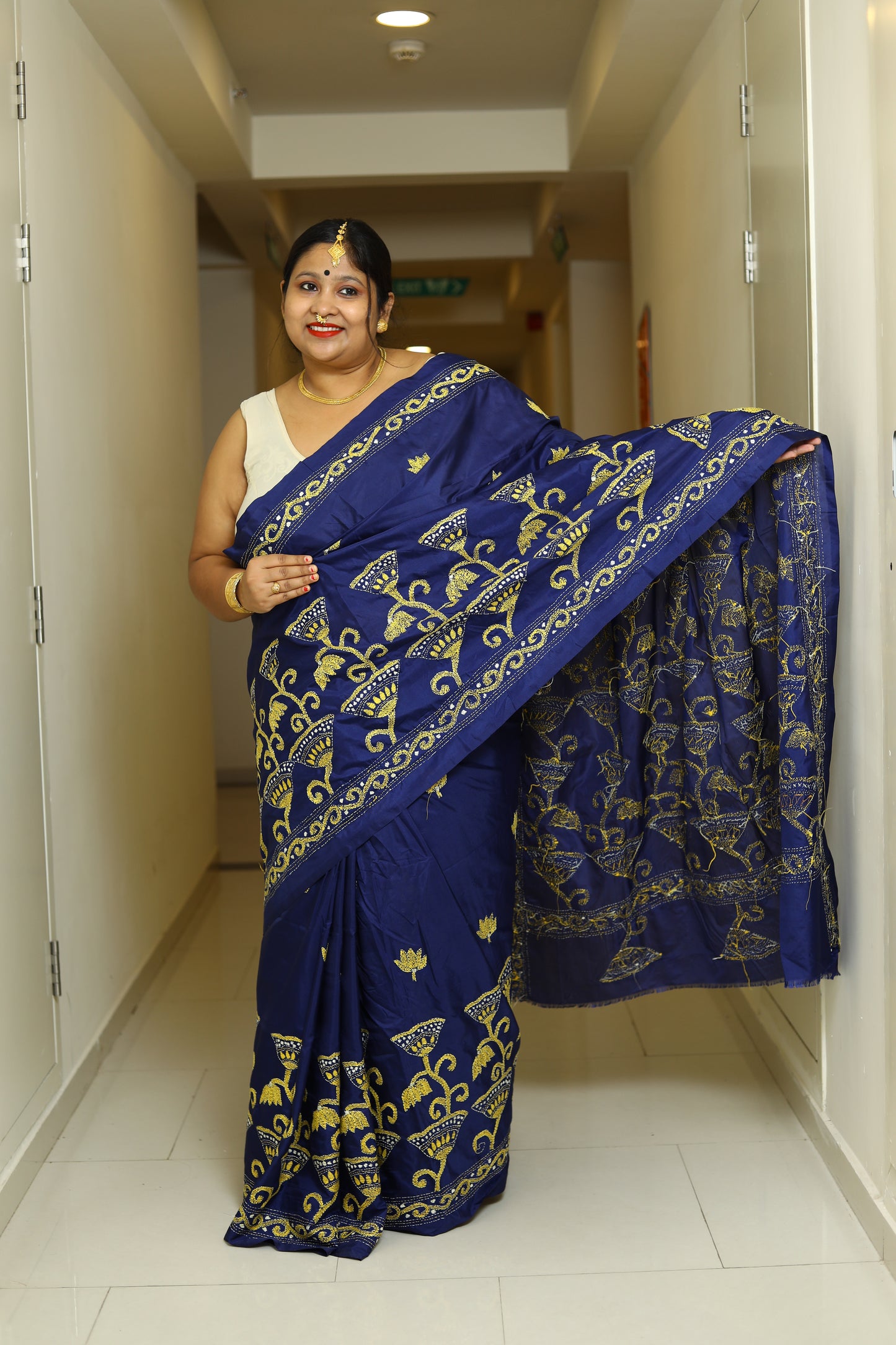 Kantha sarees are a traditional form of hand-embroidered sarees, originating from Bengal. Known for their intricate stitching, they feature beautiful motifs inspired by nature, daily life, and folklore. The embroidery is done using simple running stitches, often layered, creating unique textures and designs. Each Kantha saree tells a story, making it a timeless symbol of artistic craftsmanship and cultural heritage.