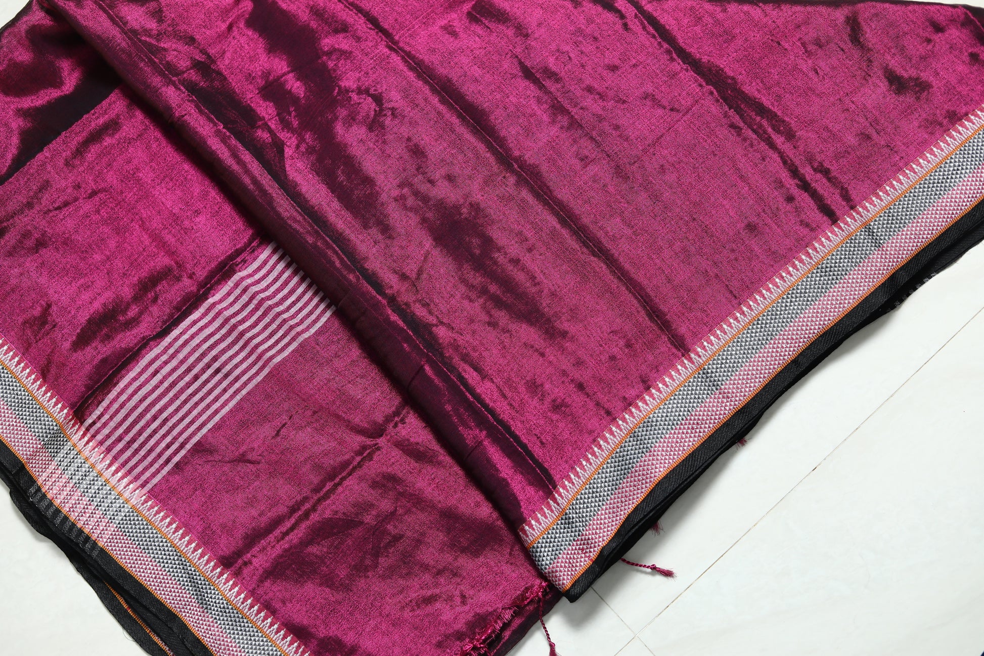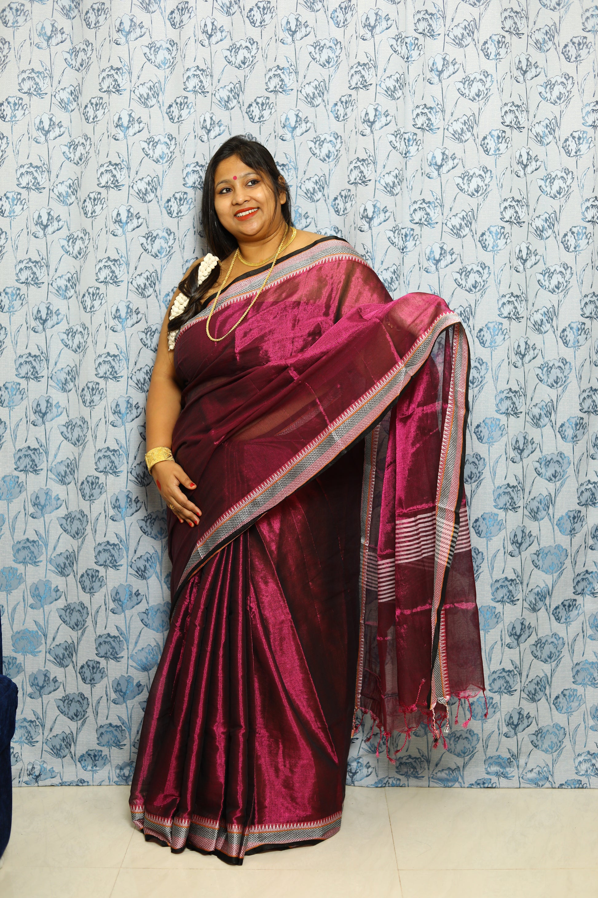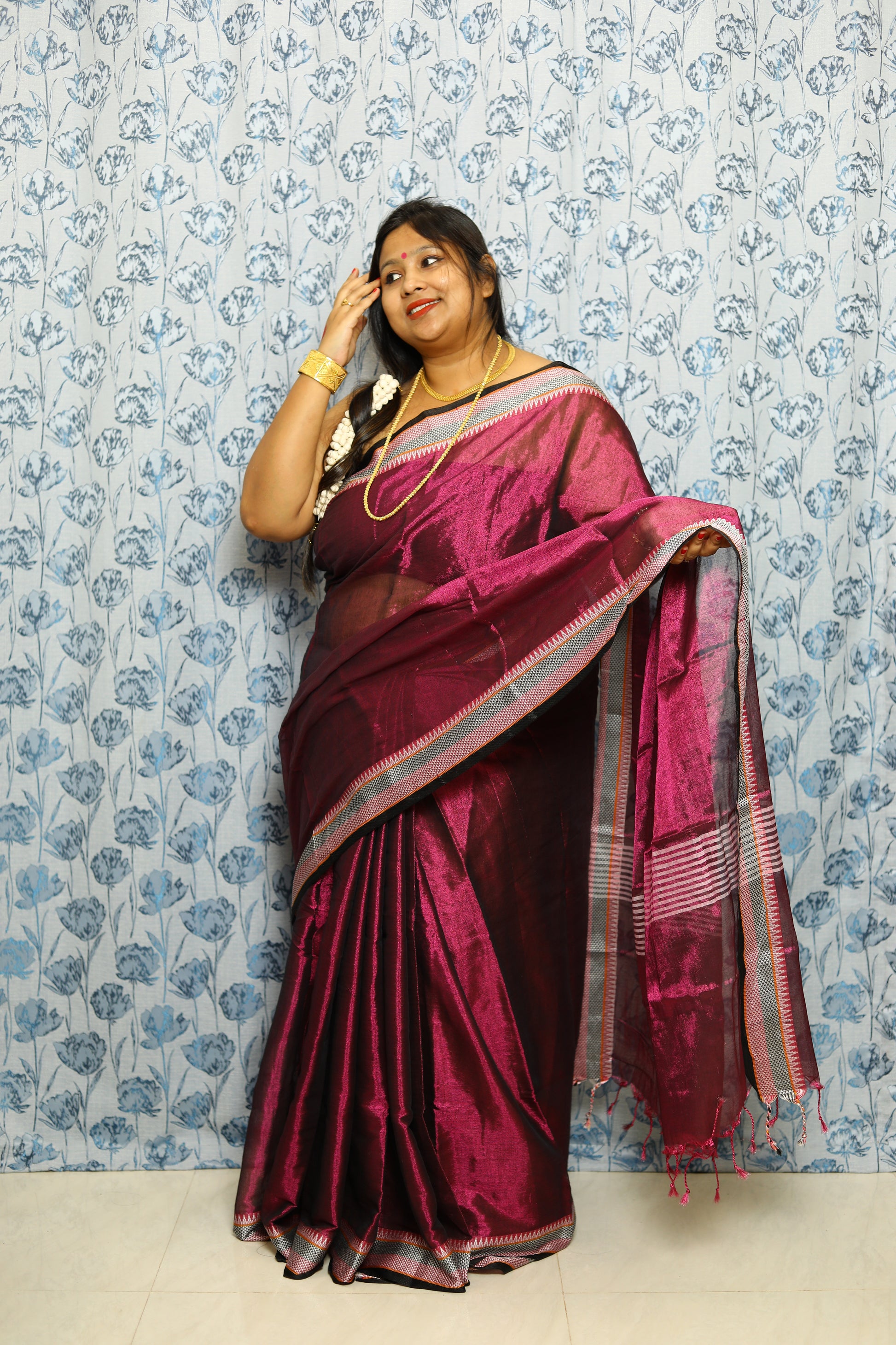 A stunning blend of elegance and comfort, crafted to make you shine on every occasion. This gorgeous saree features a delicate shimmer, while the linen base ensures a breathable, lightweight feel. Whether you're attending a festive celebration, a wedding, or a special event, this saree drapes effortlessly, offering both grace and ease. Its subtle sheen adds a touch of glamour, making it the perfect choice for those who seek a refined, timeless look.